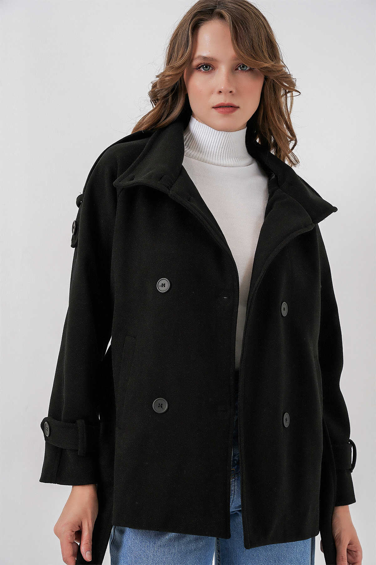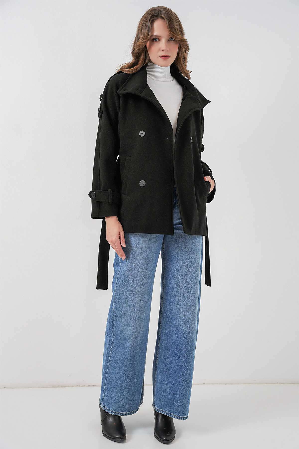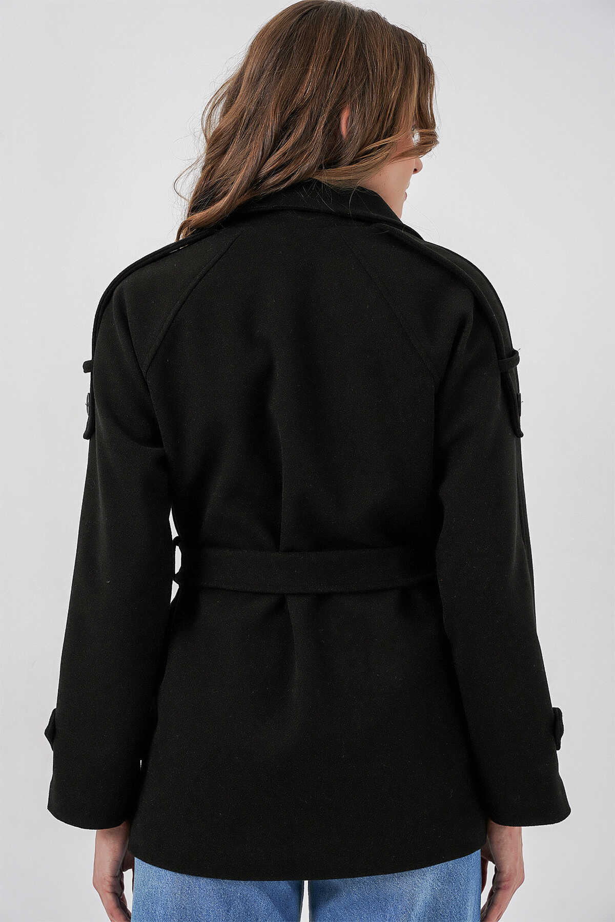 Kadın Kuşaklı Kaşe Kaban 9162 - Siyah - Kombin