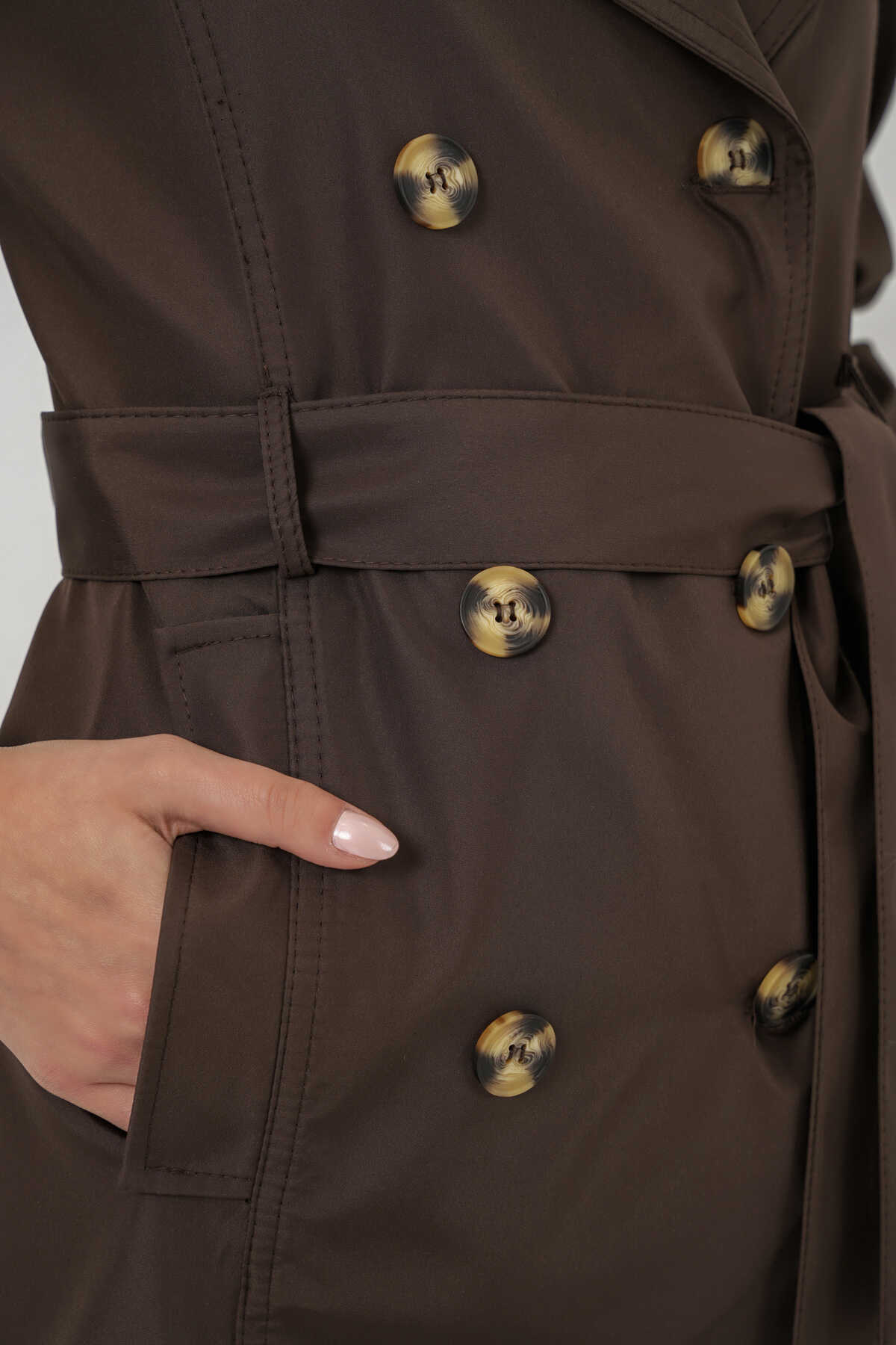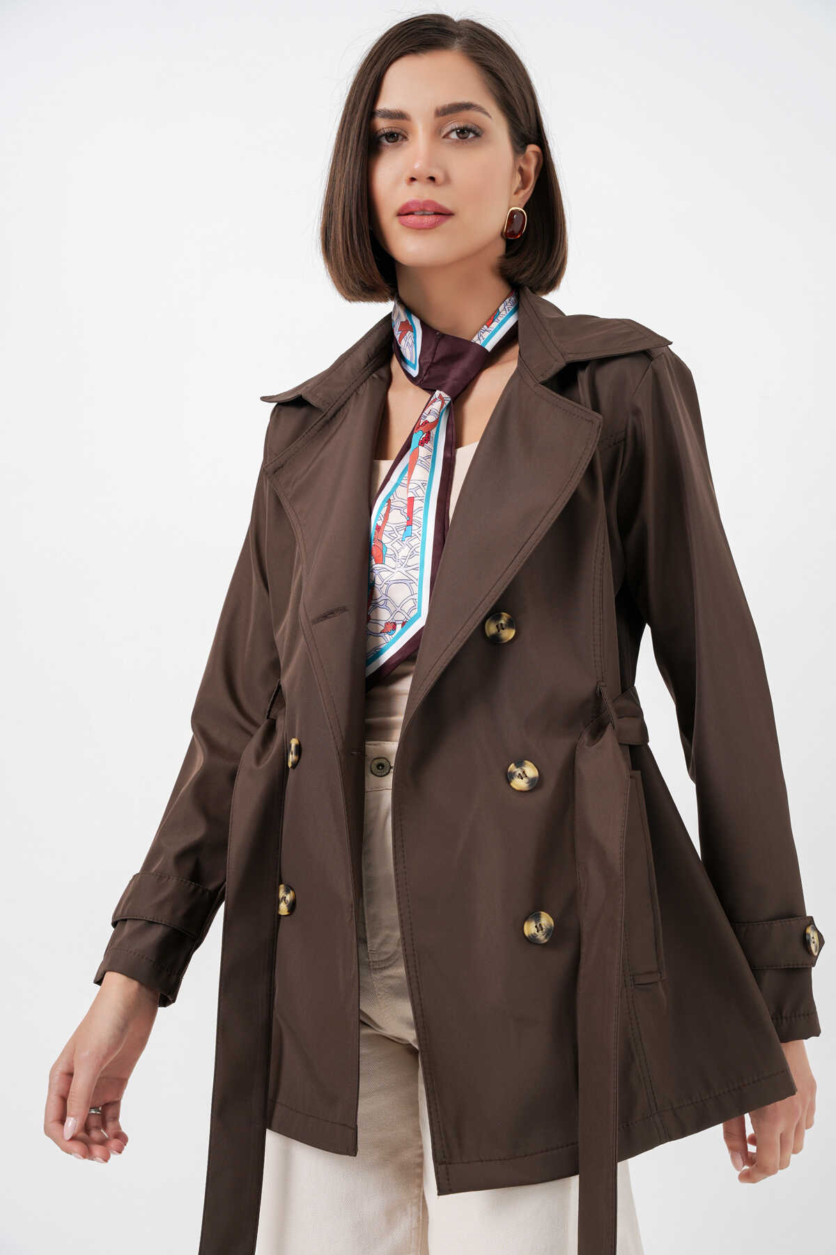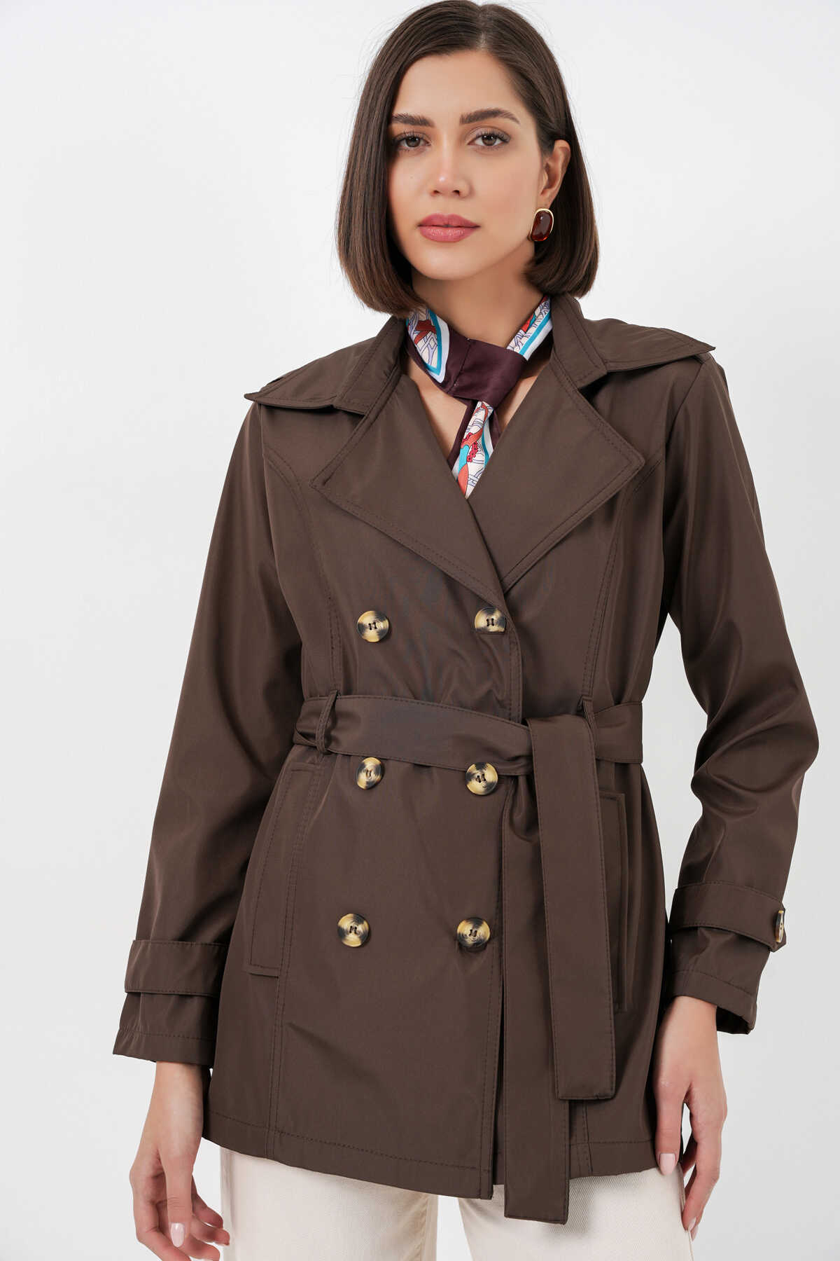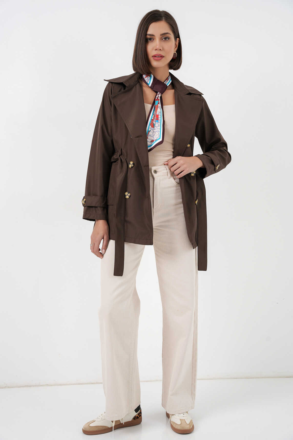 Kadın Kuşaklı Kısa Trençkot 5982 - Kahverengi - Kombin