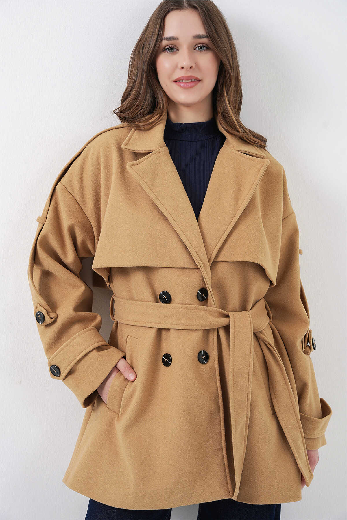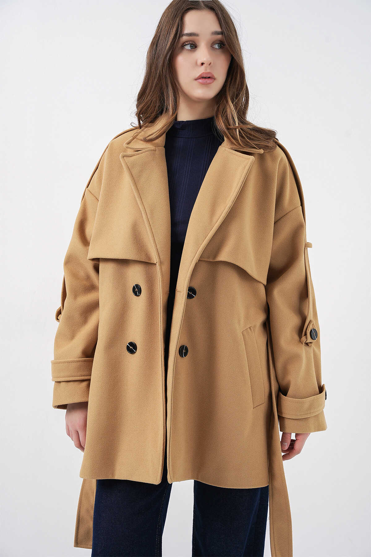 Kadın Kuşaklı Oversize Kaşe Kaban 9157 - Hardal