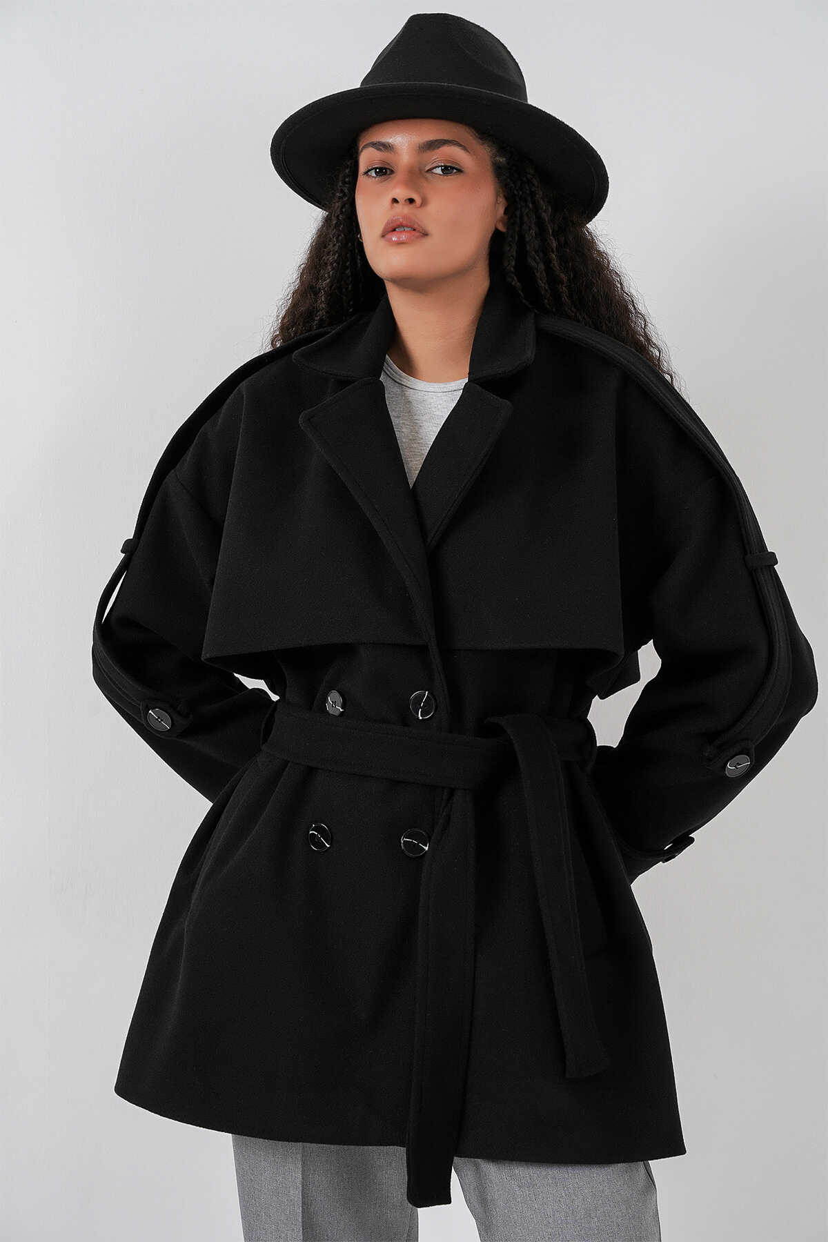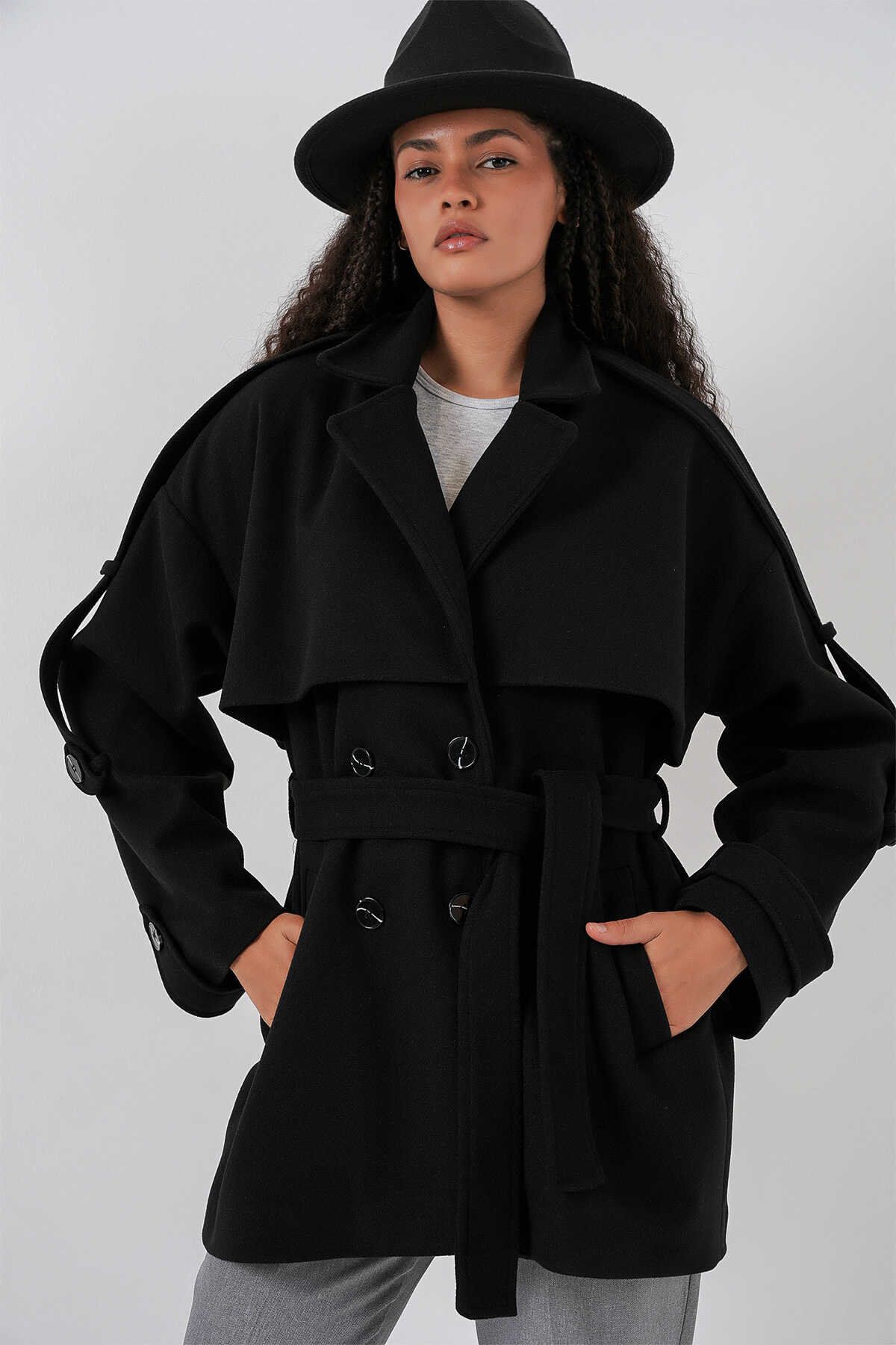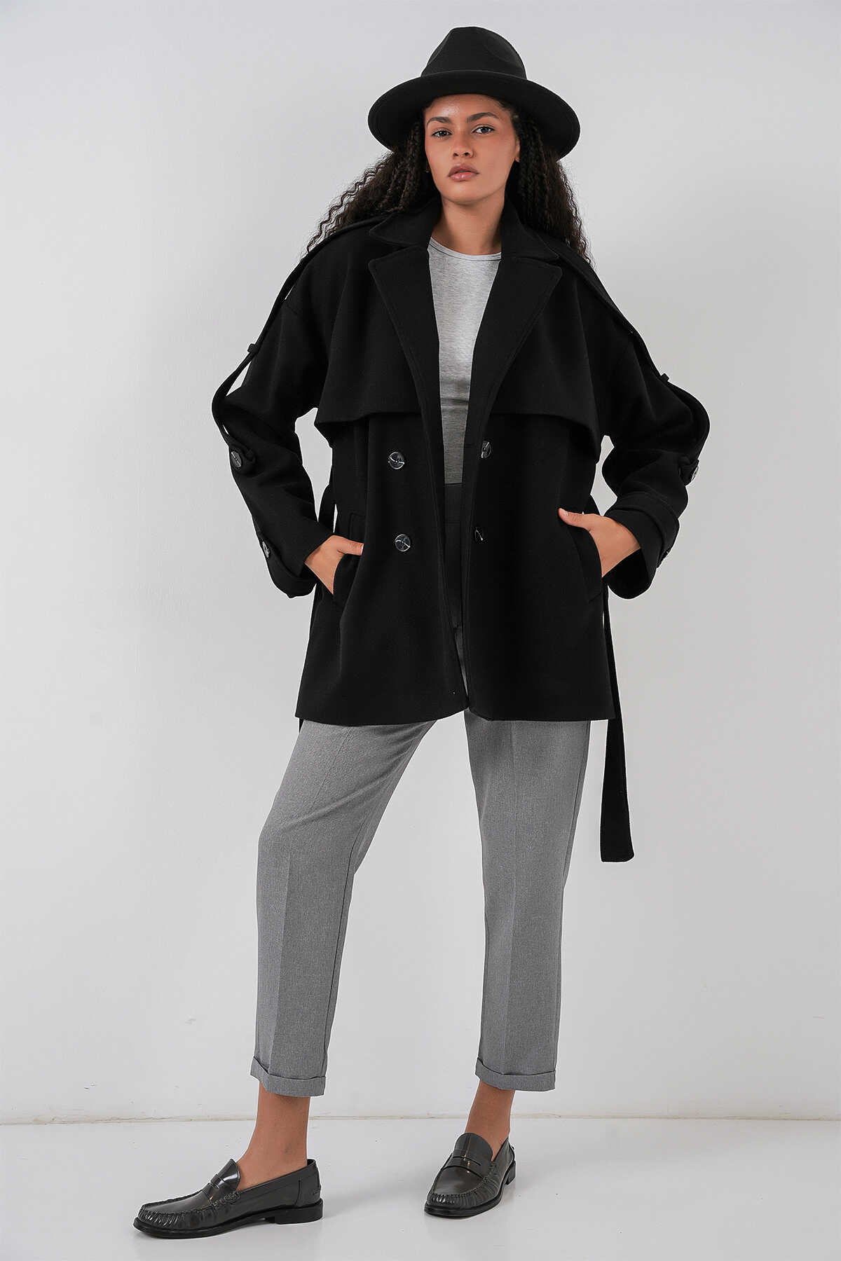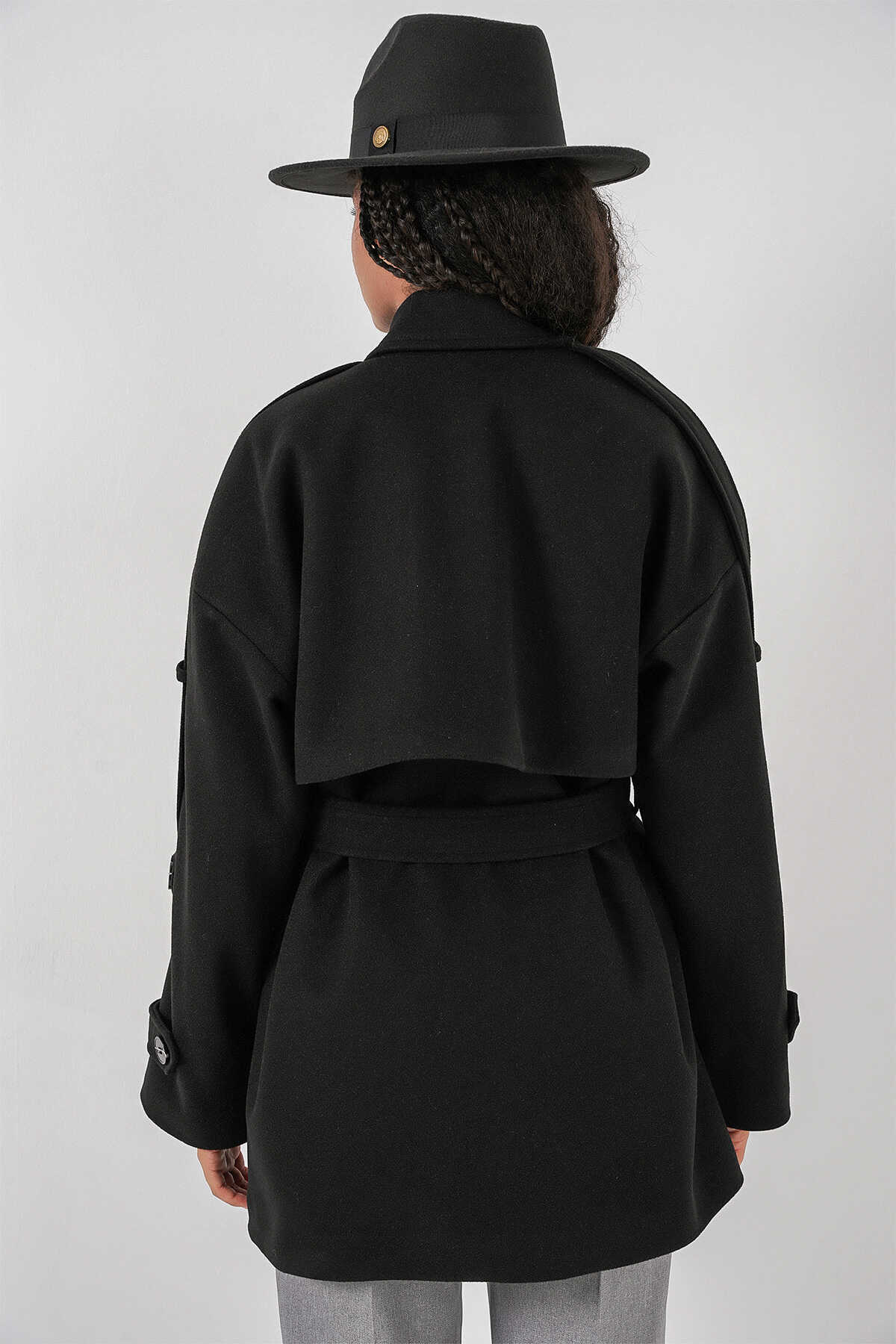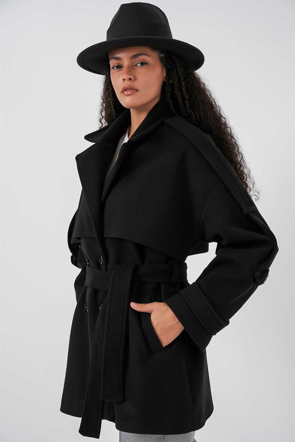 Kadın Kuşaklı Oversize Kaşe Kaban 9157 - Siyah - Kombin