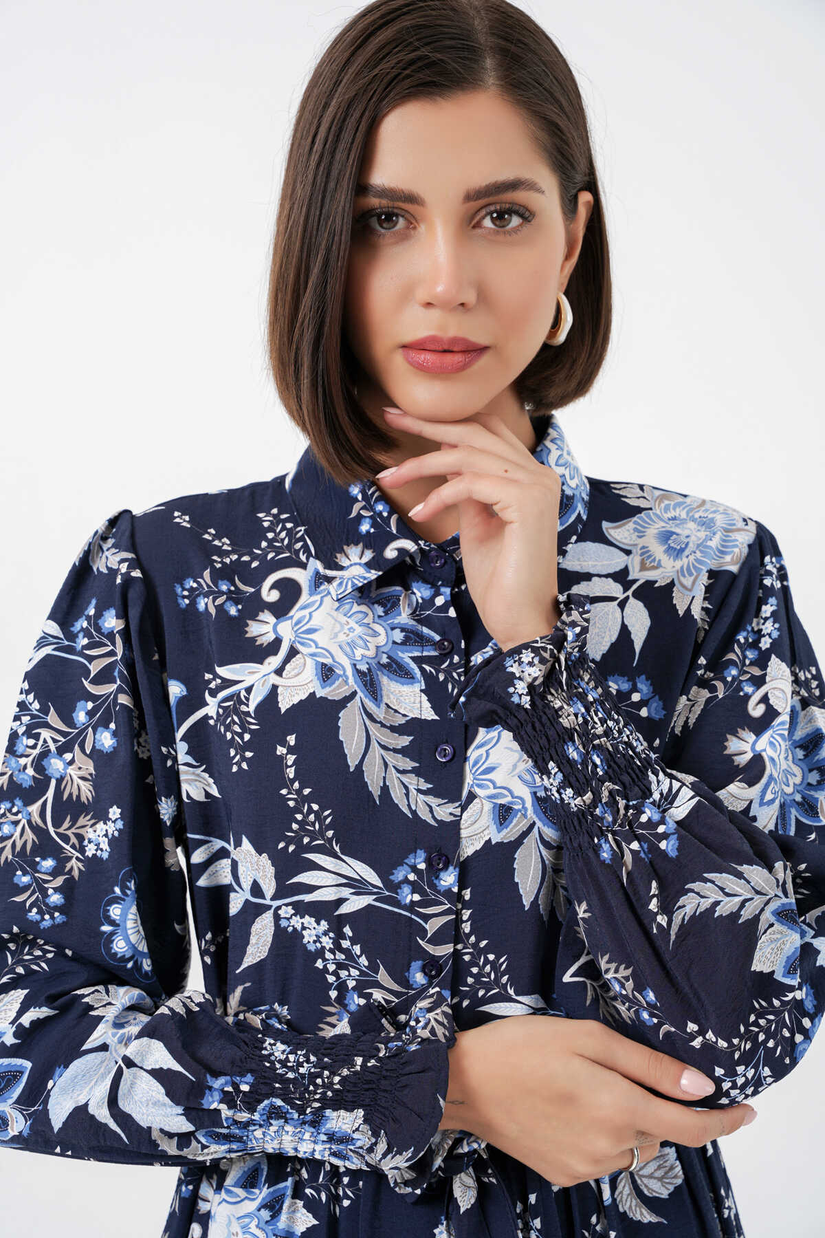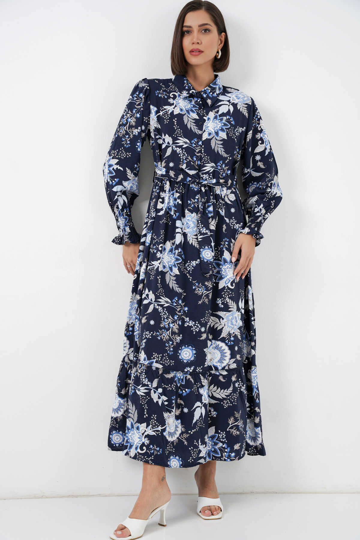 Kadın Kuşaklı Tesettür Elbise 2589 - Lacivert - Kombin