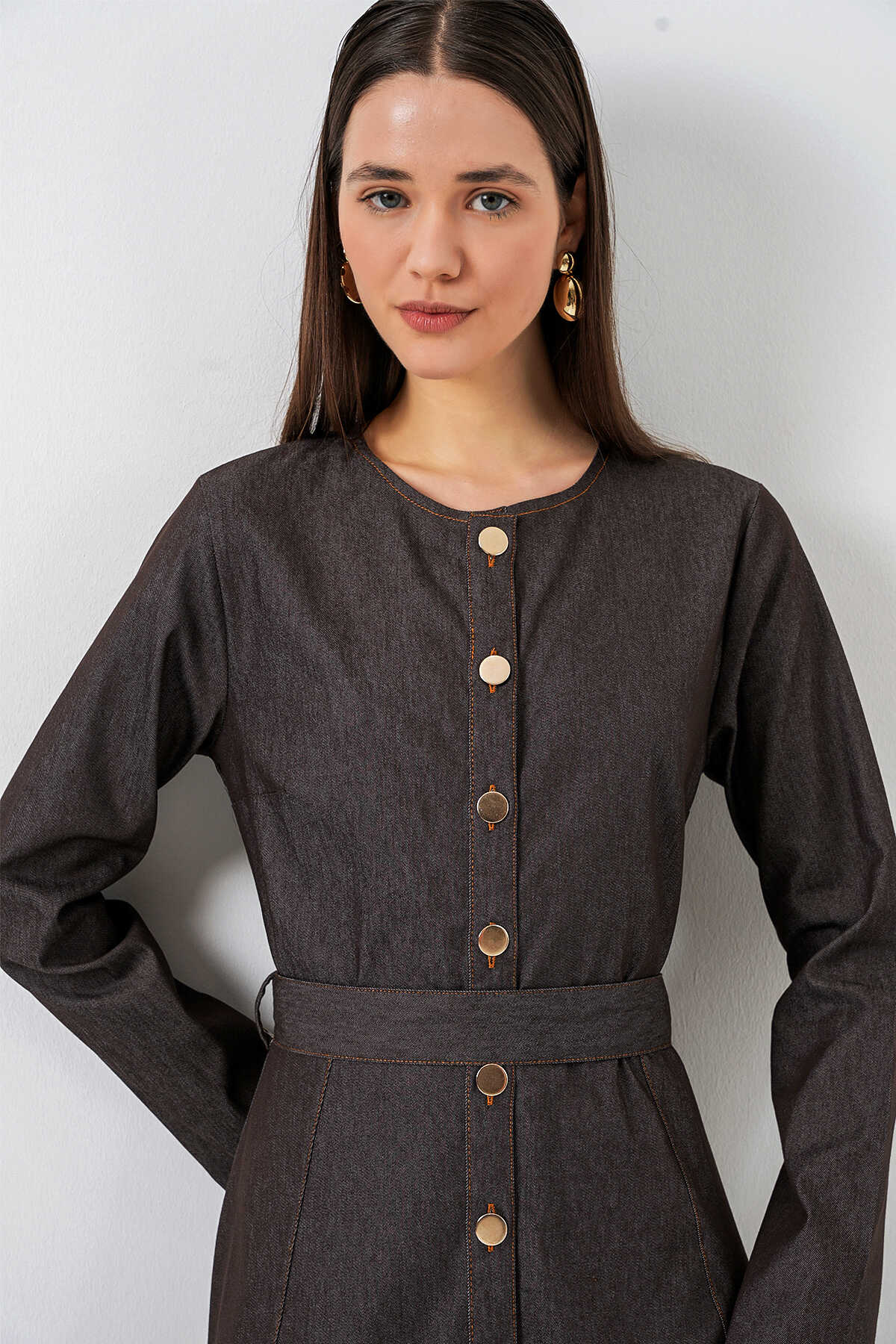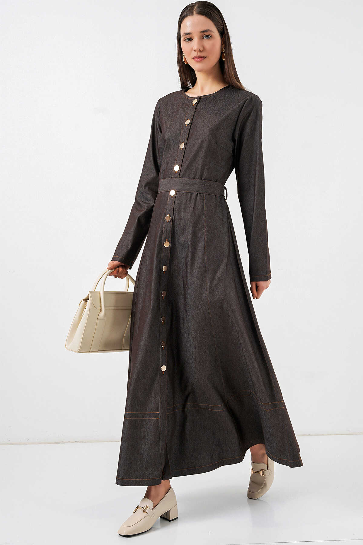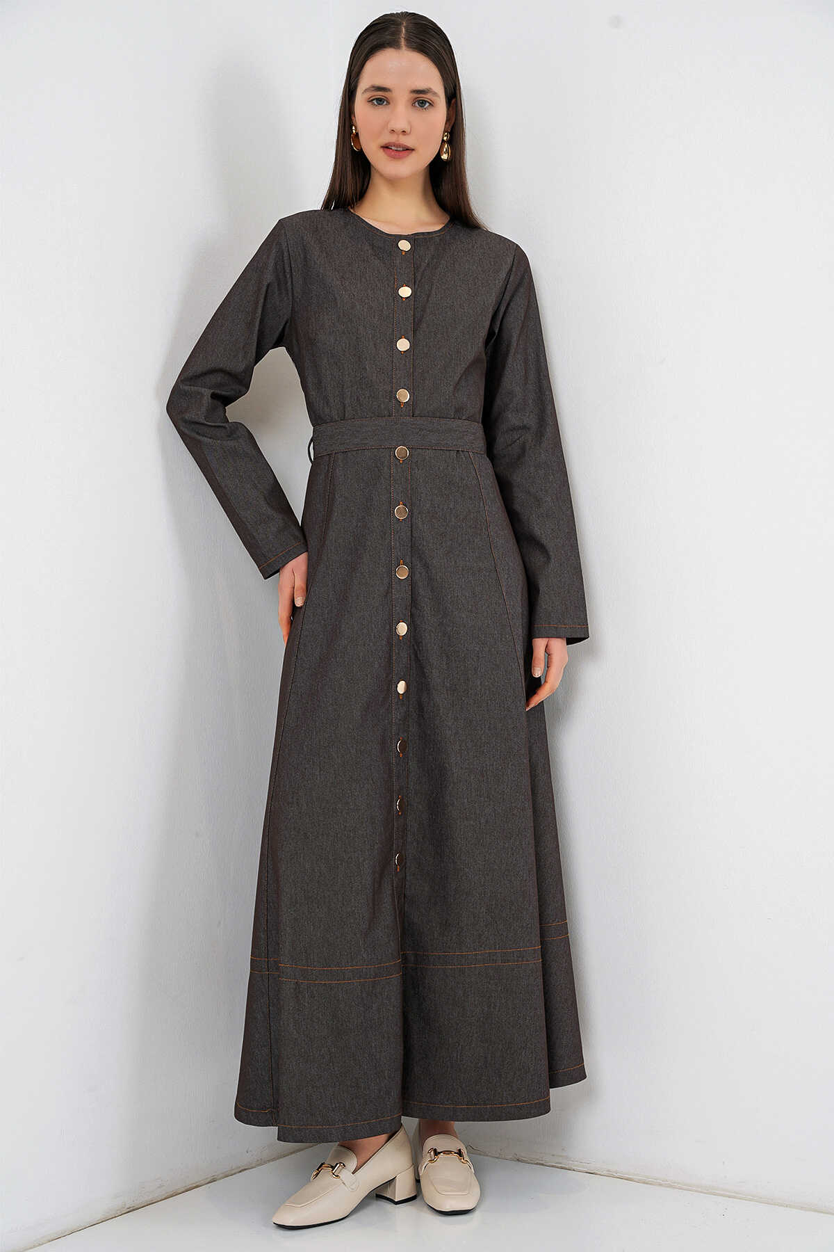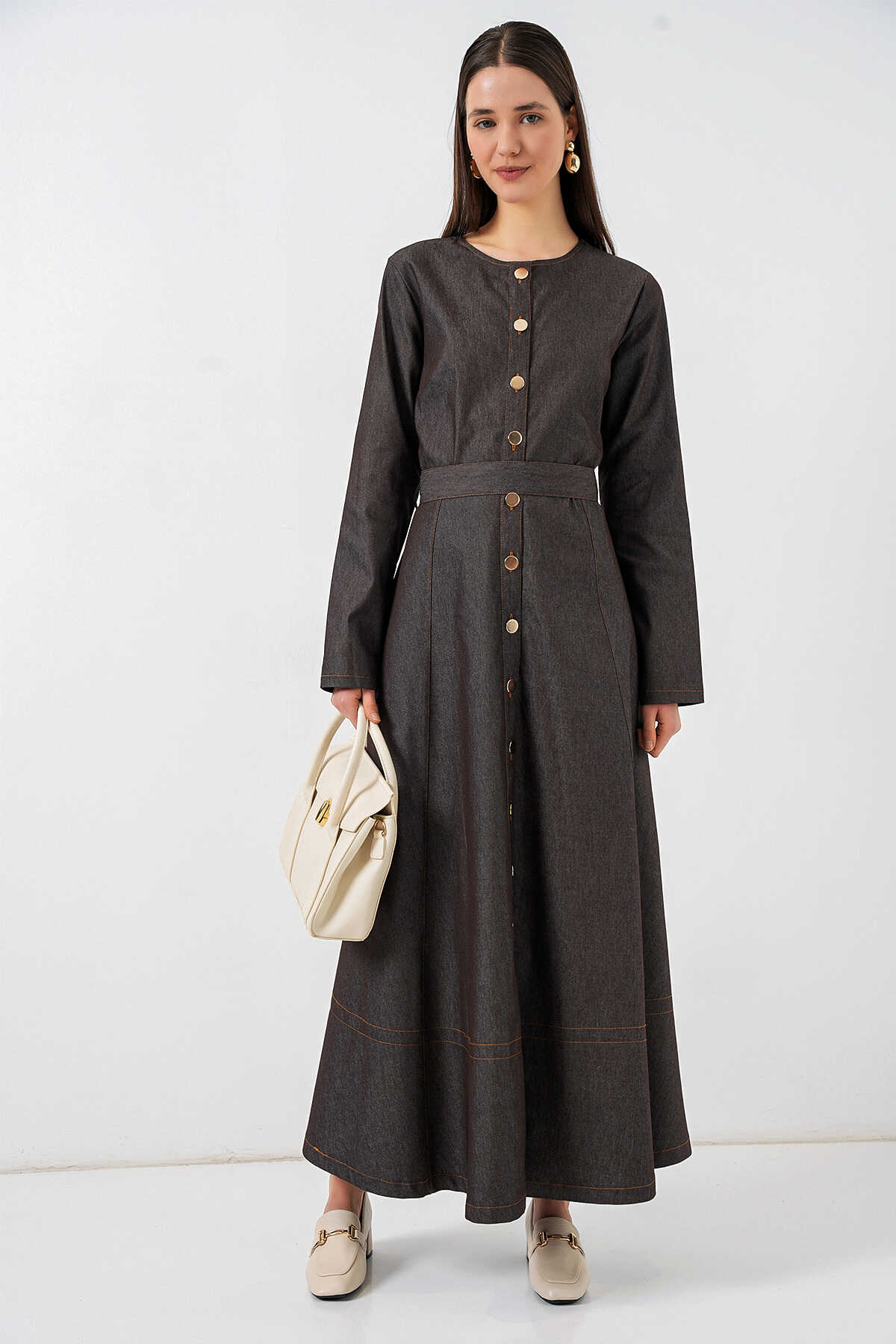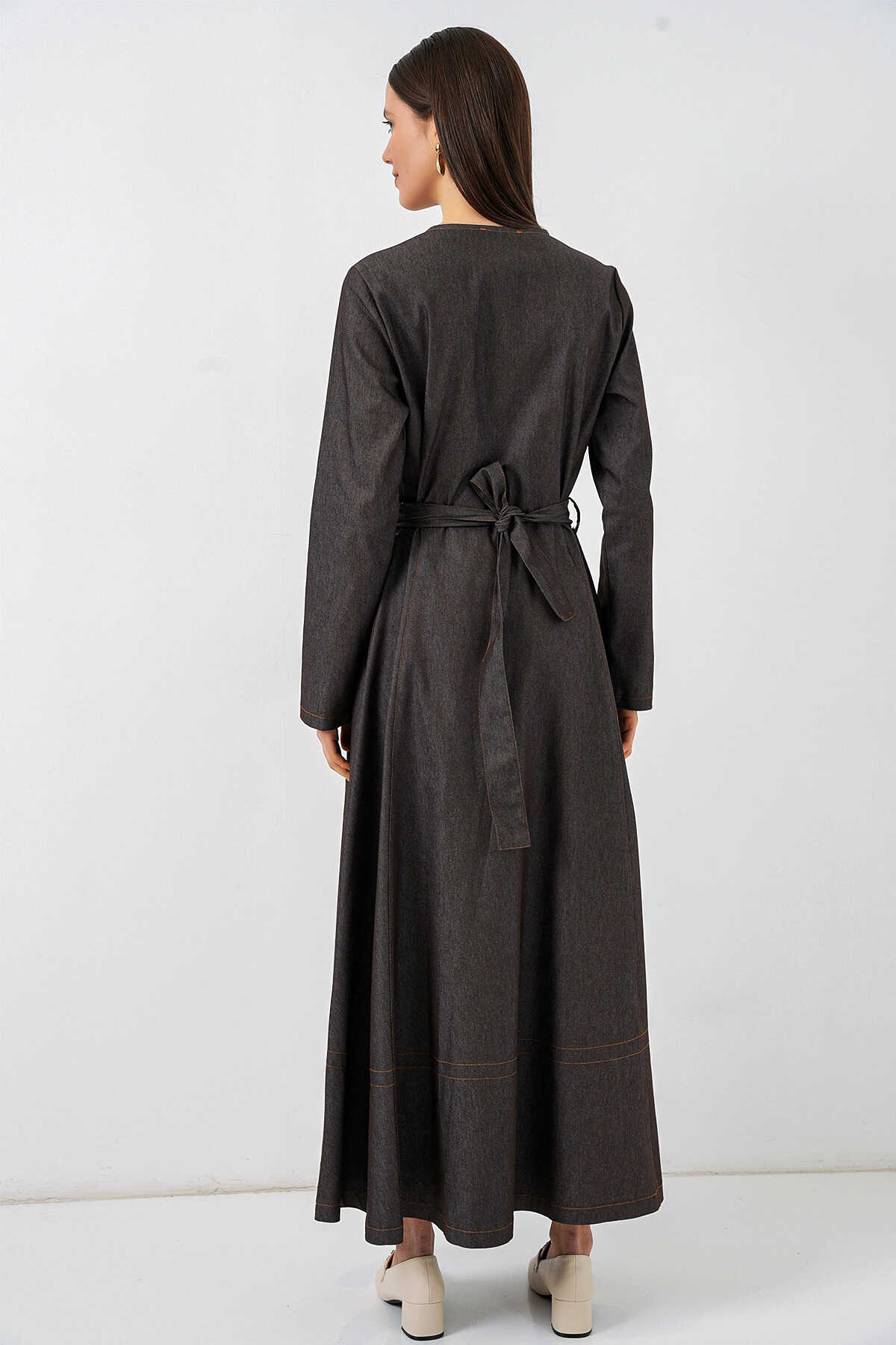 Kadın Kuşaklı Uzun Denim Elbise 2595 - Füme - Kombin