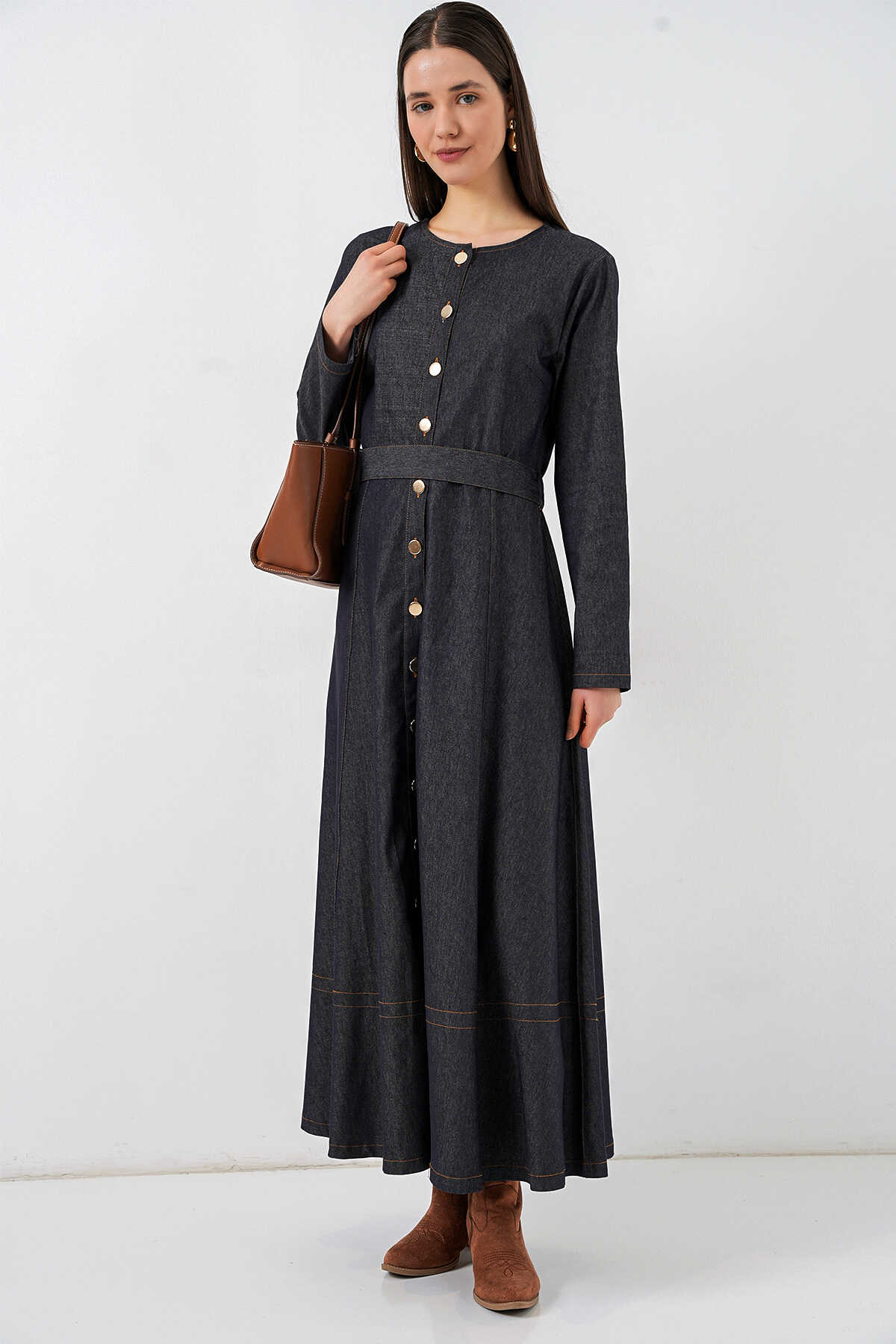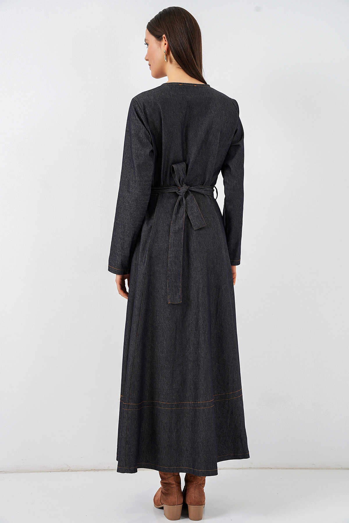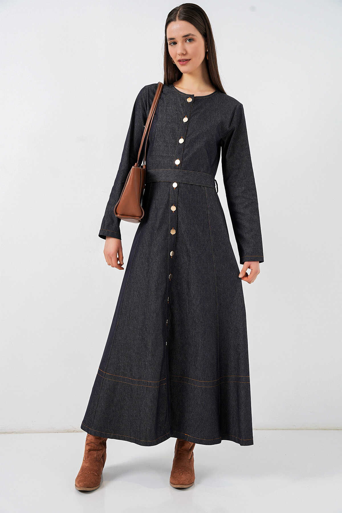 Kadın Kuşaklı Uzun Denim Elbise 2595 - Lacivert - Kombin