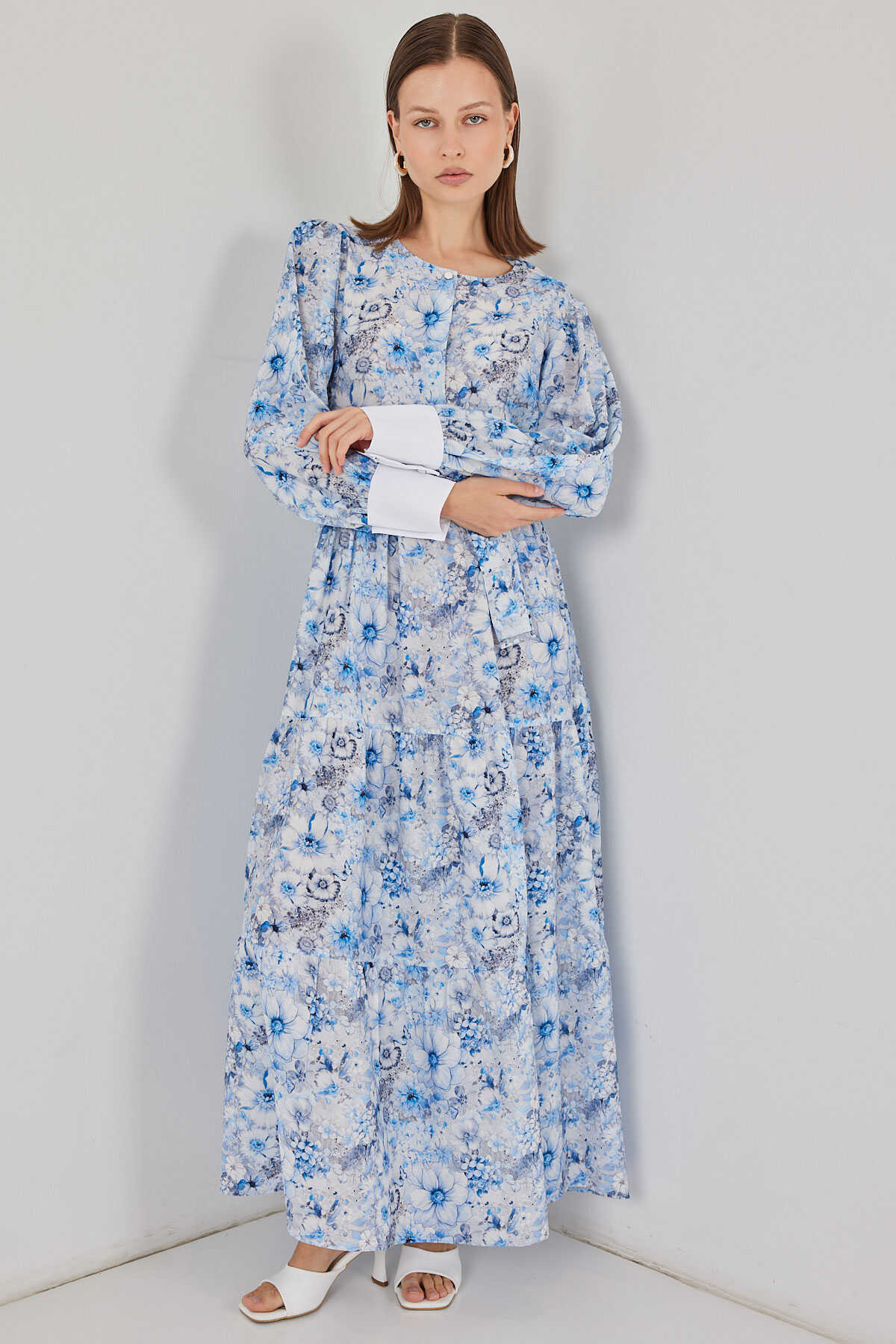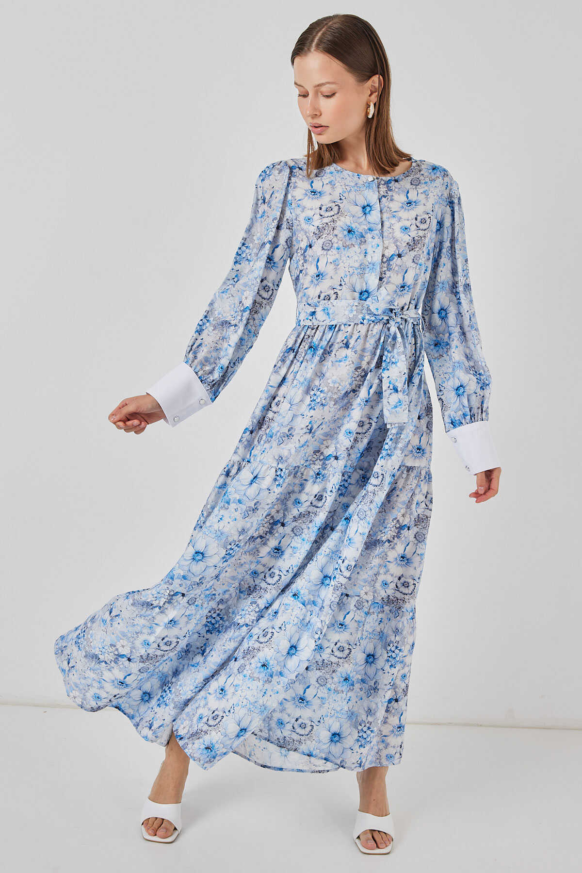 Kadın Kuşaklı Uzun Elbise 2584 - Mavi - Kombin