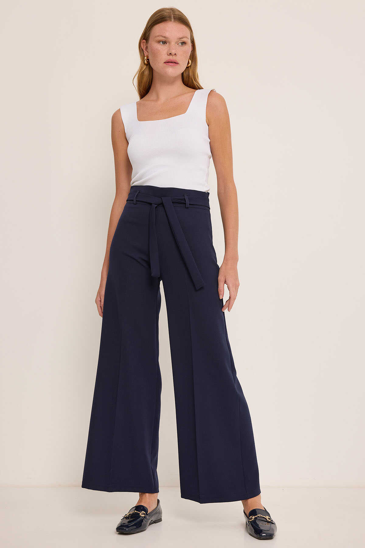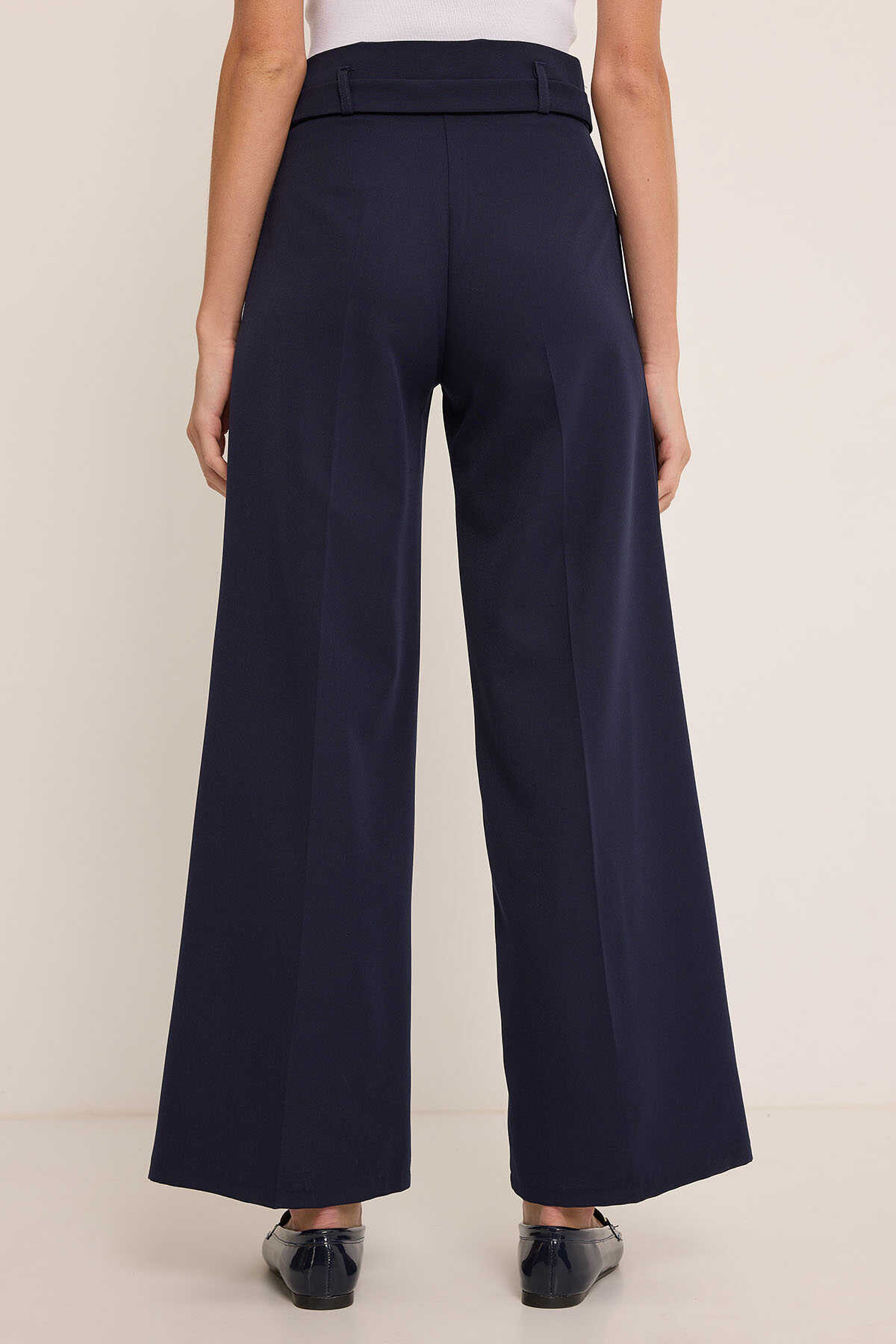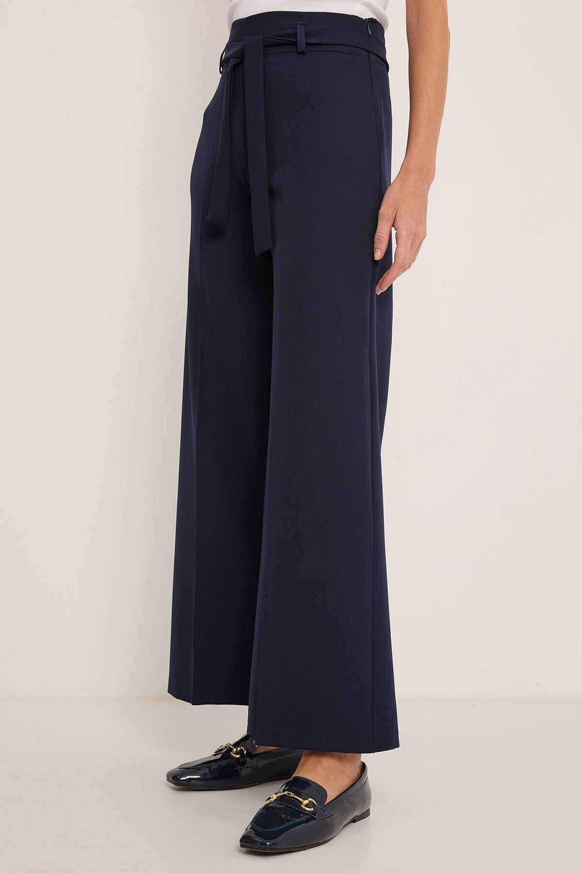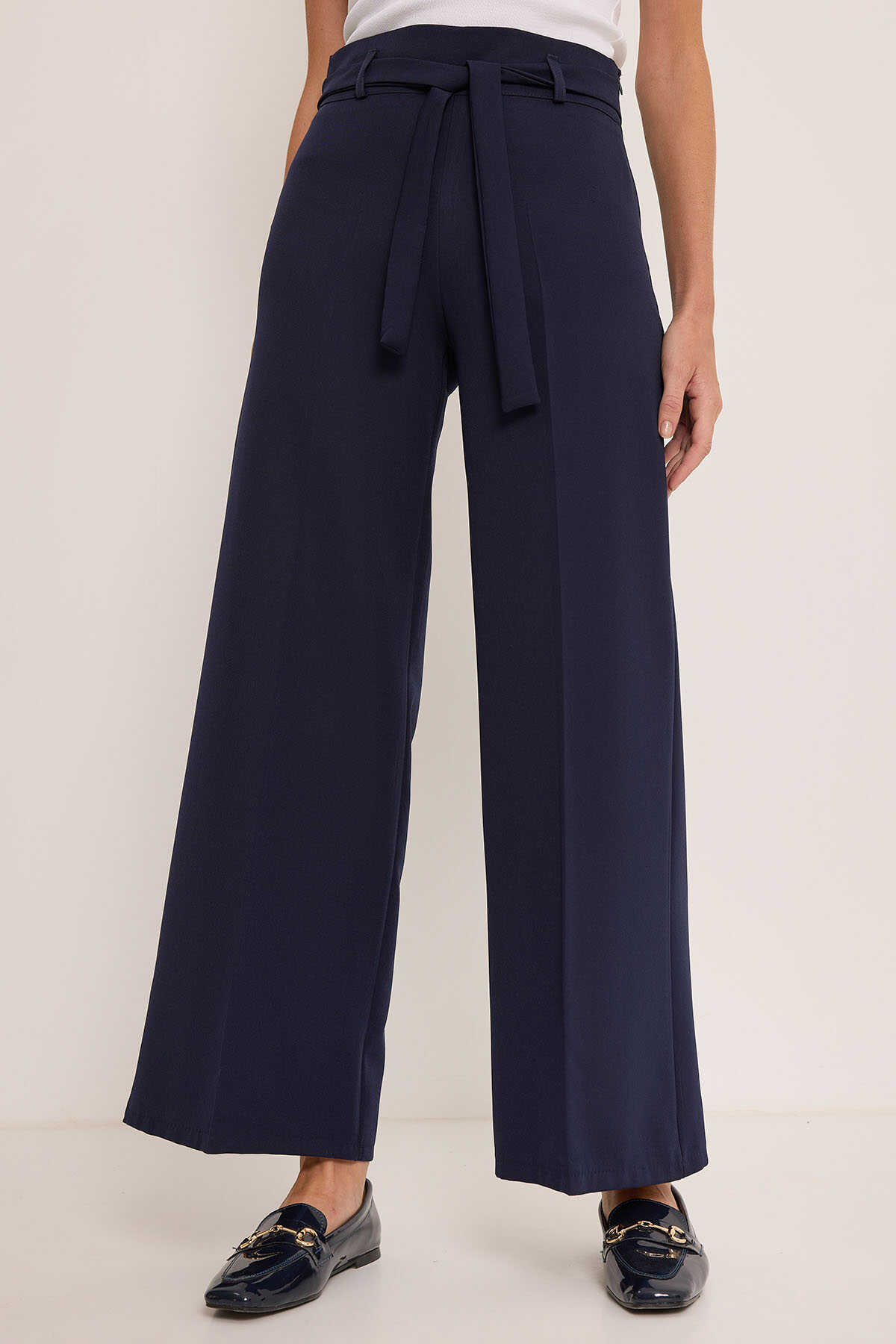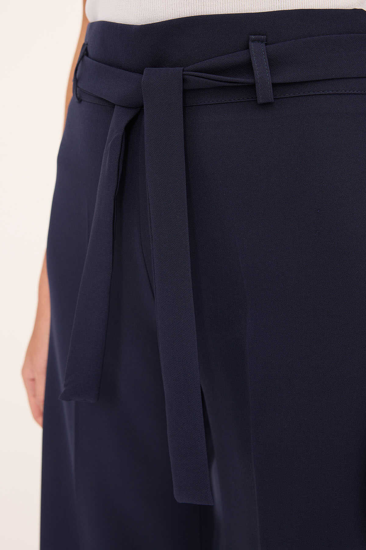 Kadın Lacivert Kuşaklı Bol Paça Palazzo Pantolon 6651 - Kombin