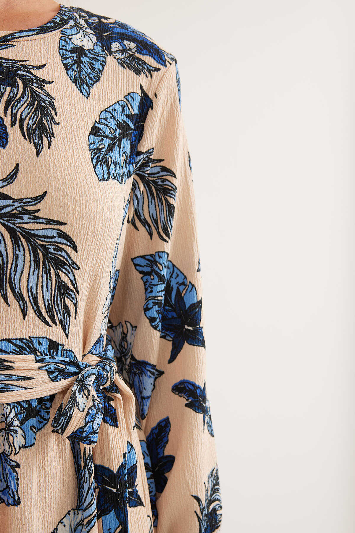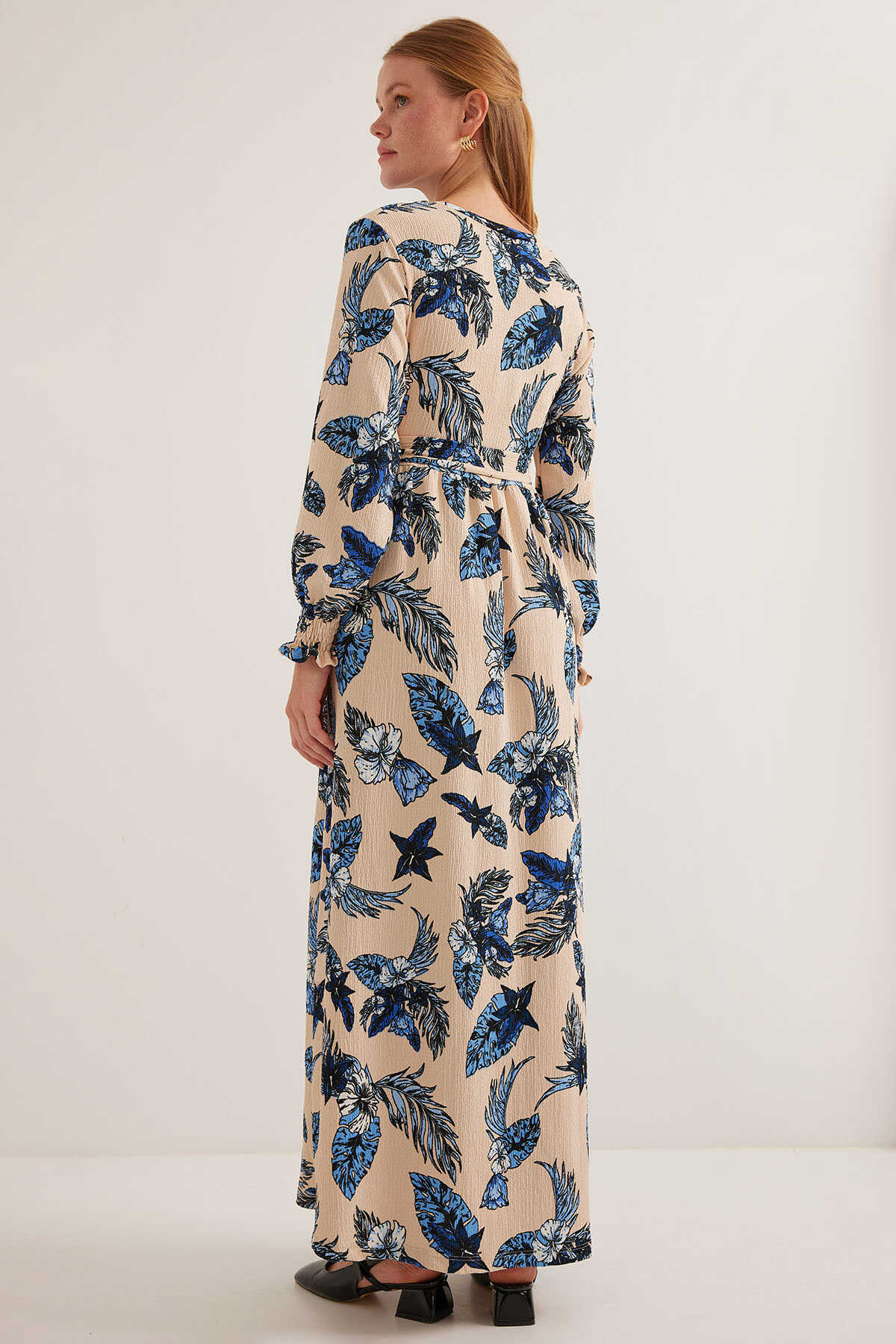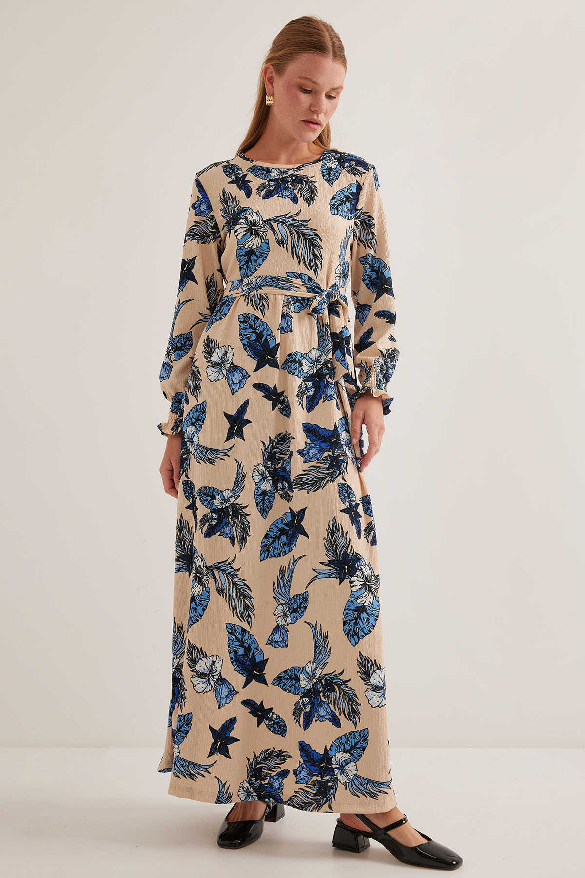 Kadın Mavi Krem Desenli Örme Tesettür Elbise 1525 - Kombin