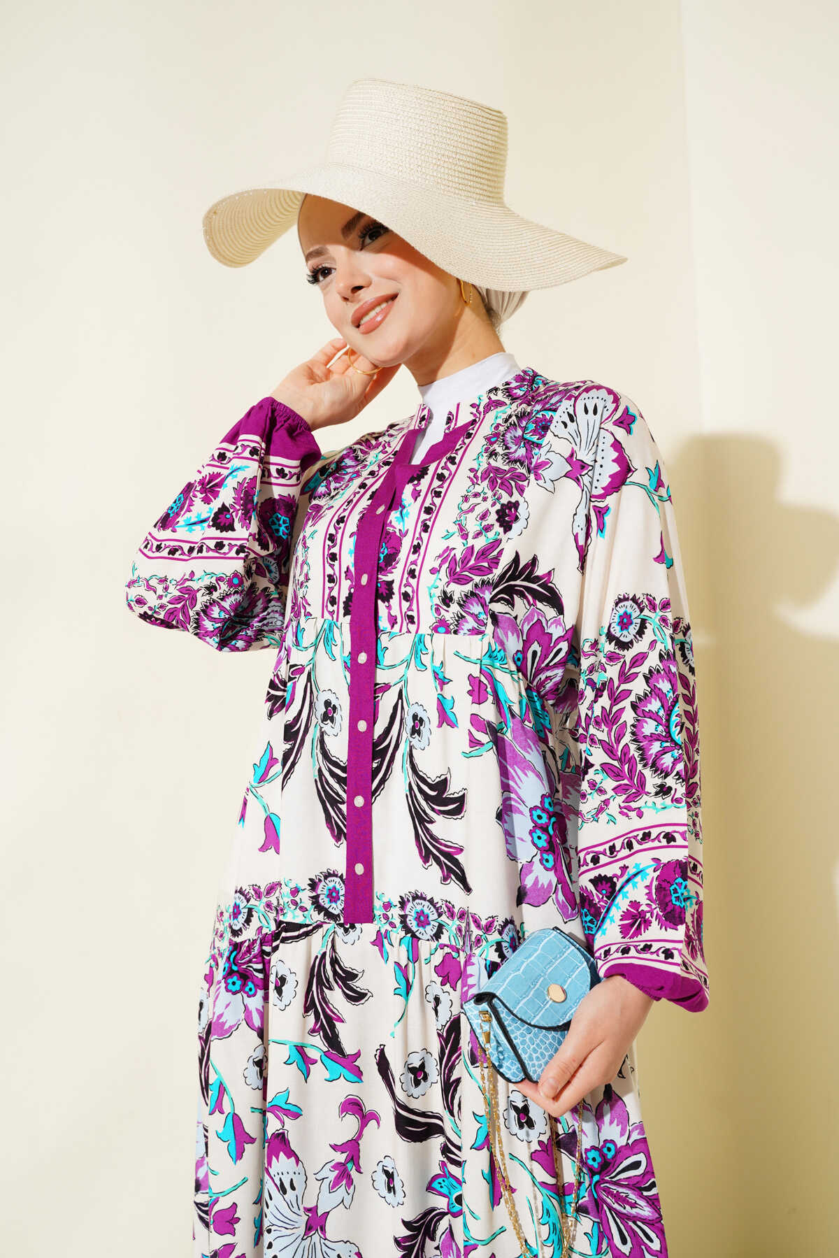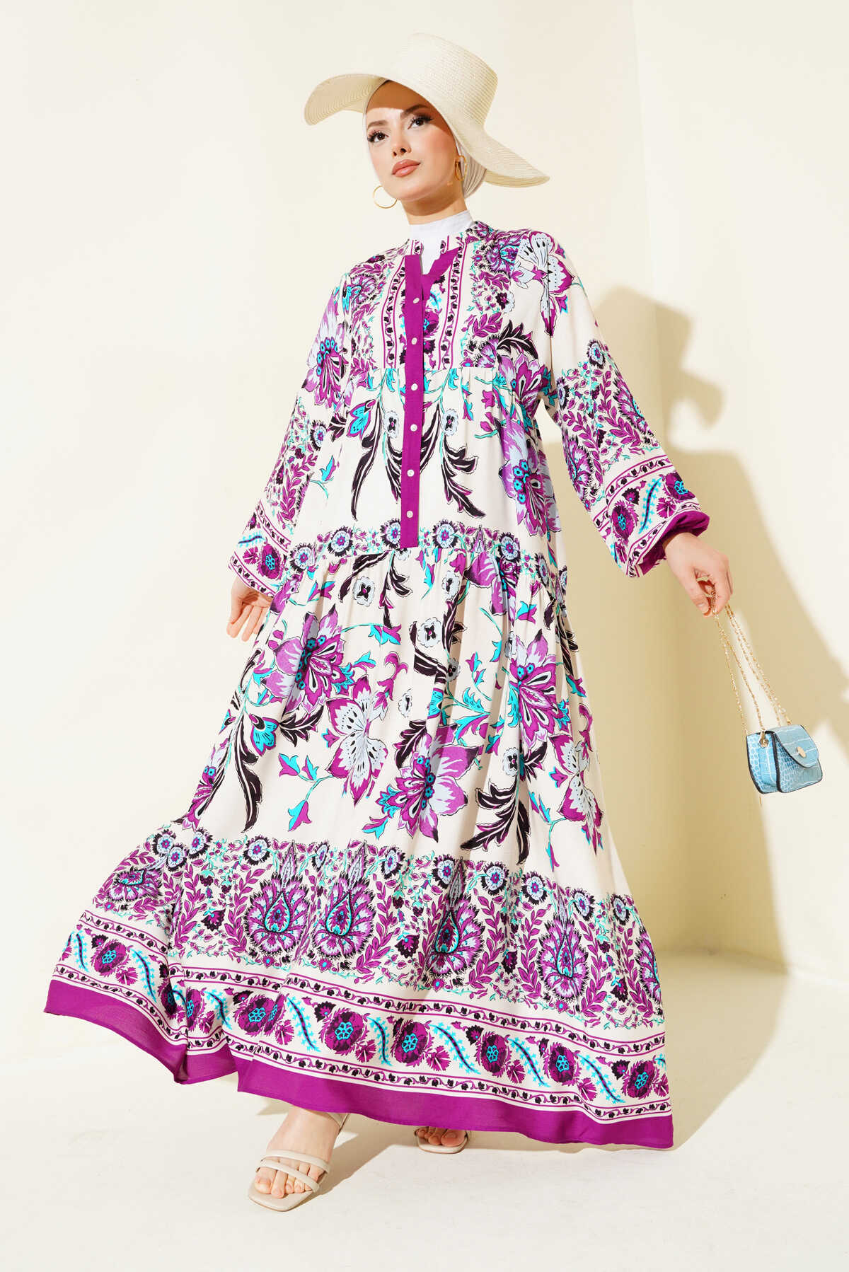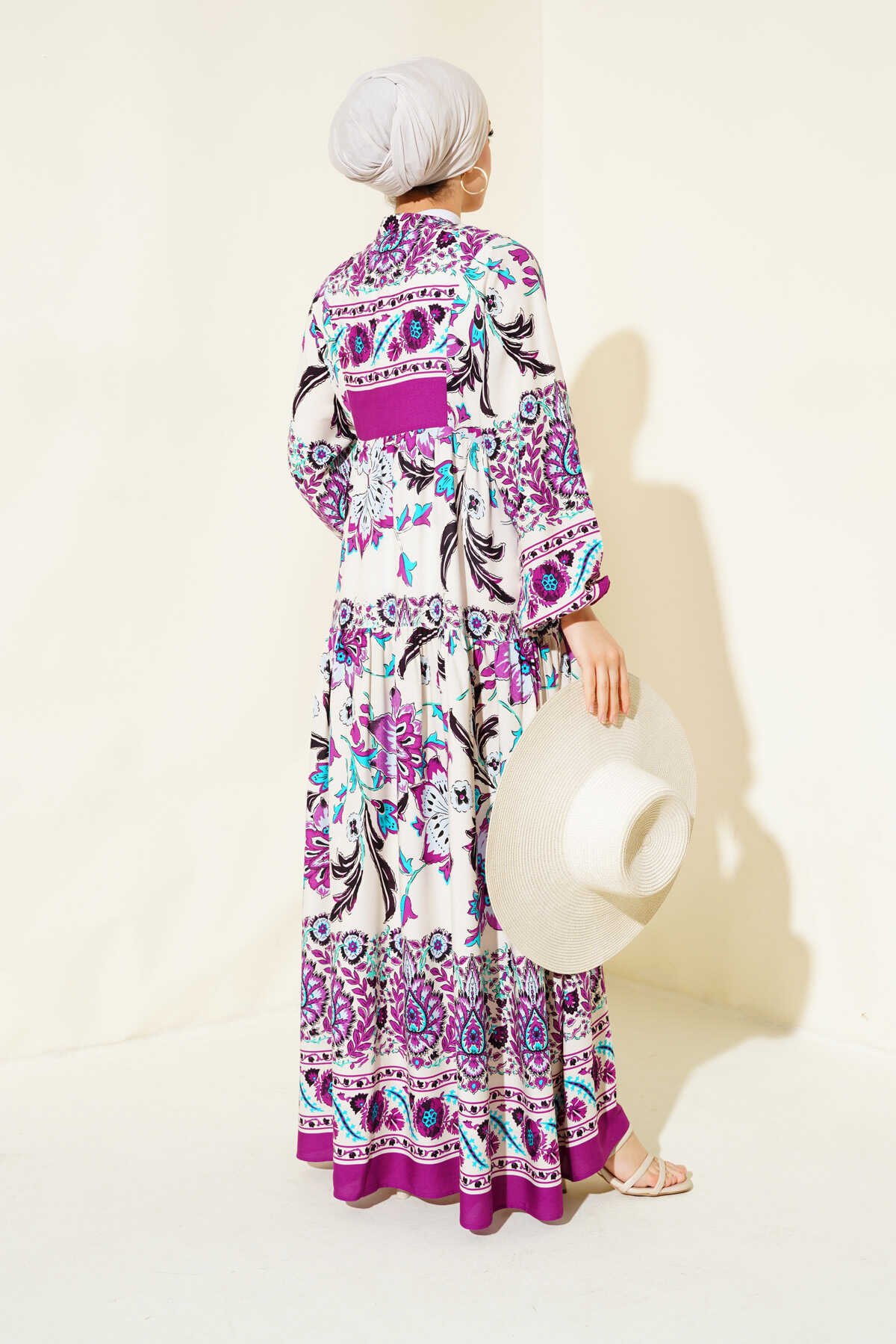 Kadın Mürdüm Krem Viskon Tesettür Elbise 2423 - Kombin