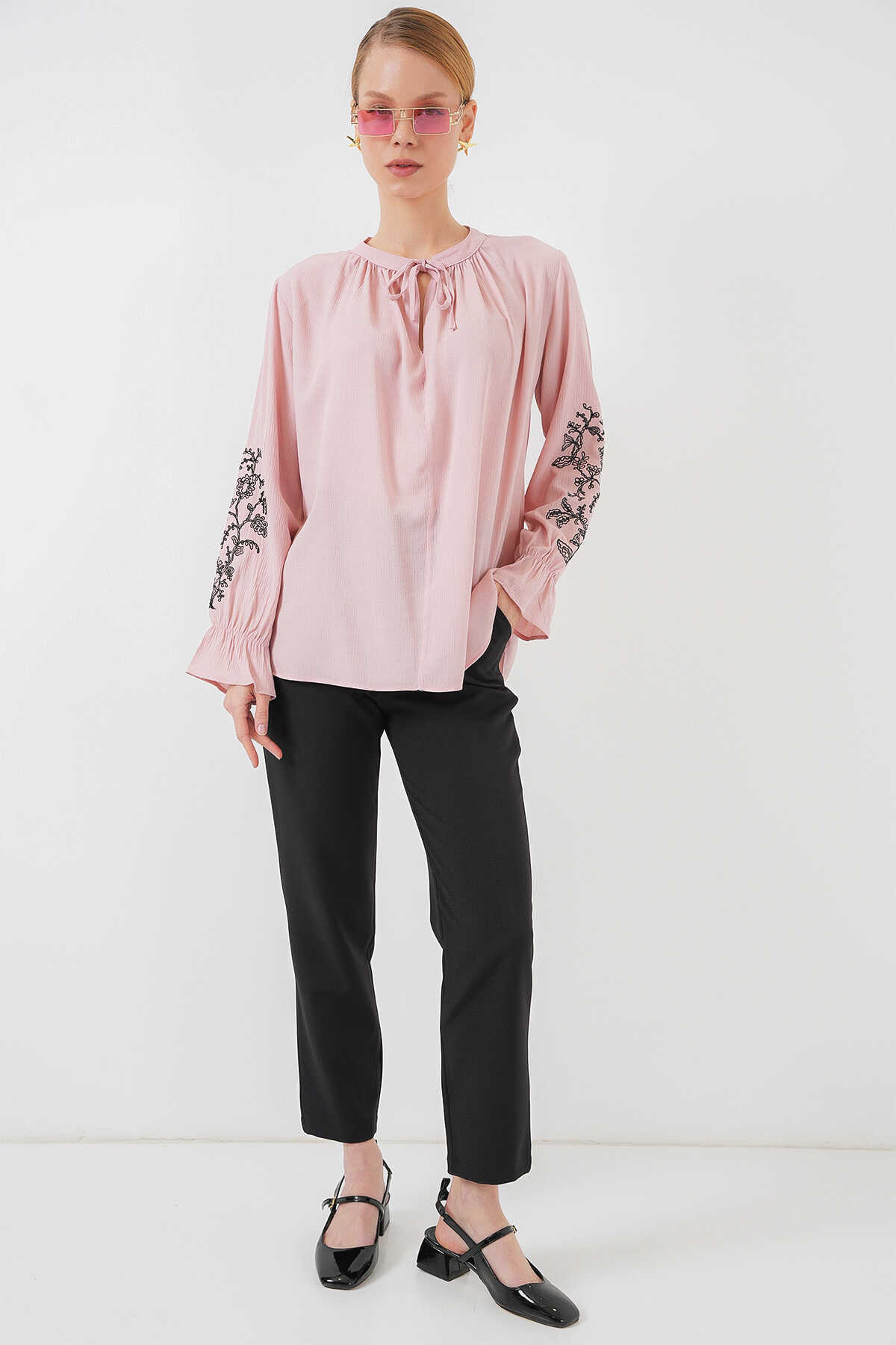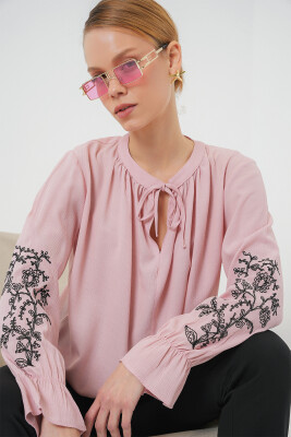 Kadın Nakışlı Örme Bluz 941 - Pudra - Kombin