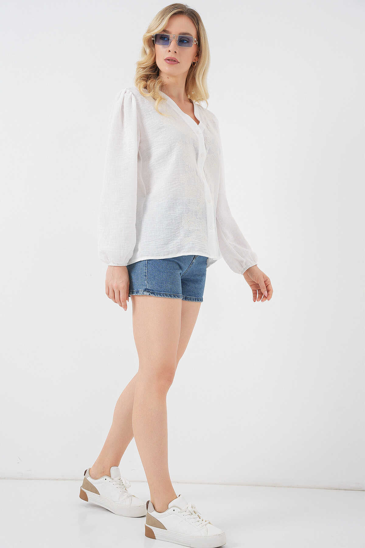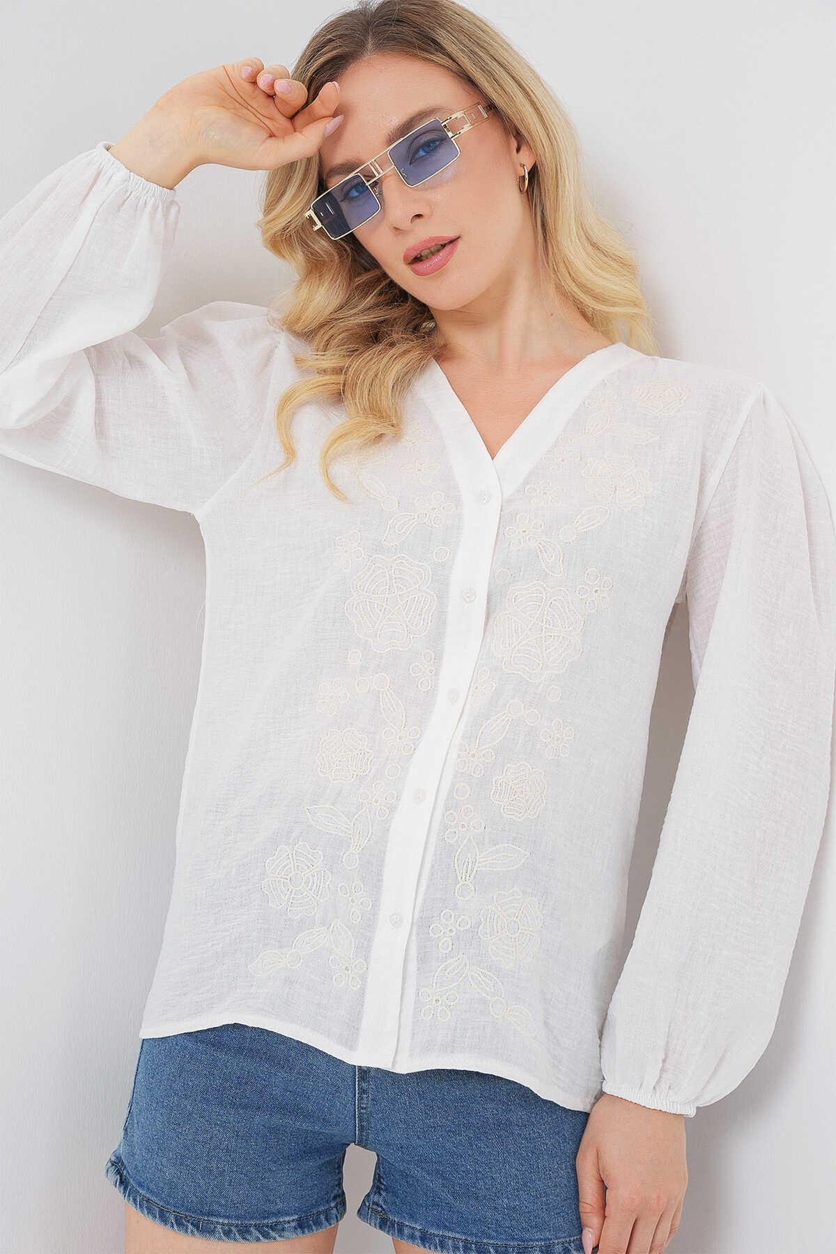 Kadın Nakışlı Uzun Kol Bluz 963 - Krem