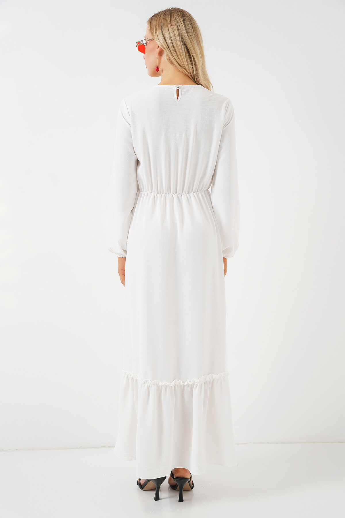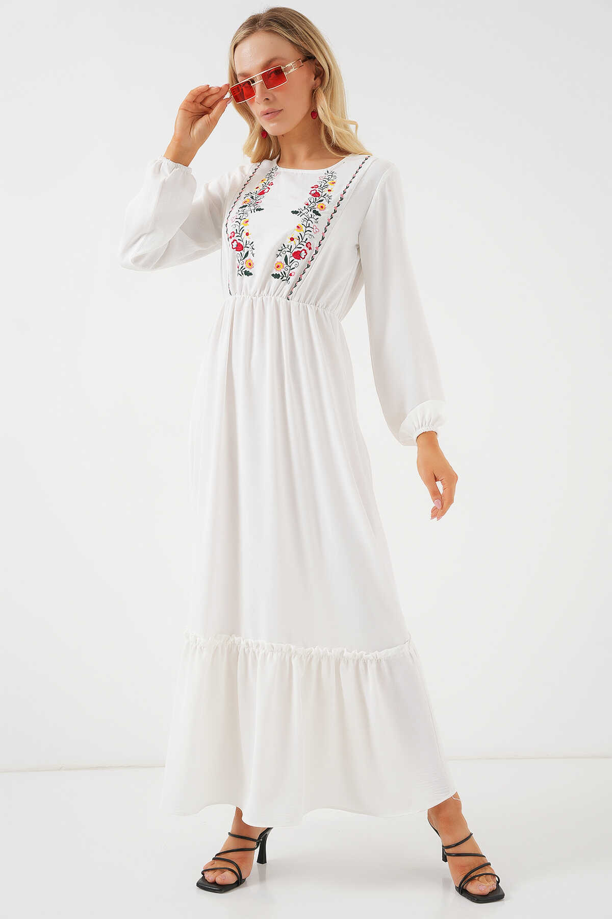 Kadın Nakışlı Uzun Tesettür Elbise 2550 - Beyaz - Kombin