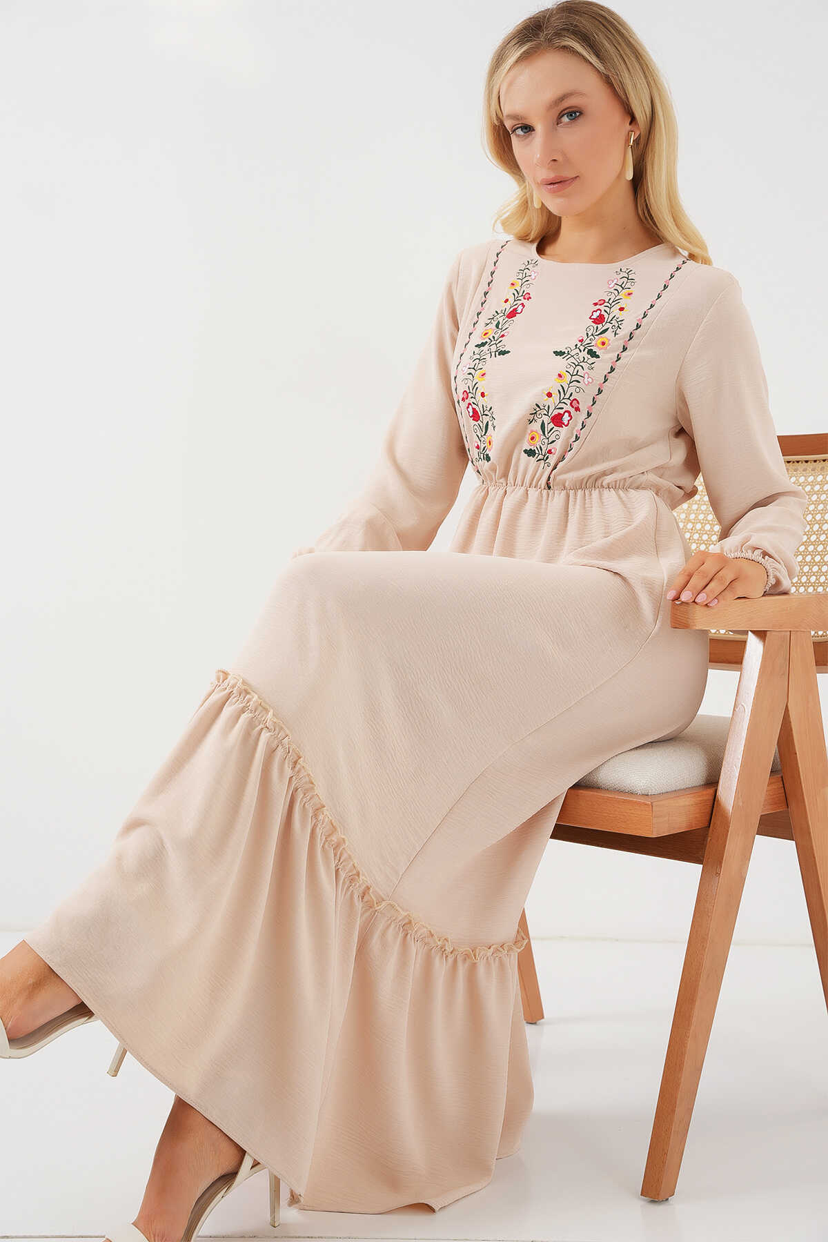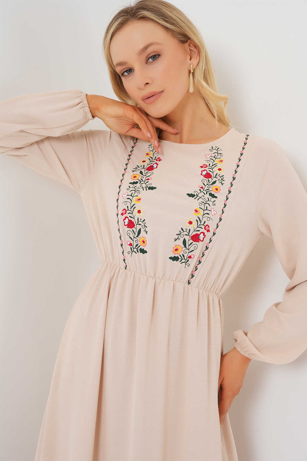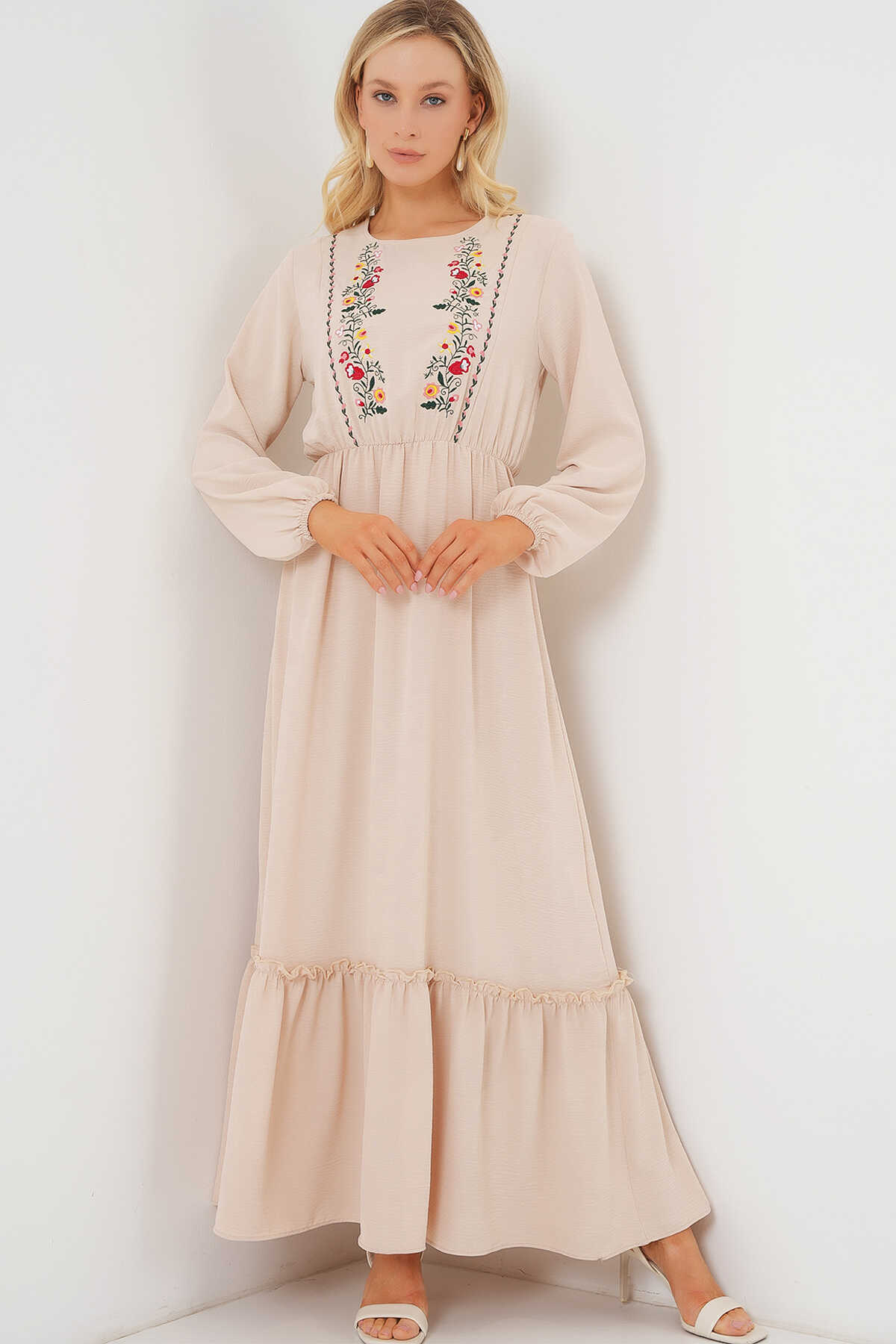 Kadın Nakışlı Uzun Tesettür Elbise 2550 - Krem