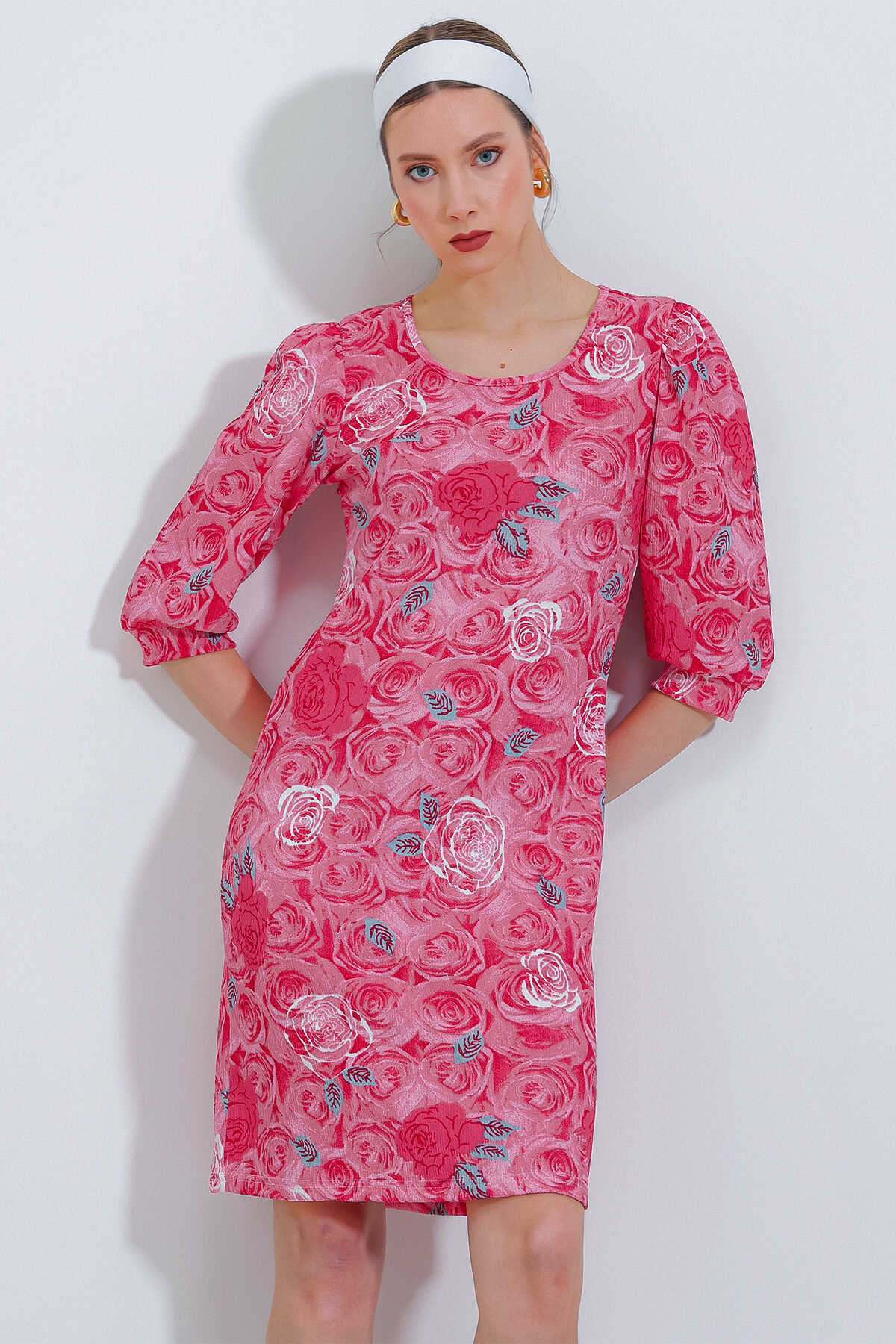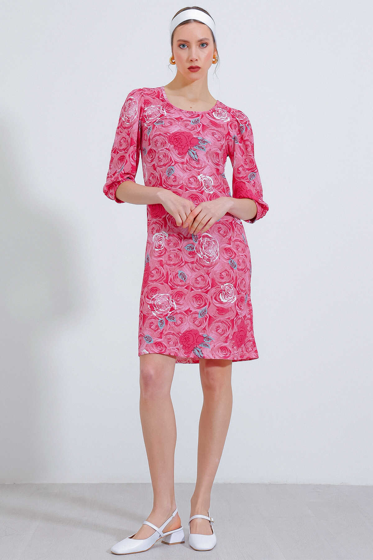 Kadın Nar Gül Desenli Midi Elbise 2477 - Kombin