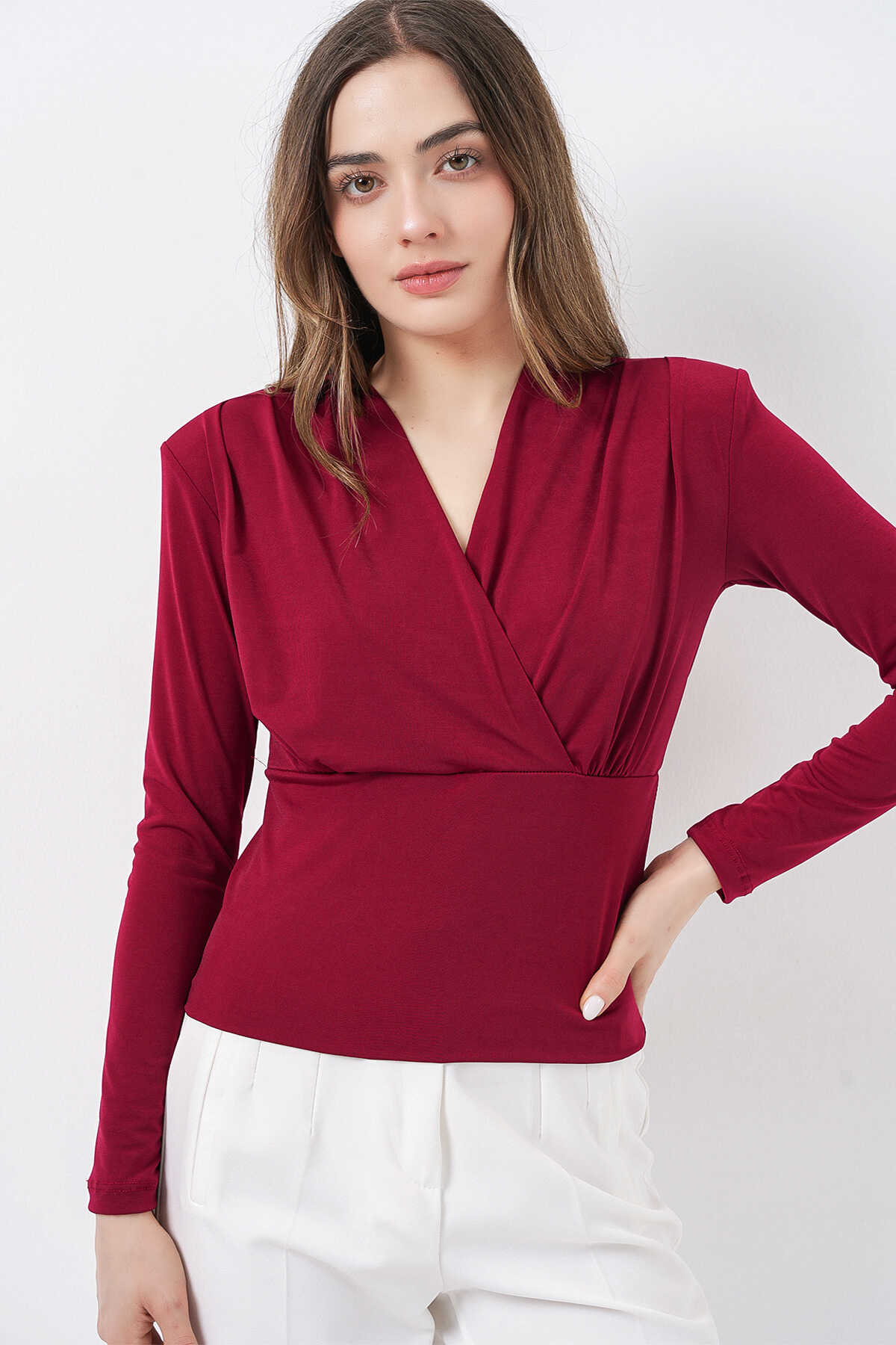 Kadın Omuz Vatkalı Kruvaze Yaka Bluz 942 - Bordo - Kombin