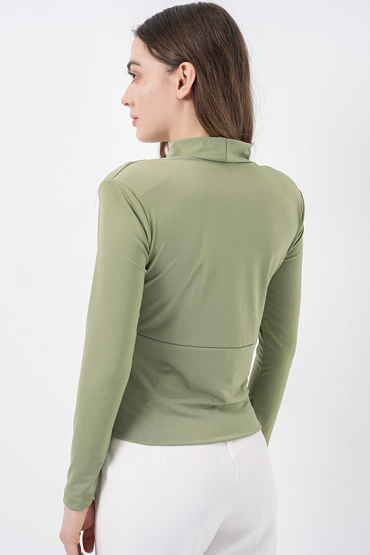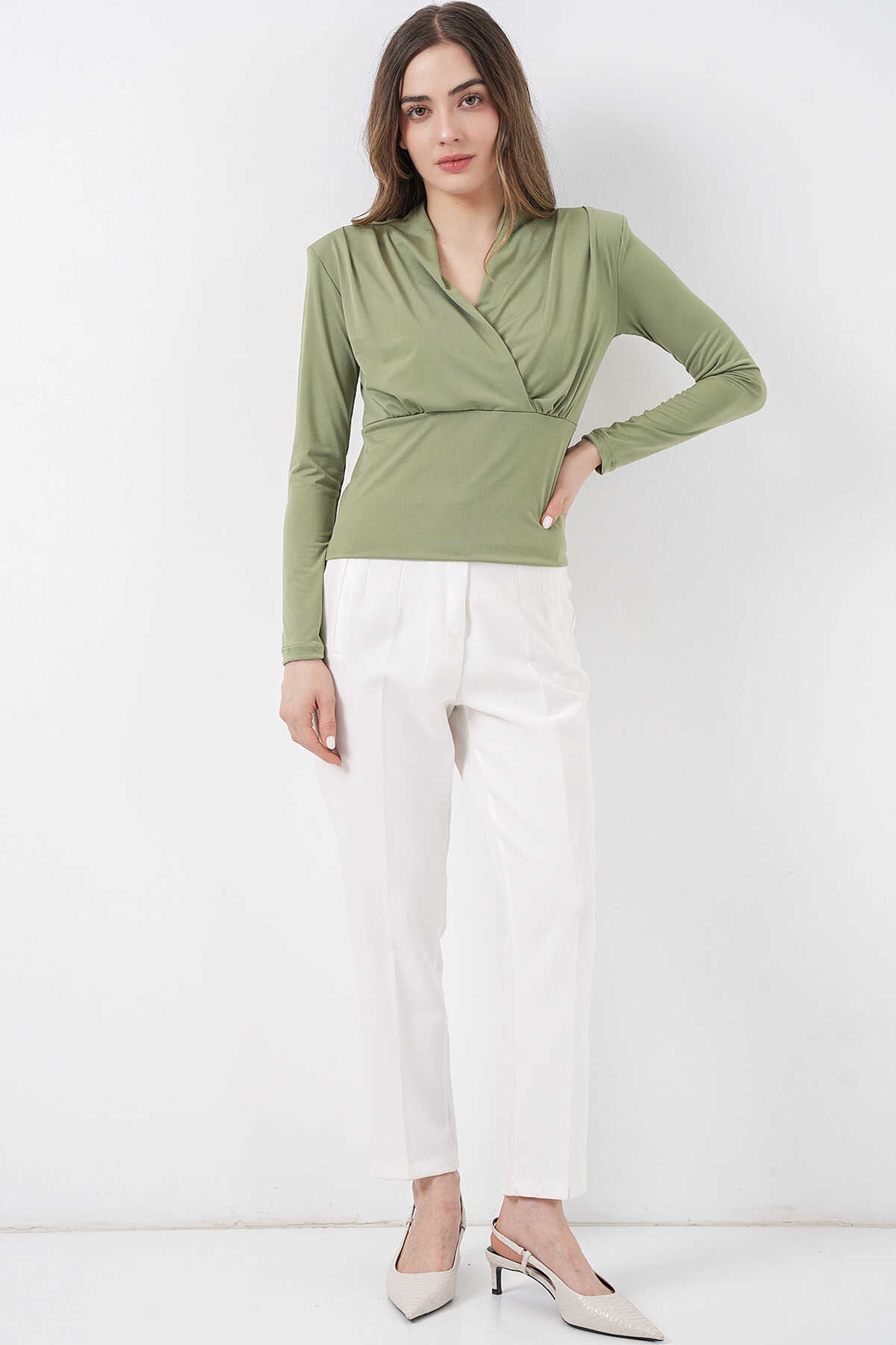 Kadın Omuz Vatkalı Kruvaze Yaka Bluz 942 - E.Yeşil - Kombin