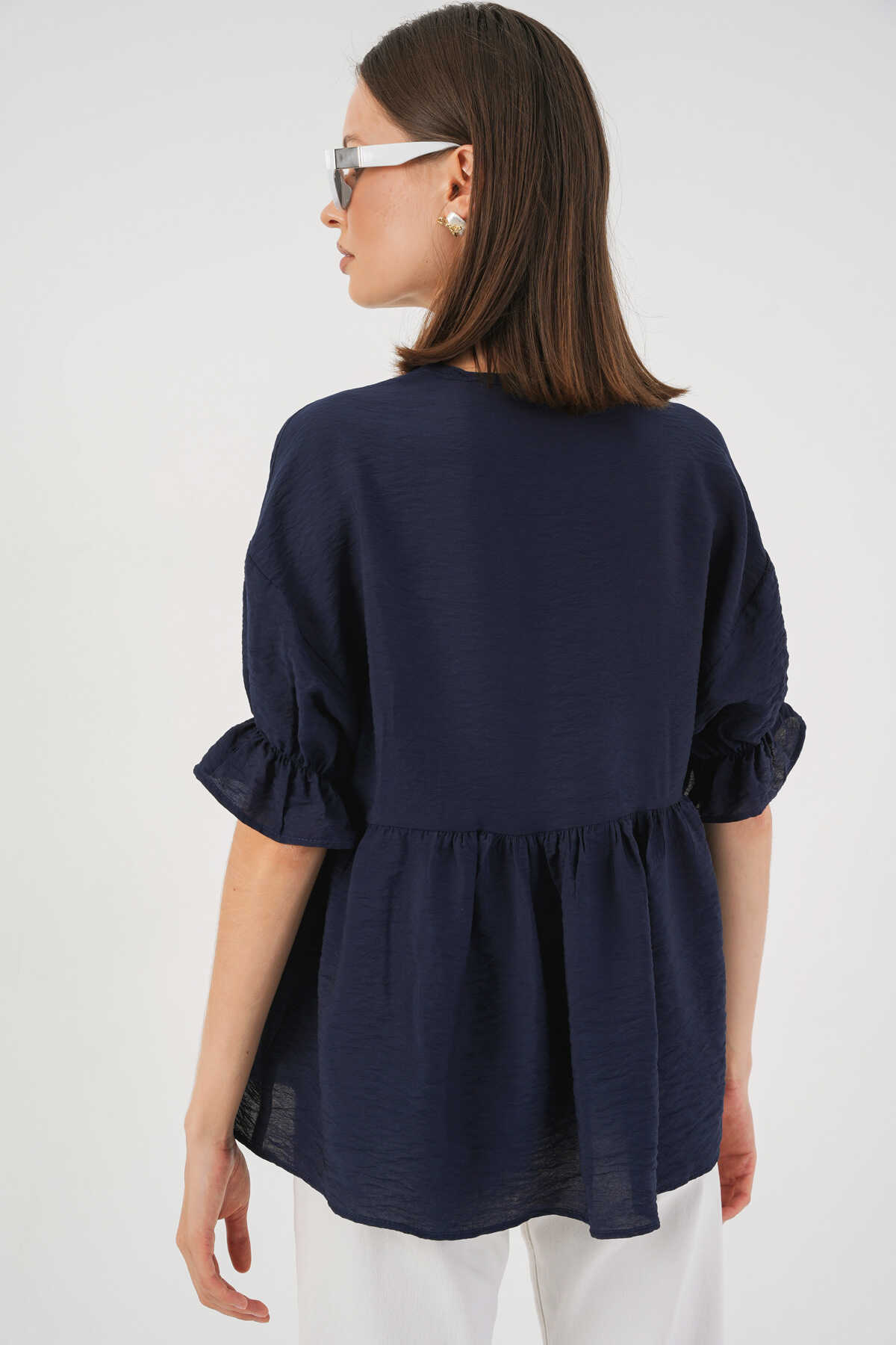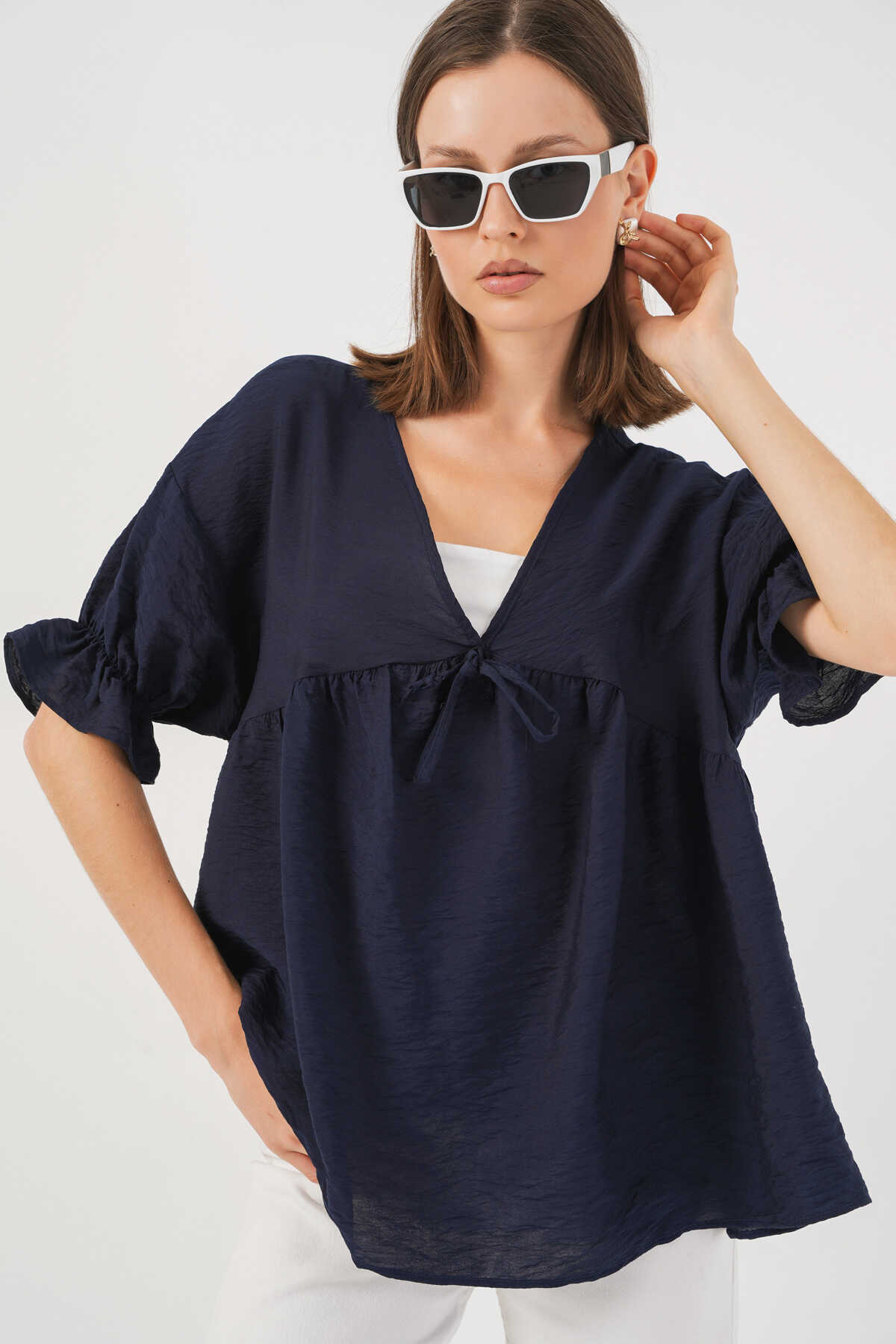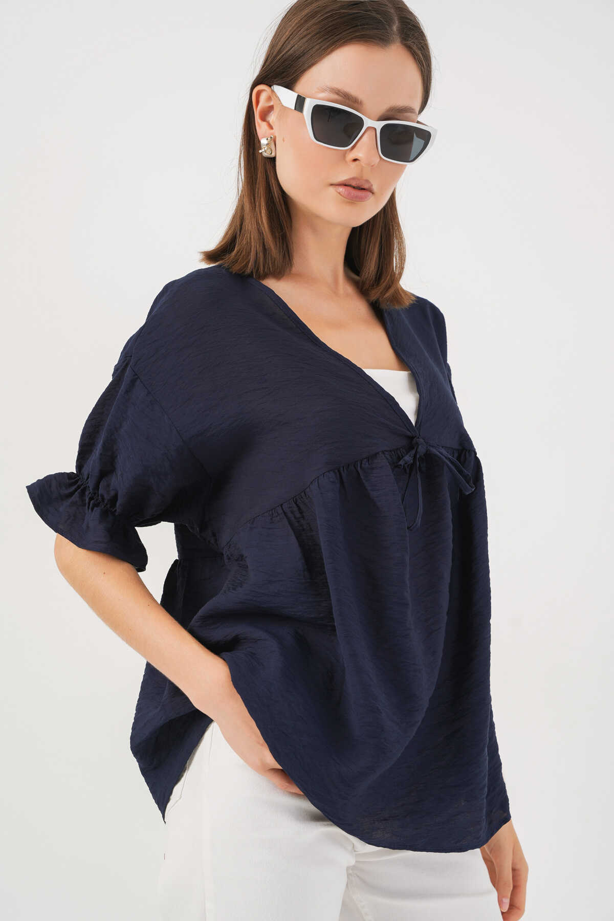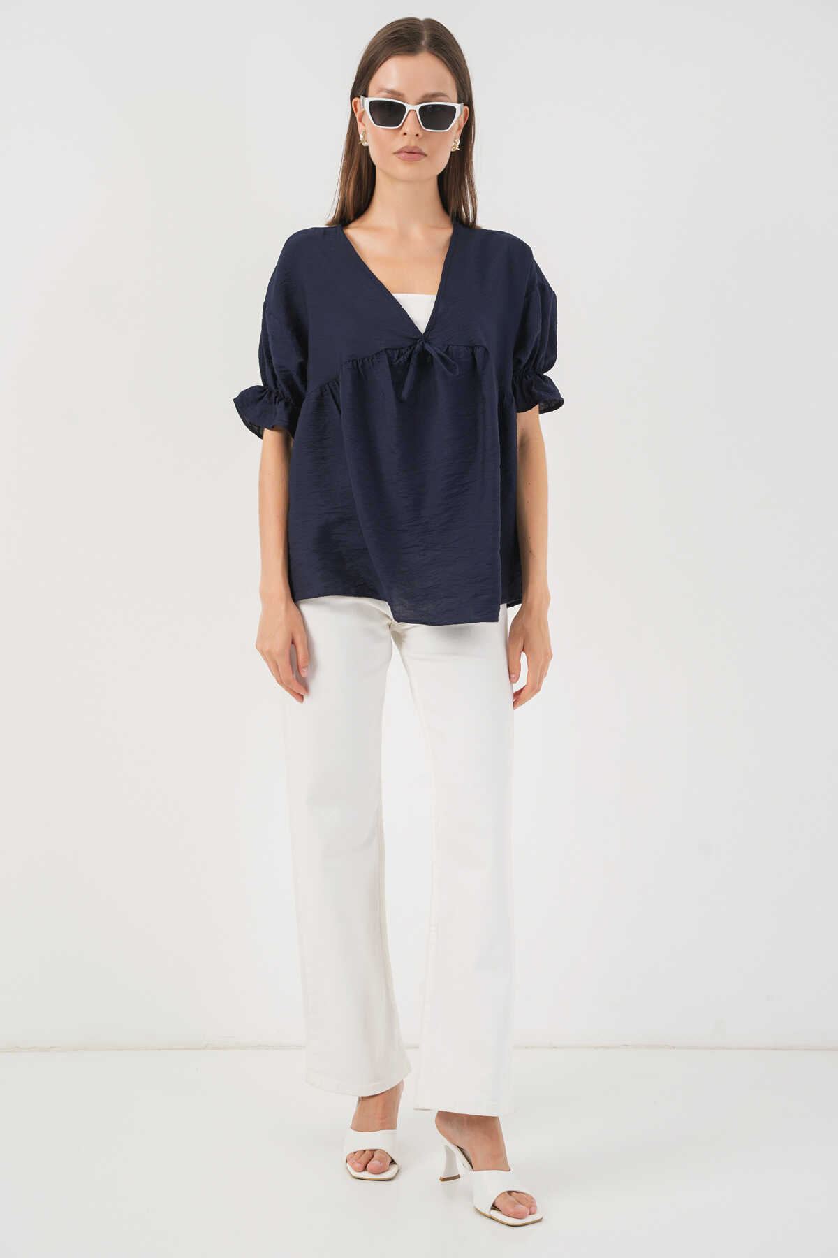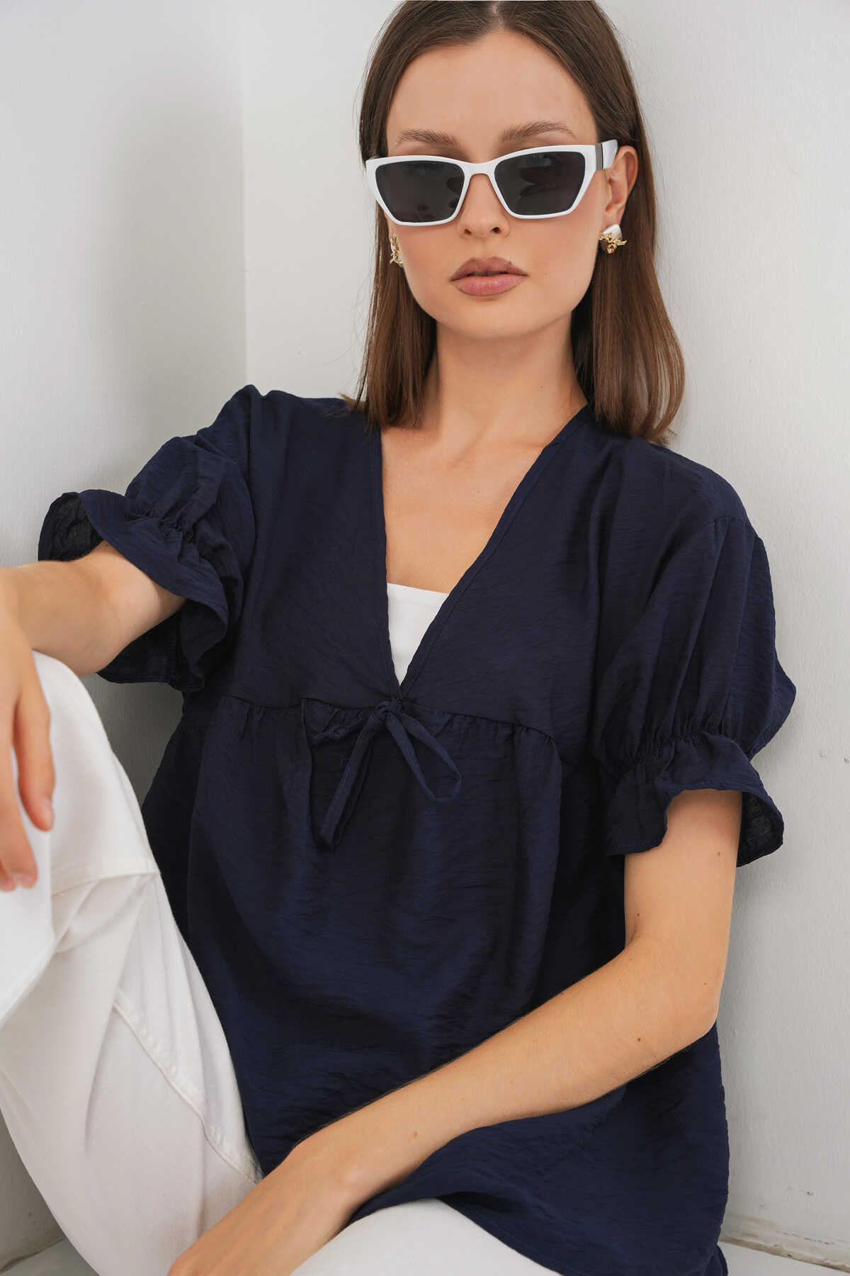 Kadın Önü Bağcıklı Kısa Kol Bluz 962 - Lacivert - Kombin