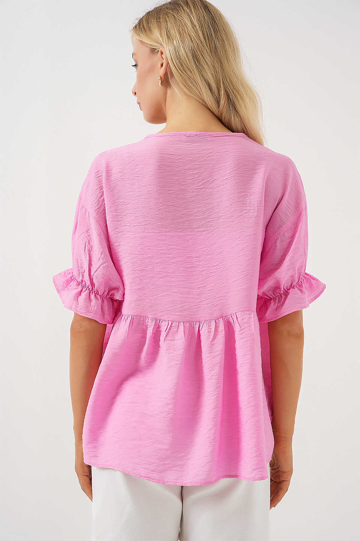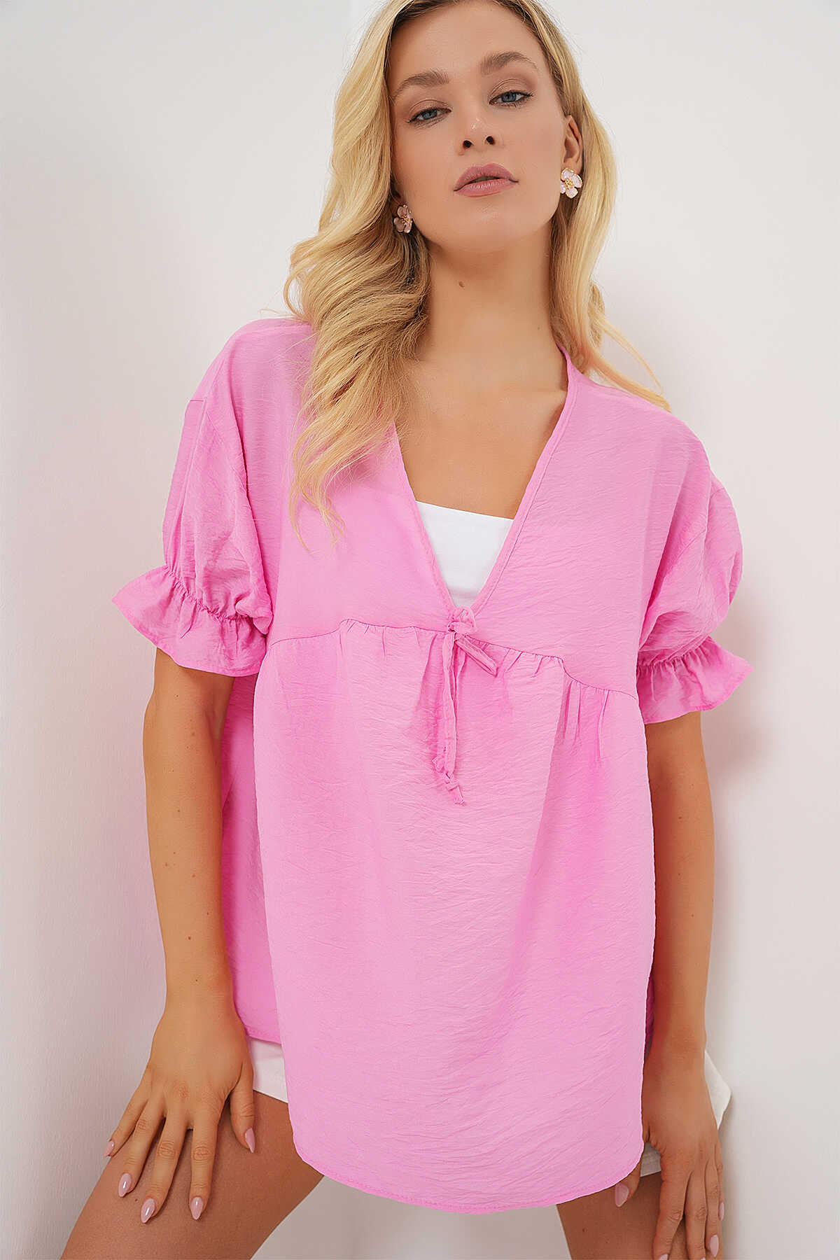 Kadın Önü Bağcıklı Kısa Kol Bluz 962 - Pembe - Kombin