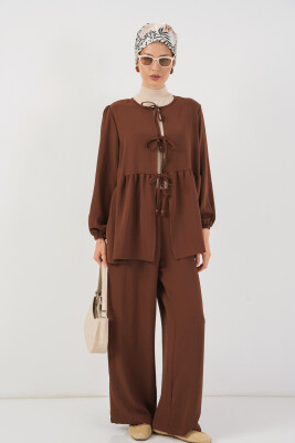 Kadın Önü Bağcıklı Tunik Pantolon İkili Takım 6744 - Kahverengi