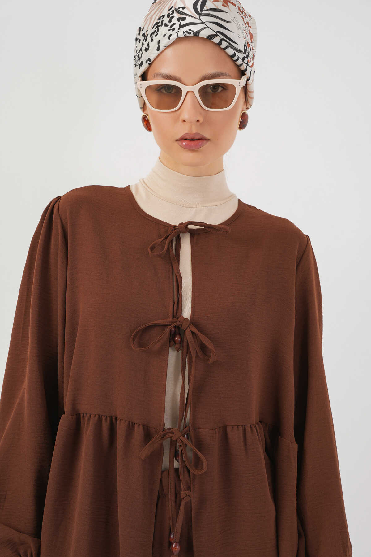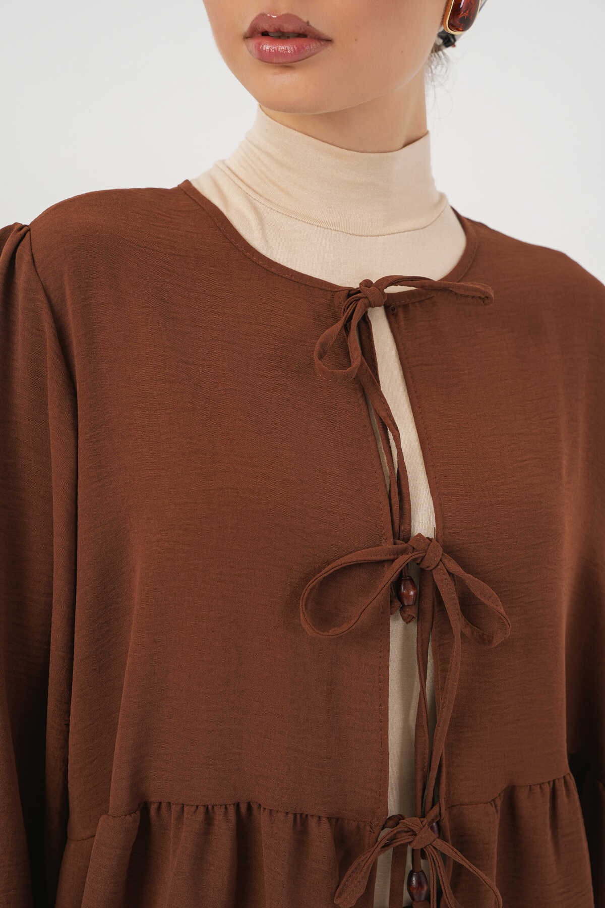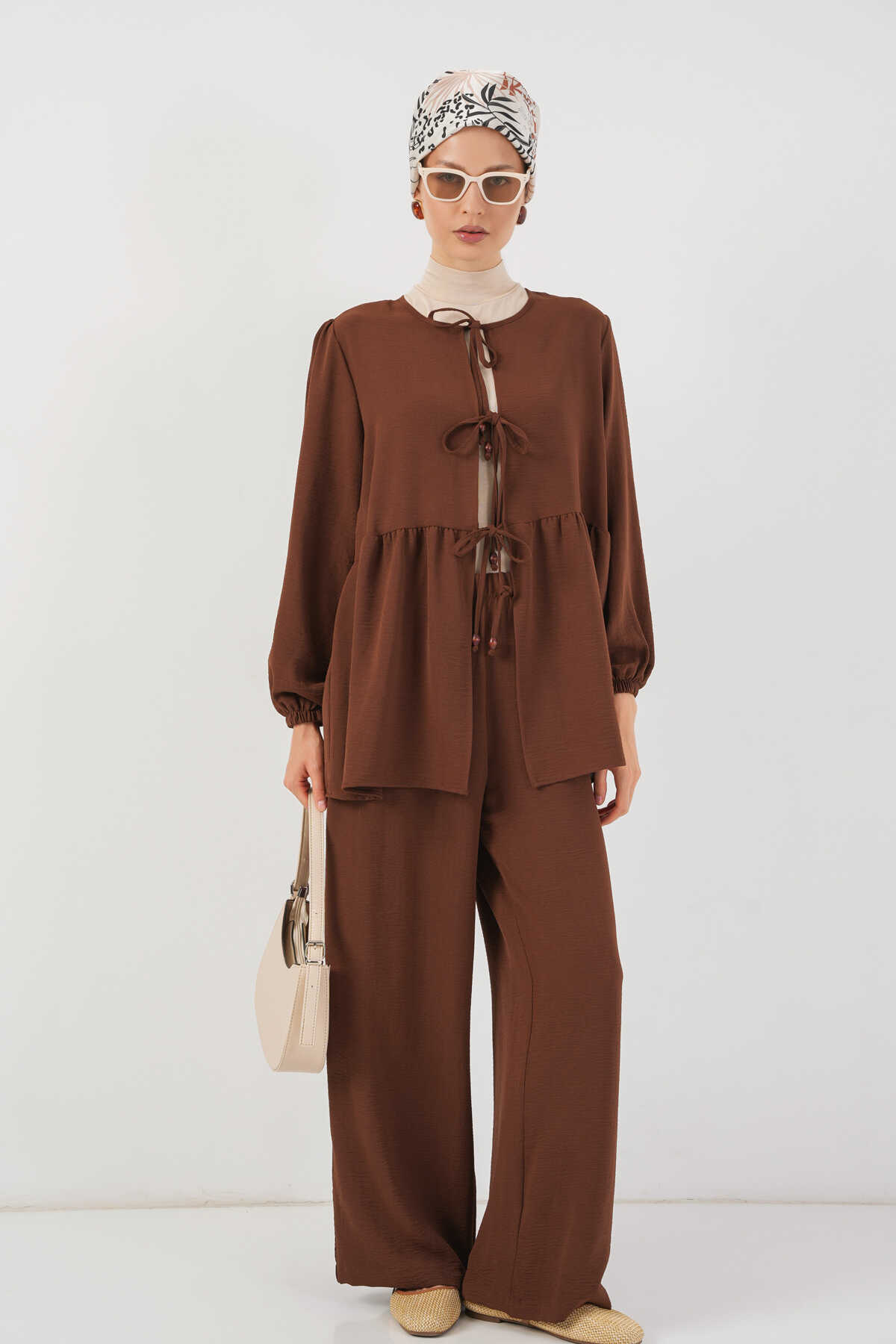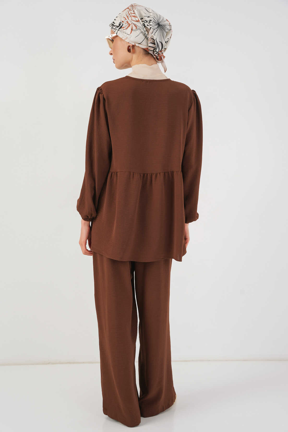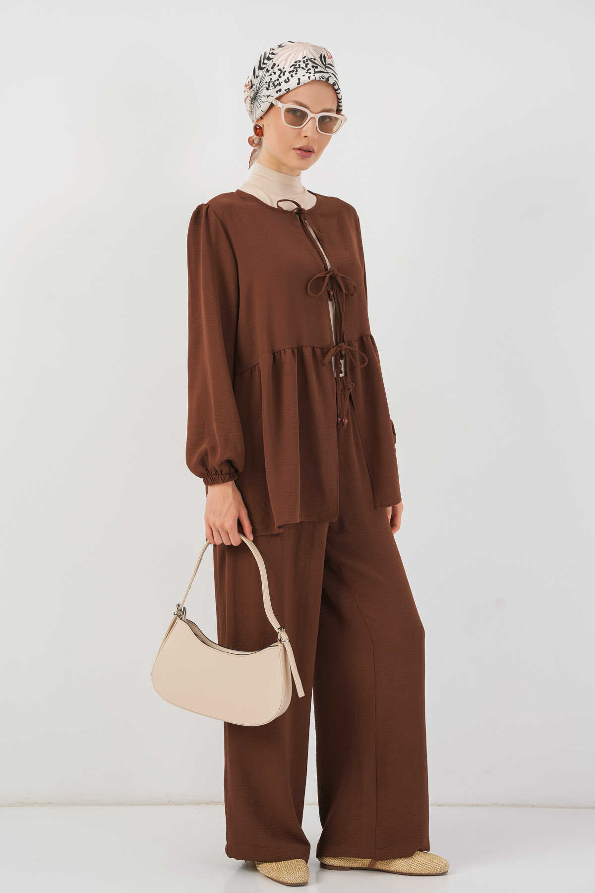 Kadın Önü Bağcıklı Tunik Pantolon İkili Takım 6744 - Kahverengi - Kombin