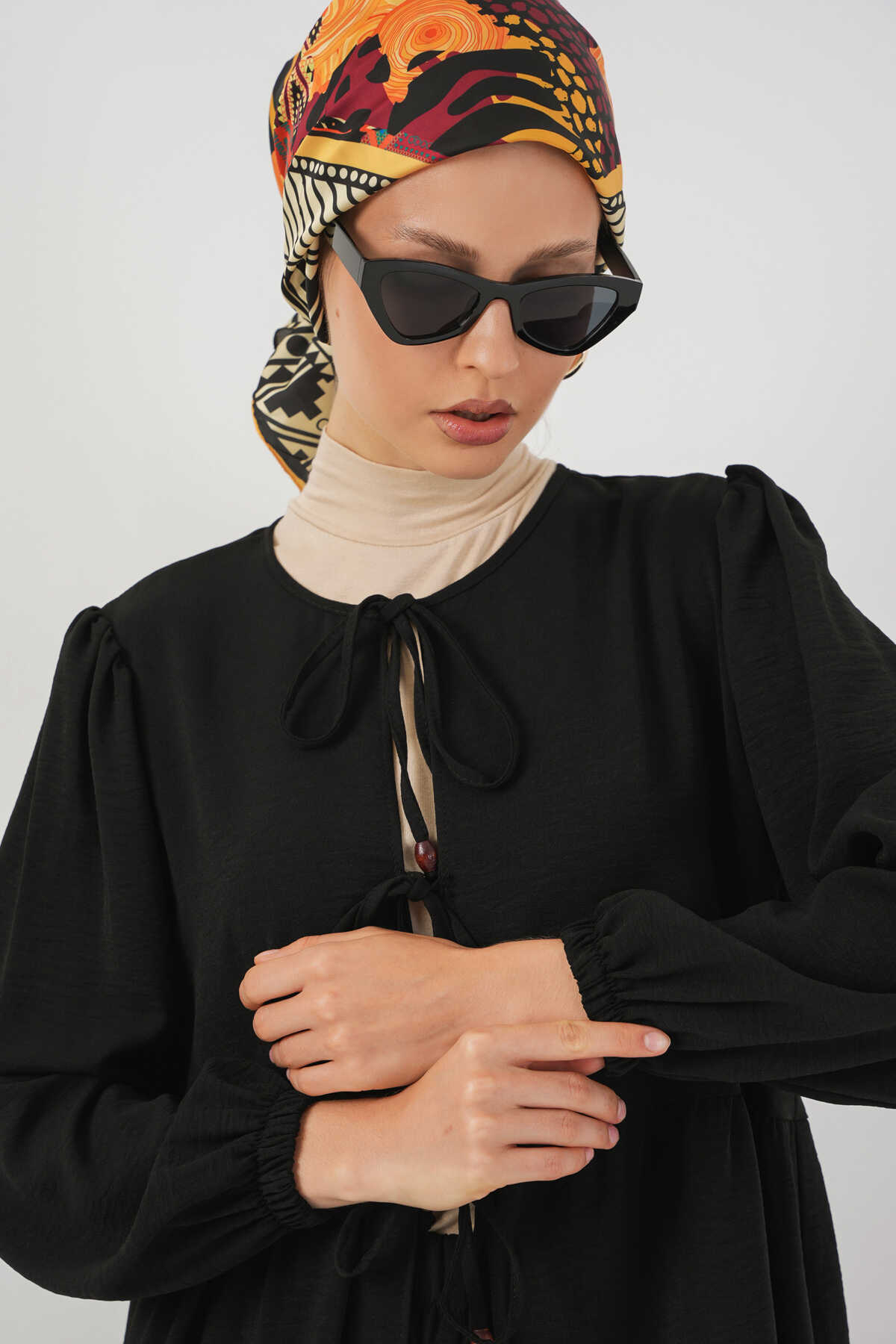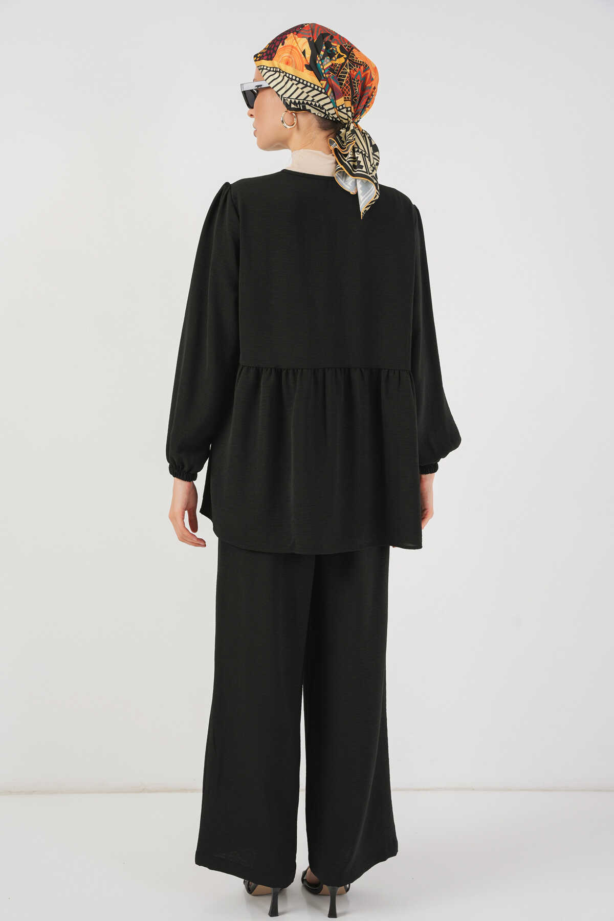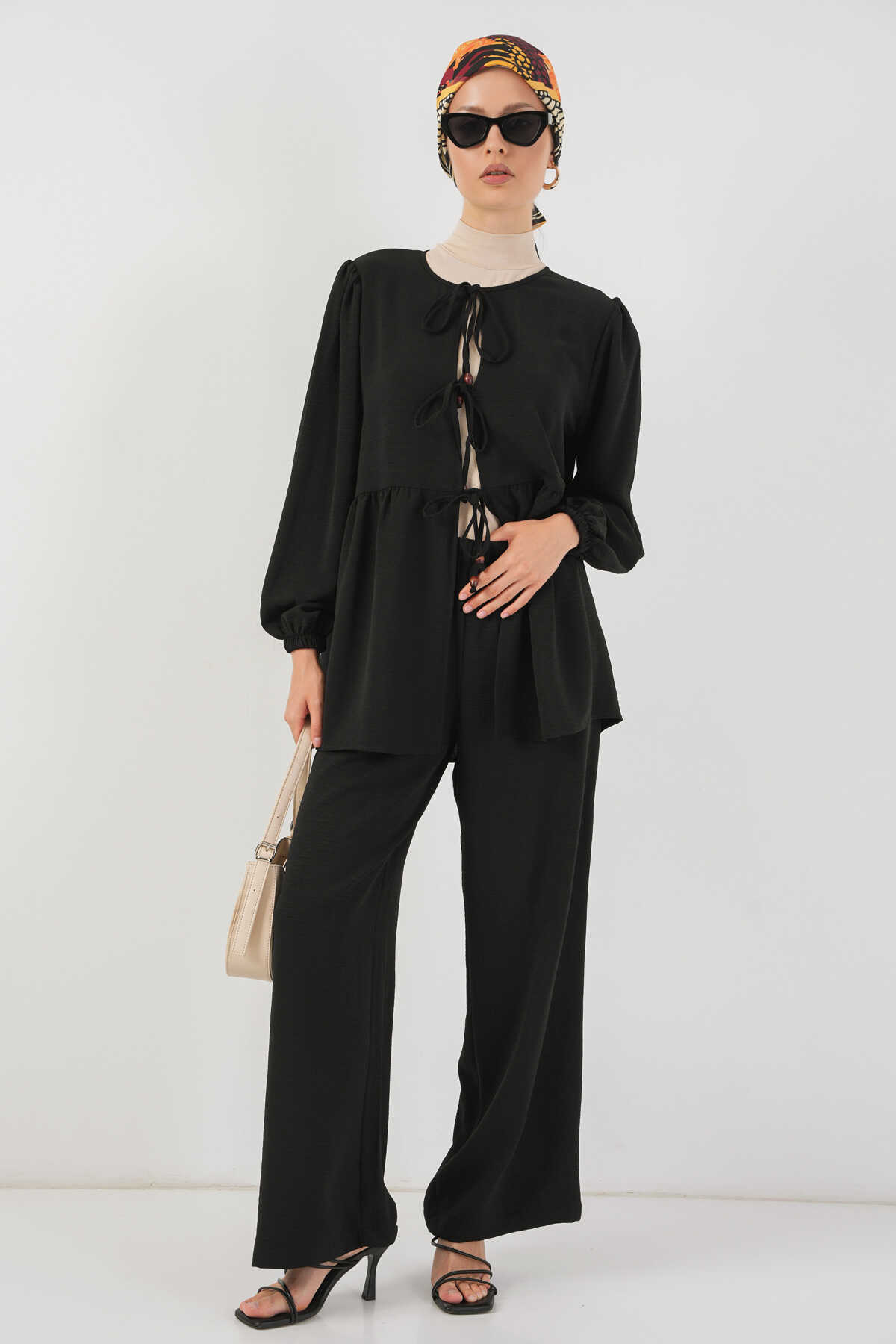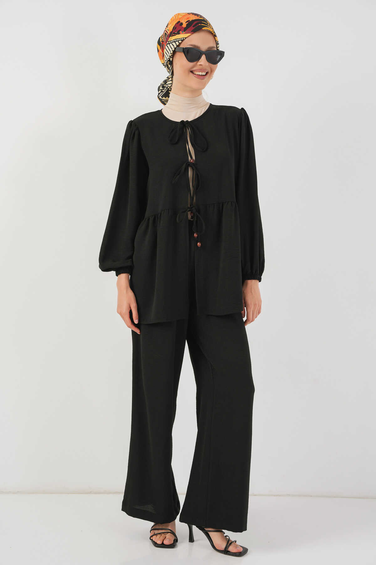 Kadın Önü Bağcıklı Tunik Pantolon İkili Takım 6744 - Siyah - Kombin