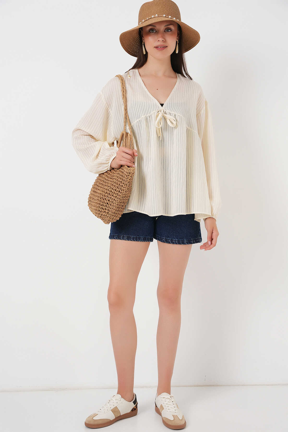 Kadın Önü Bağcıklı Uzun Kol Bluz 946 - Krem