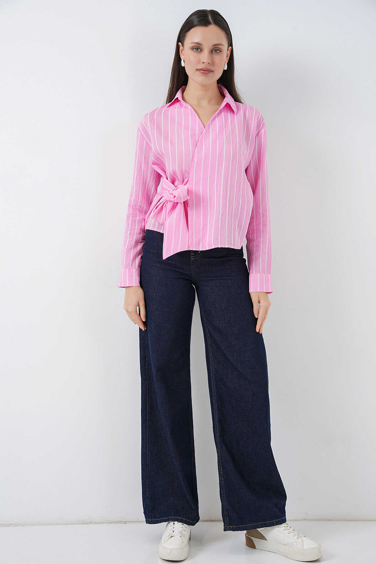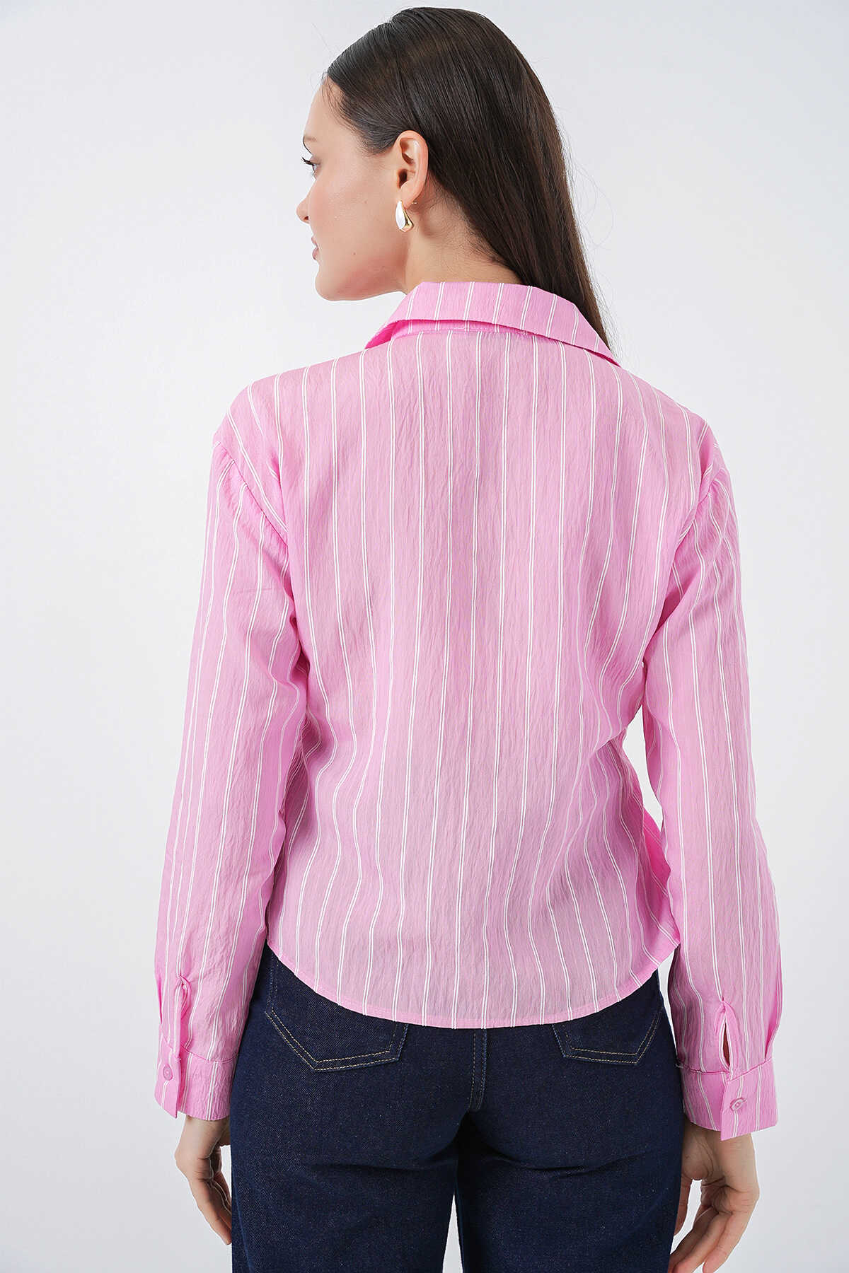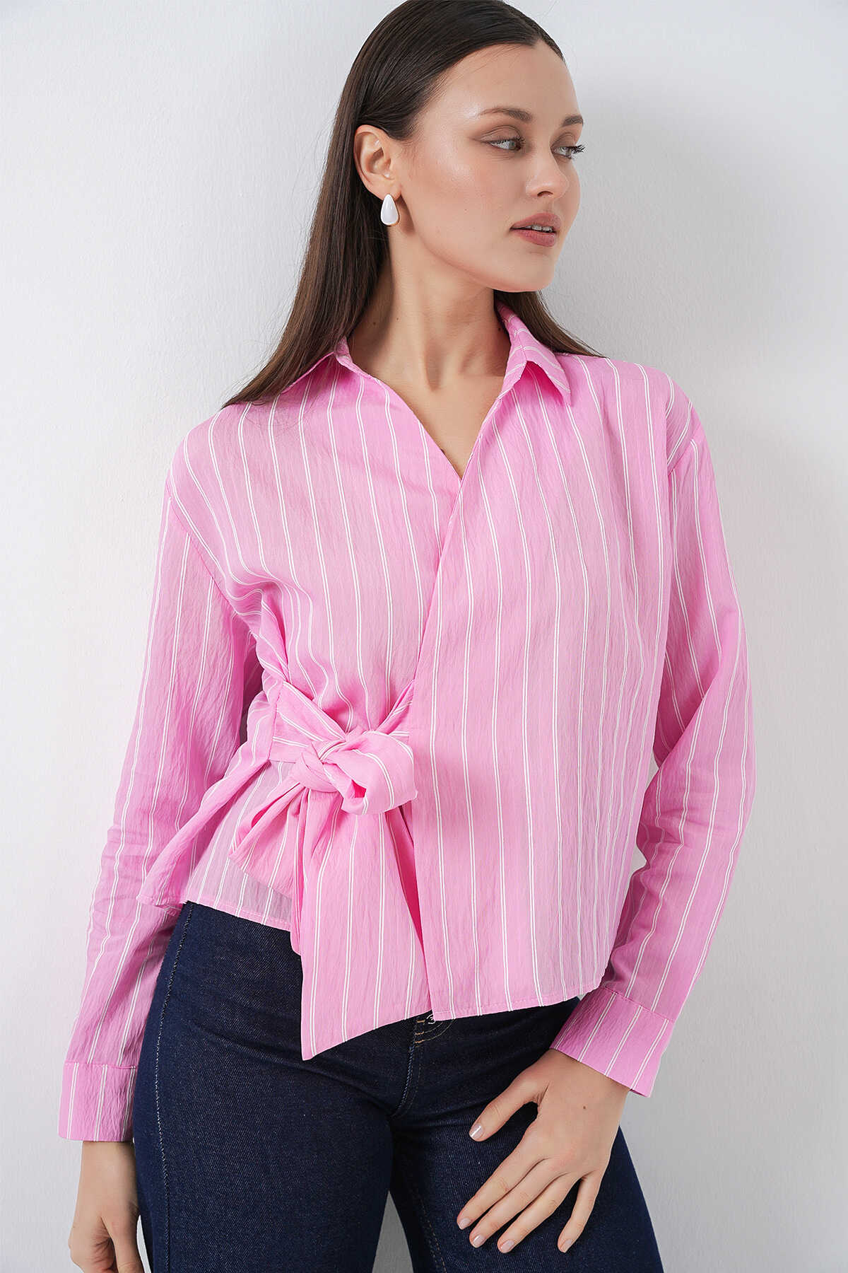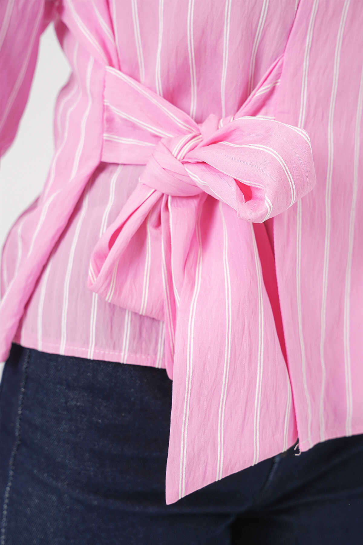 Kadın Önü Bağlamalı Çizgili Gömlek 20362 - Pembe - Kombin