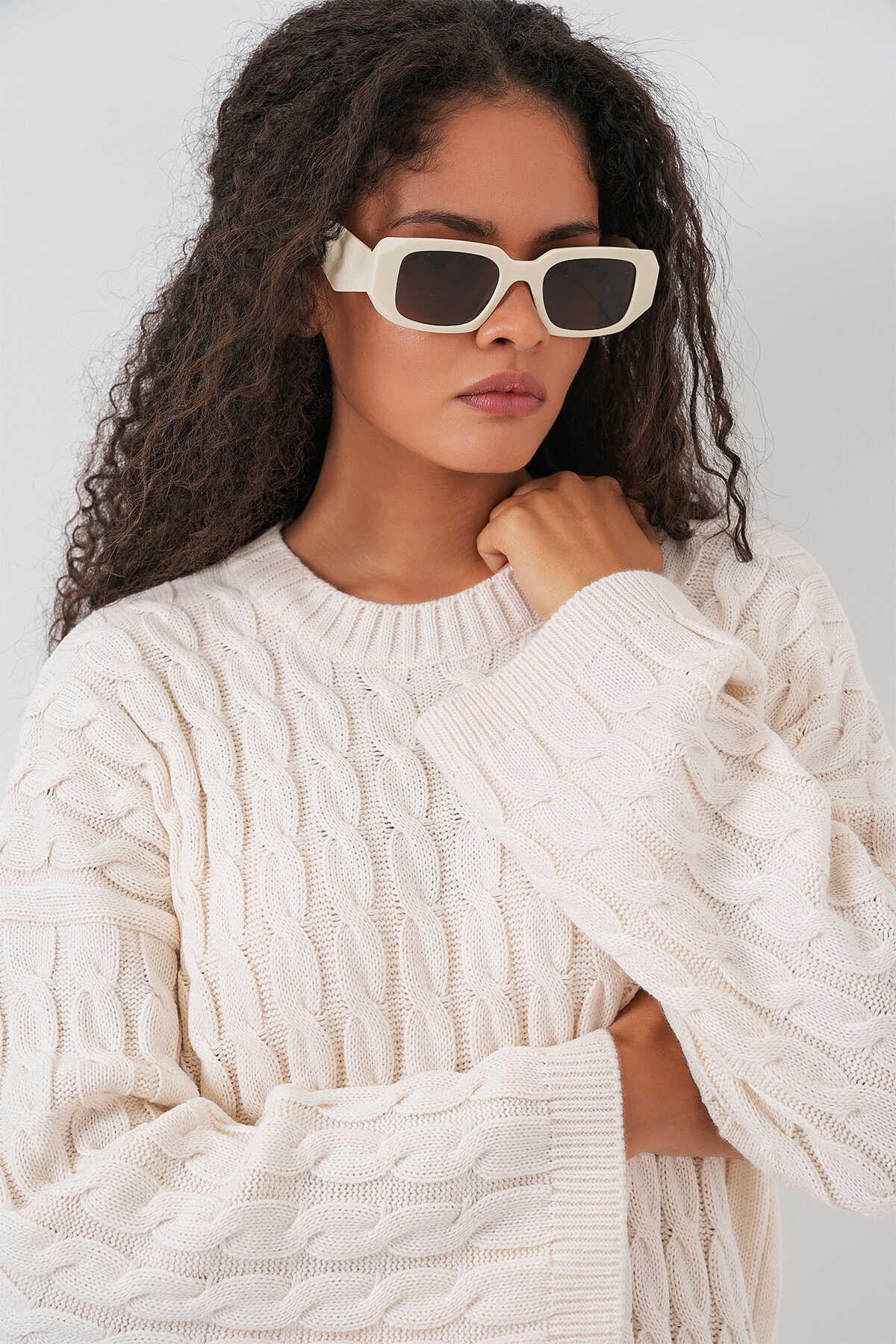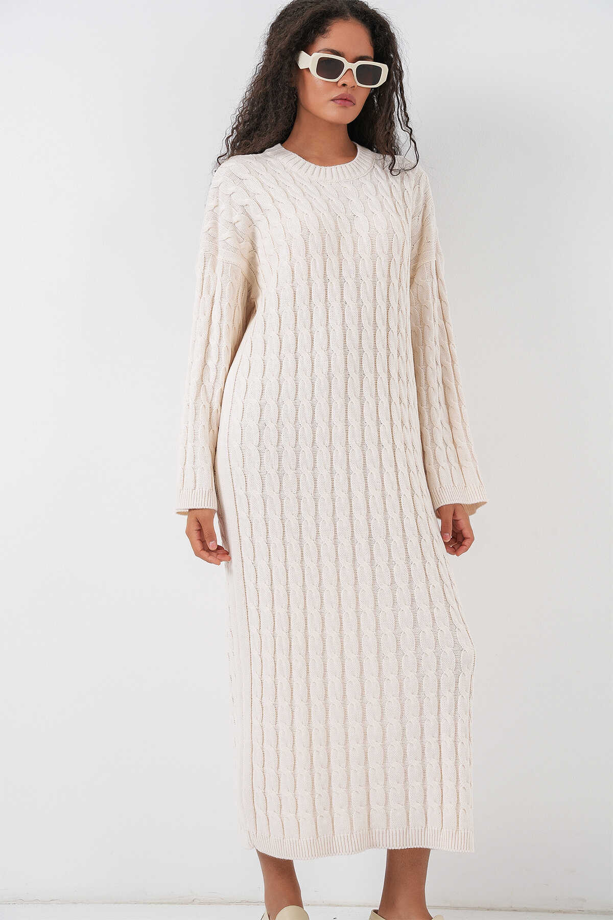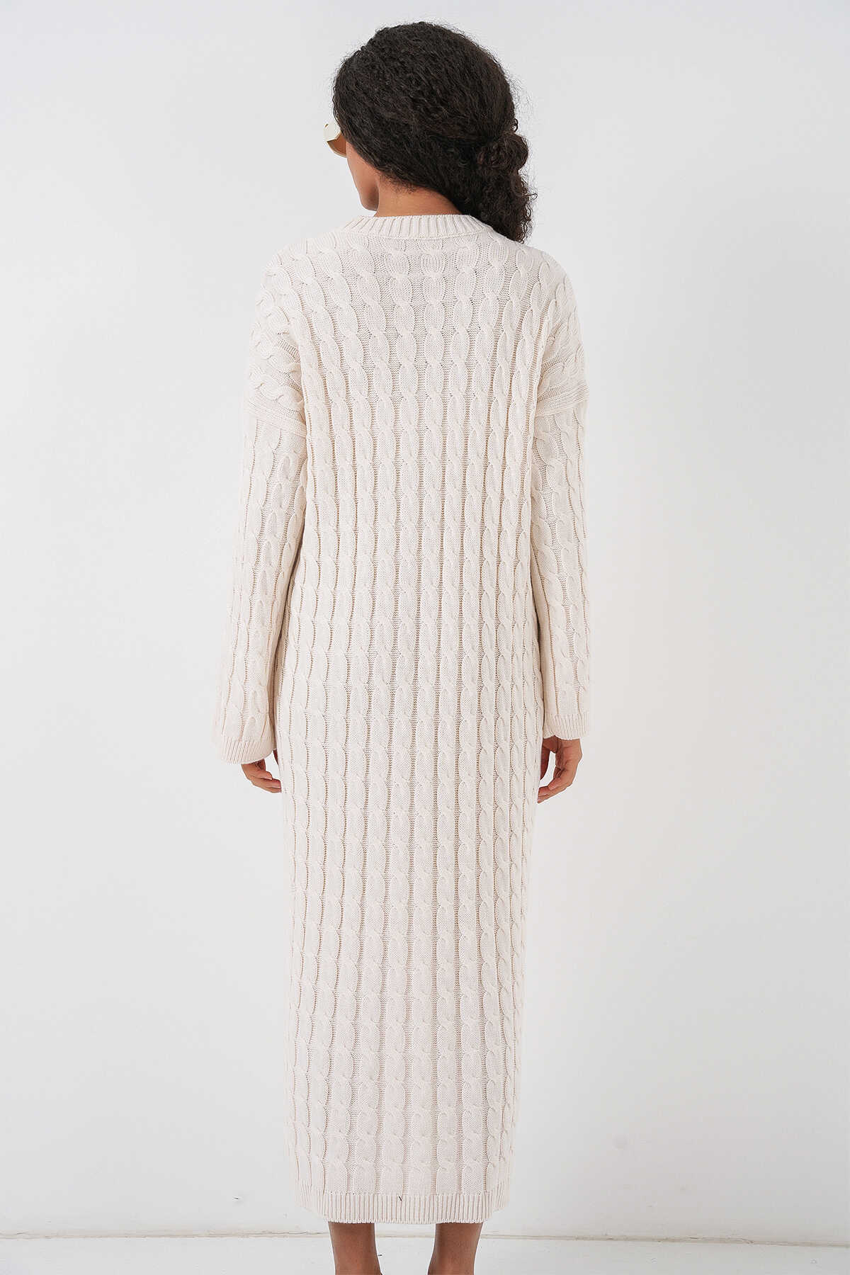 Kadın Örgülü Uzun Tiko Elbise 15944 - Ekru - Kombin