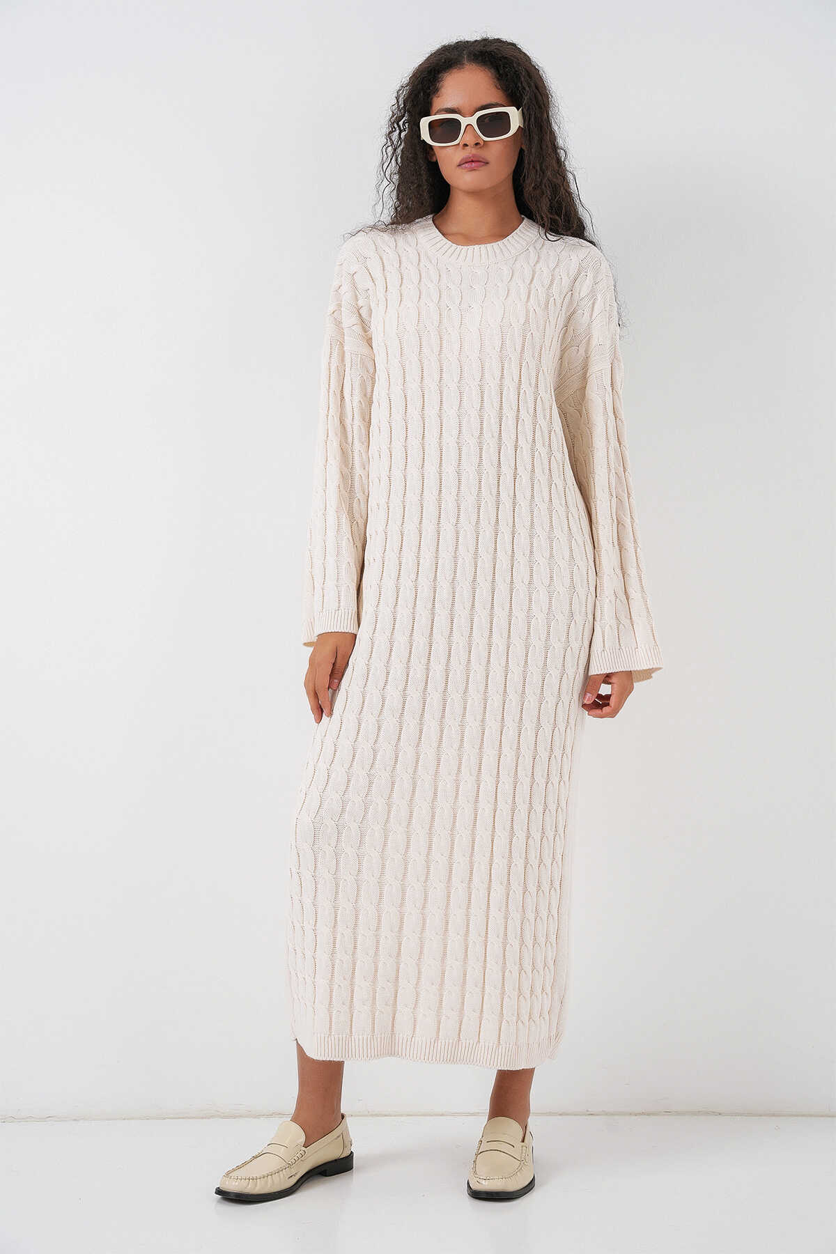 Kadın Örgülü Uzun Tiko Elbise 15944 - Ekru