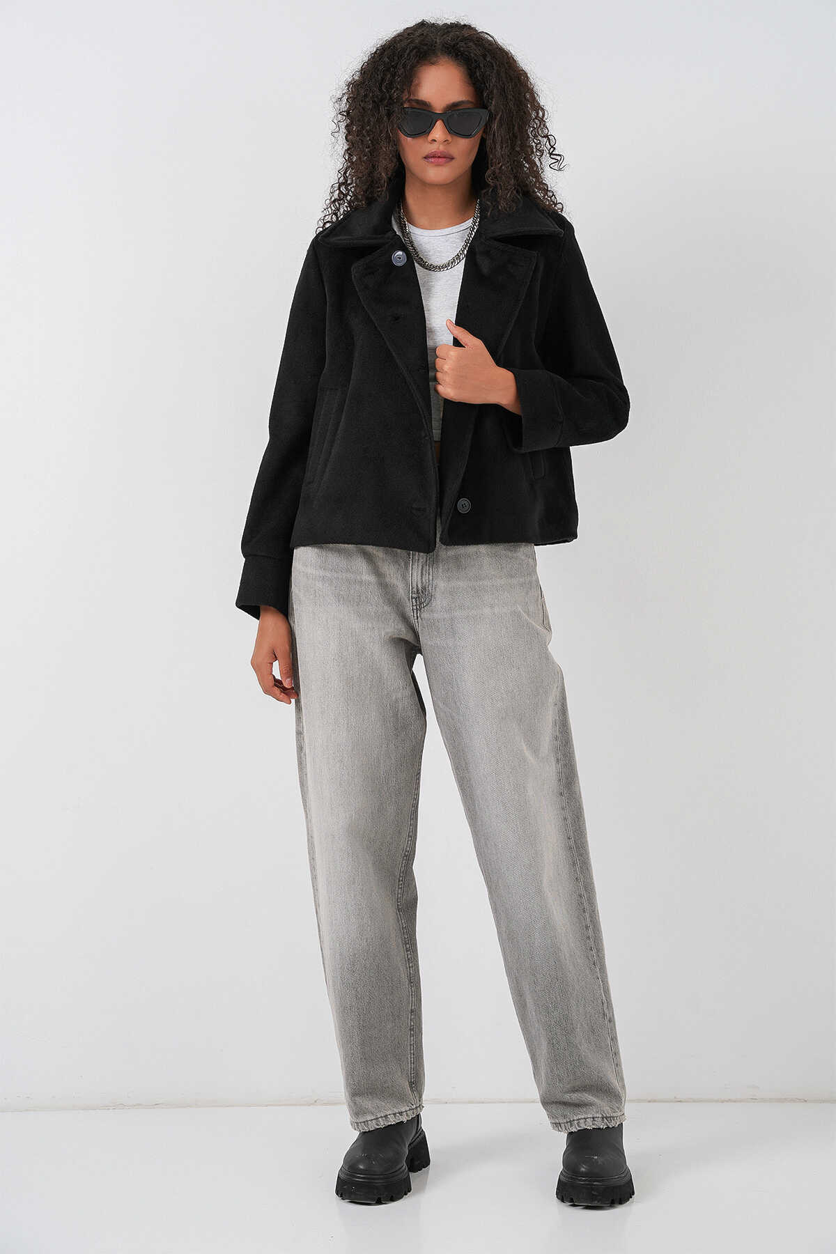 Kadın Oversize Astarlı Kısa Kaşe Ceket 0726 - Siyah - Kombin