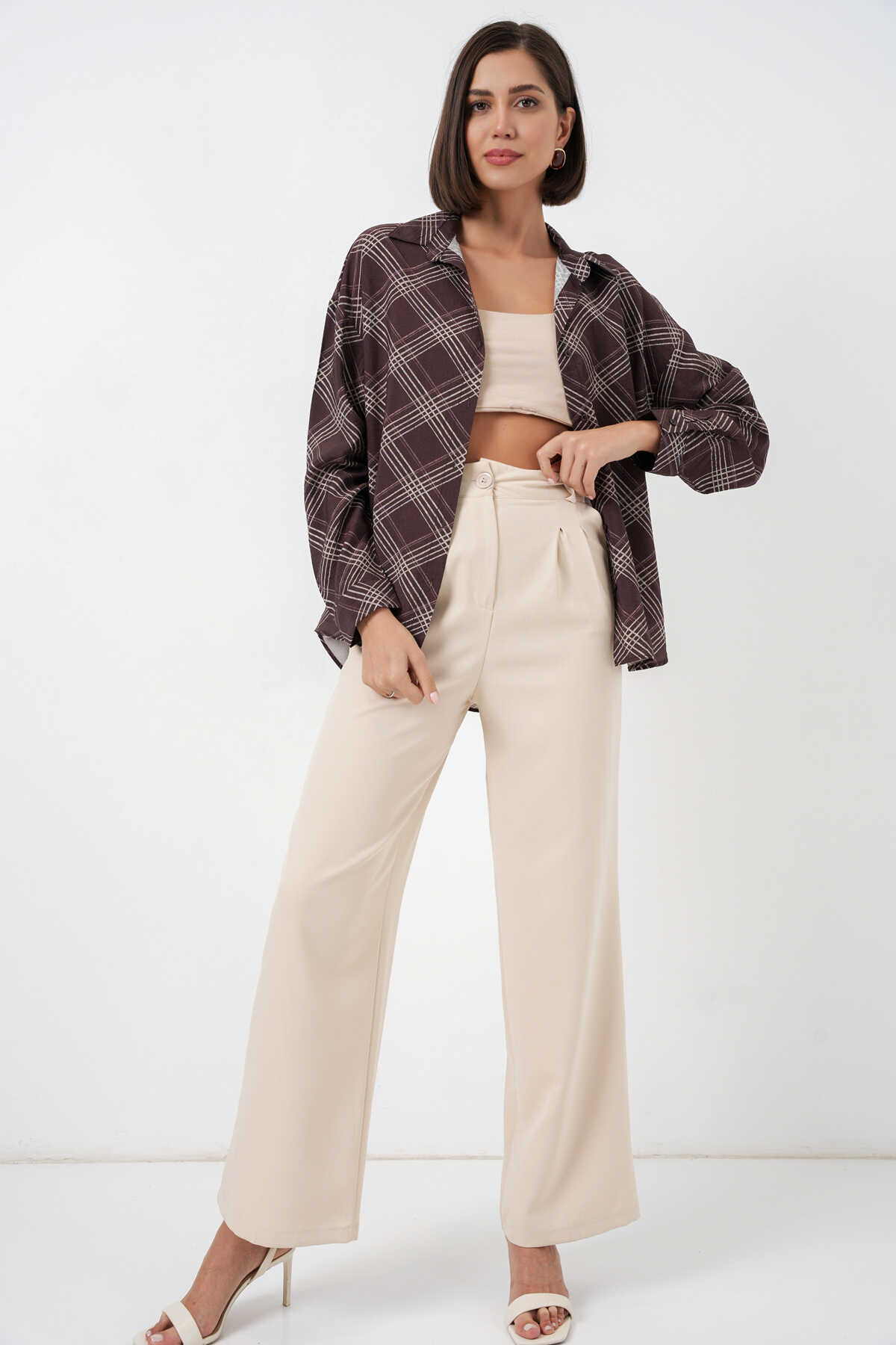 Kadın Oversize Desenli Gömlek 20372 - Kahverengi - Kombin