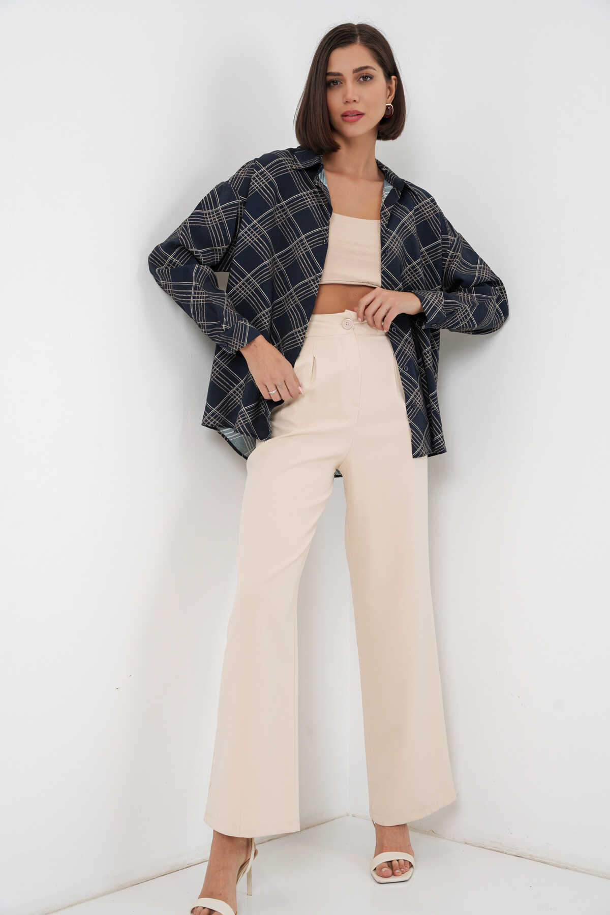 Kadın Oversize Desenli Gömlek 20372 - Lacivert - Kombin