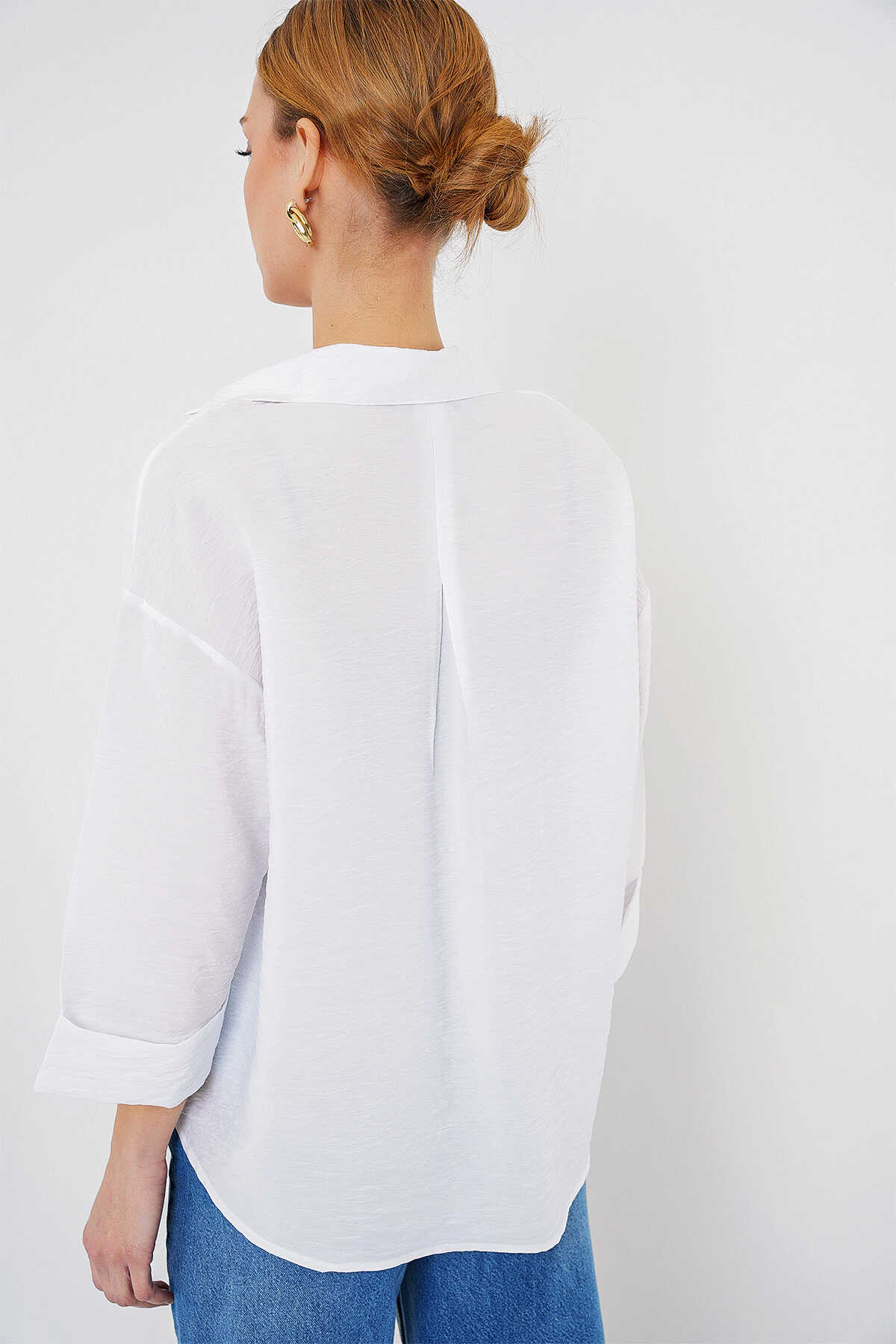 Kadın Oversize Kısa Kol Gömlek 20315 - Beyaz - Kombin