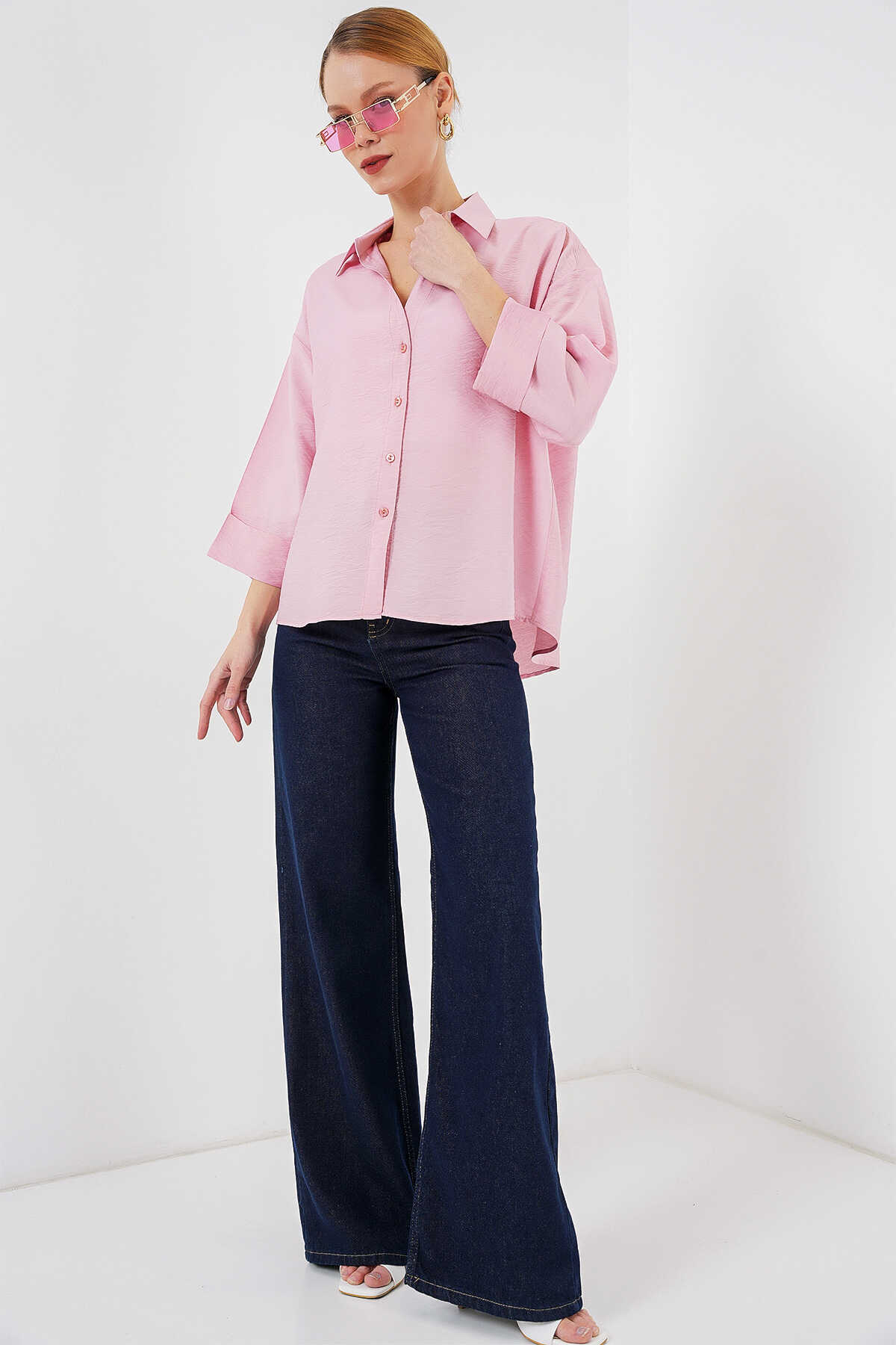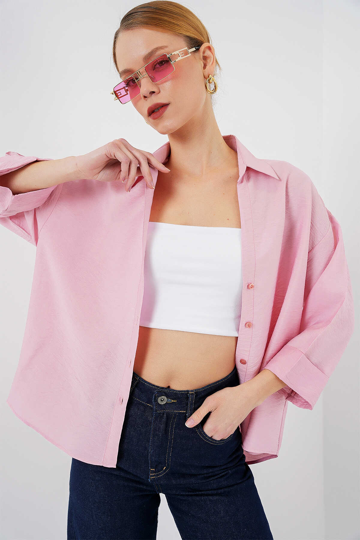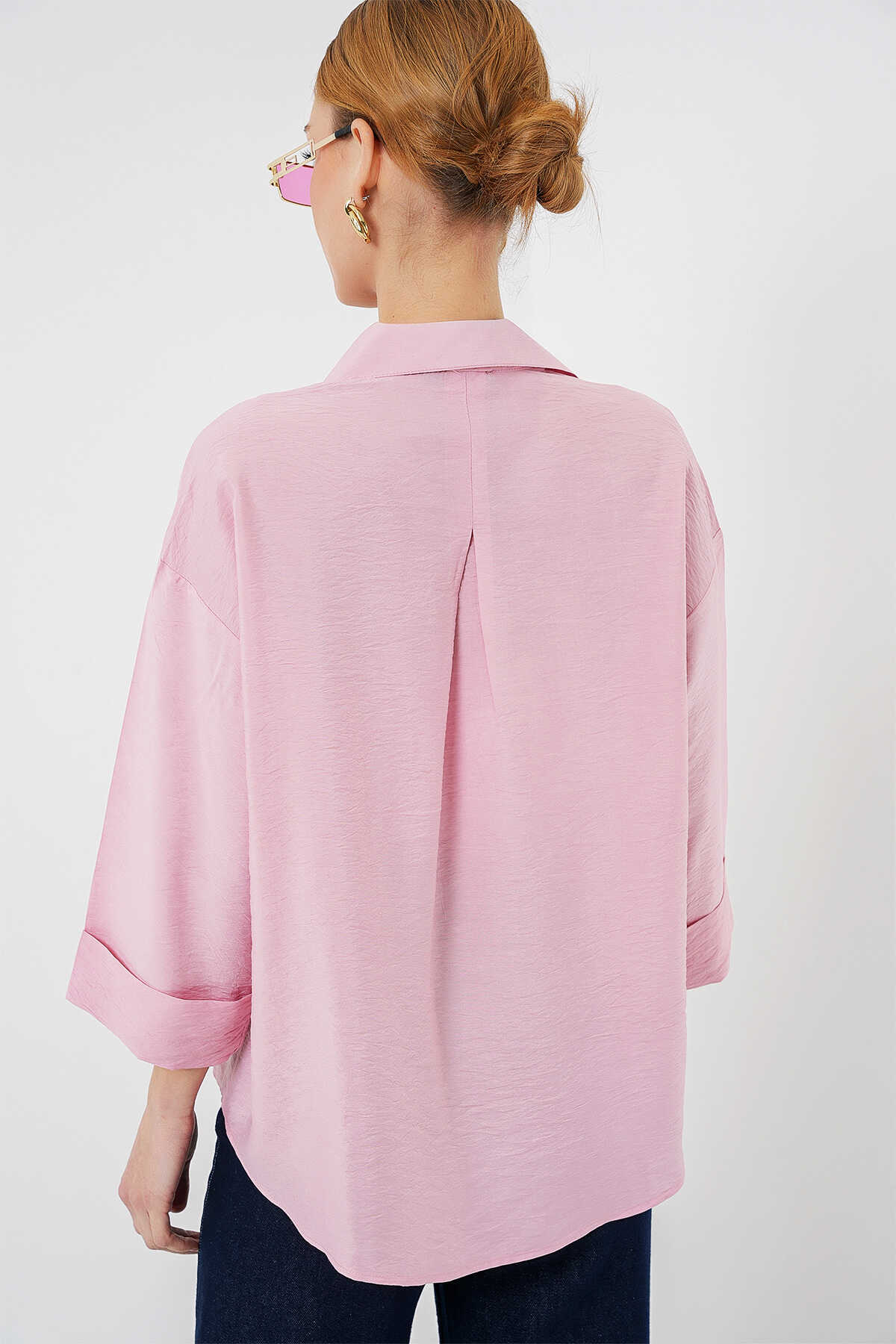 Kadın Oversize Kısa Kol Gömlek 20315 - Pembe - Kombin