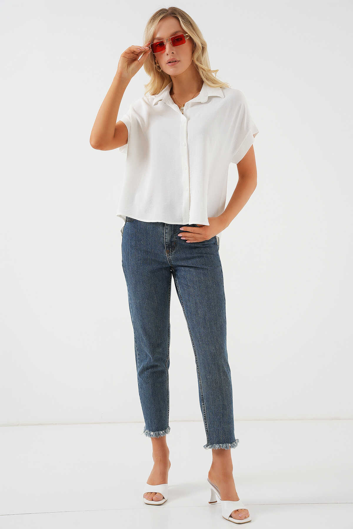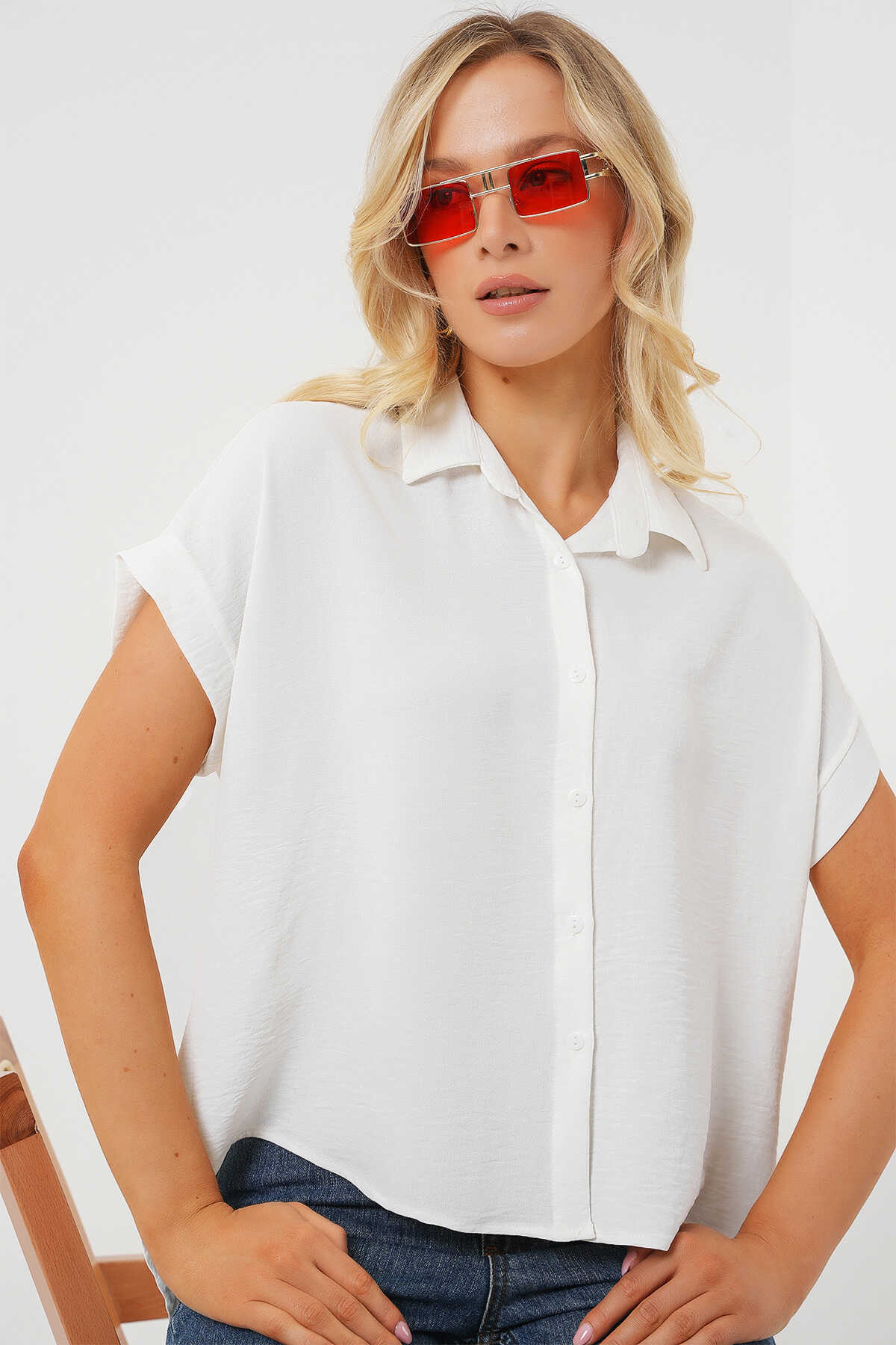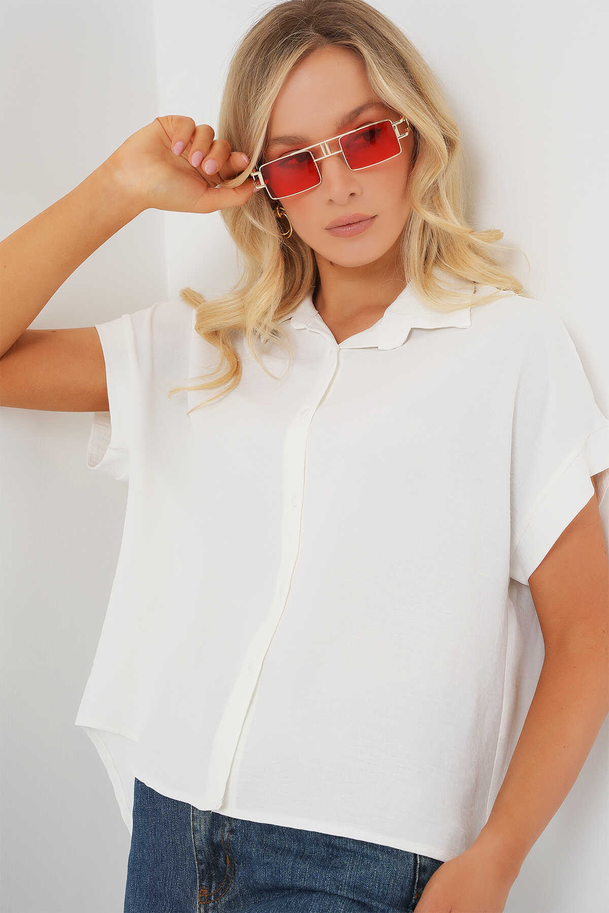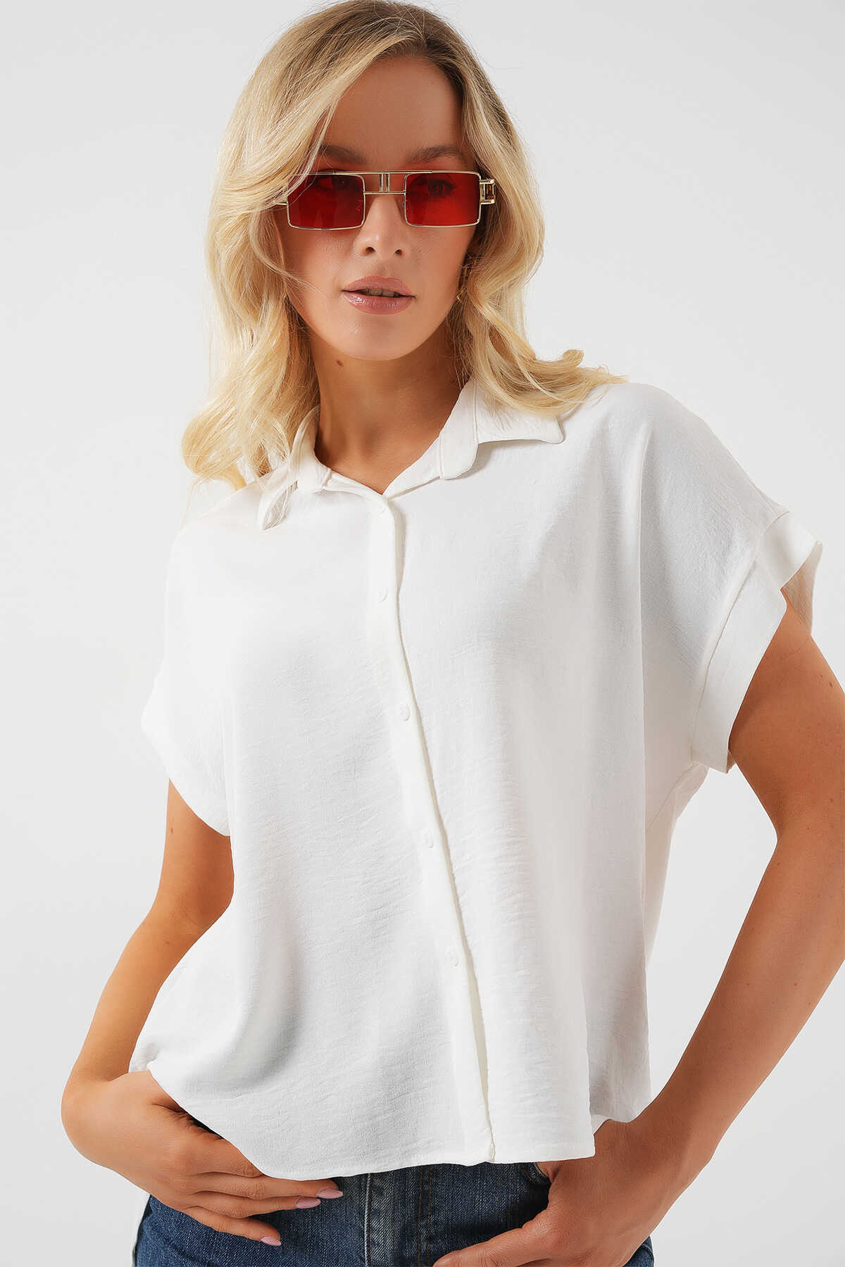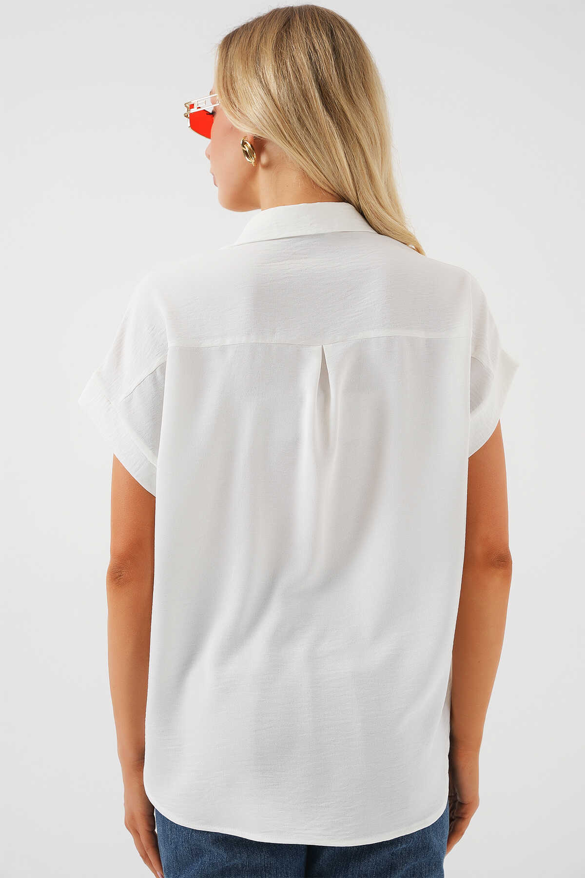 Kadın Oversize Kısa Kol Gömlek 20322 - Beyaz - Kombin