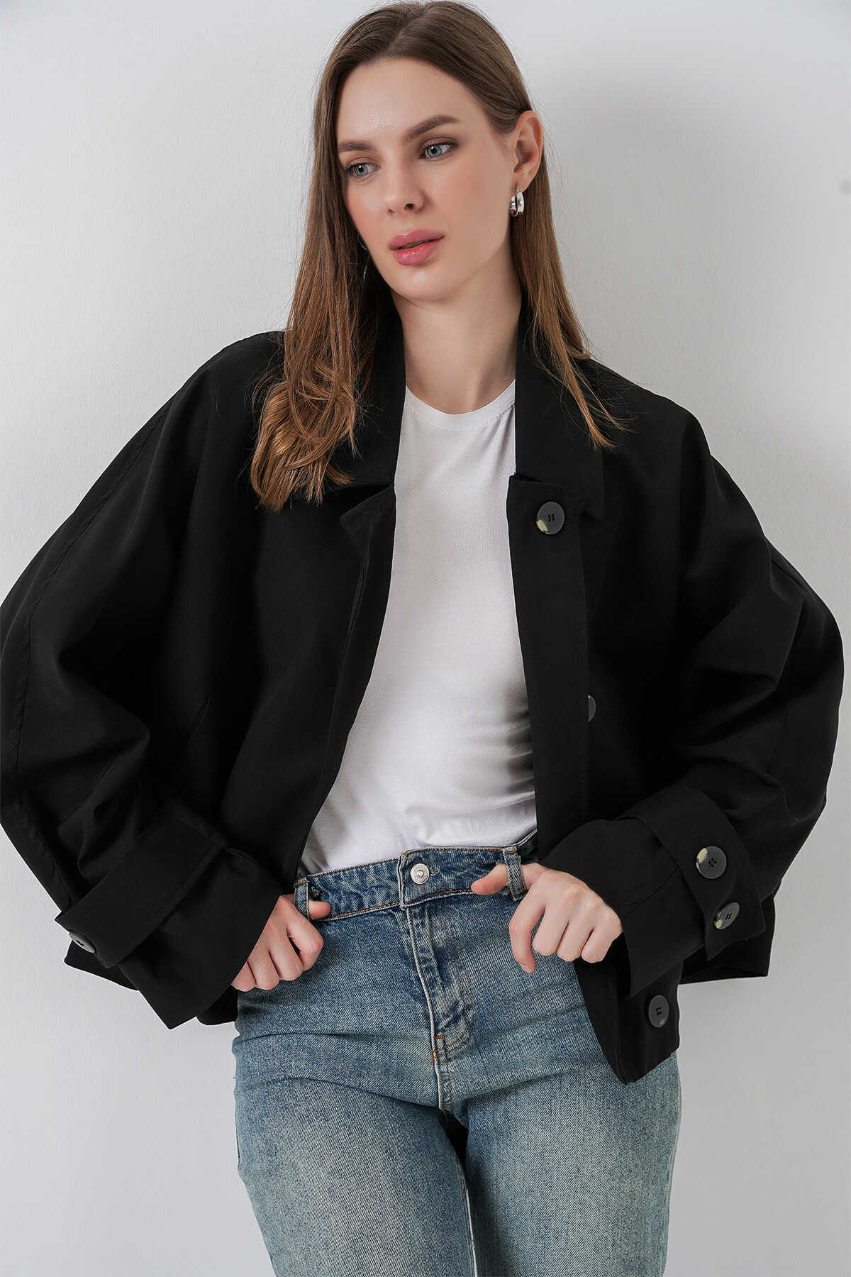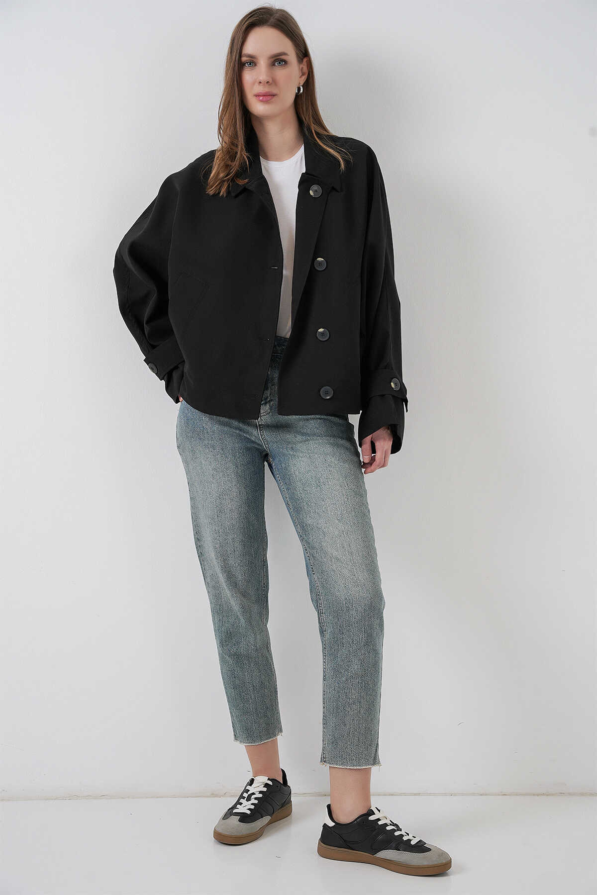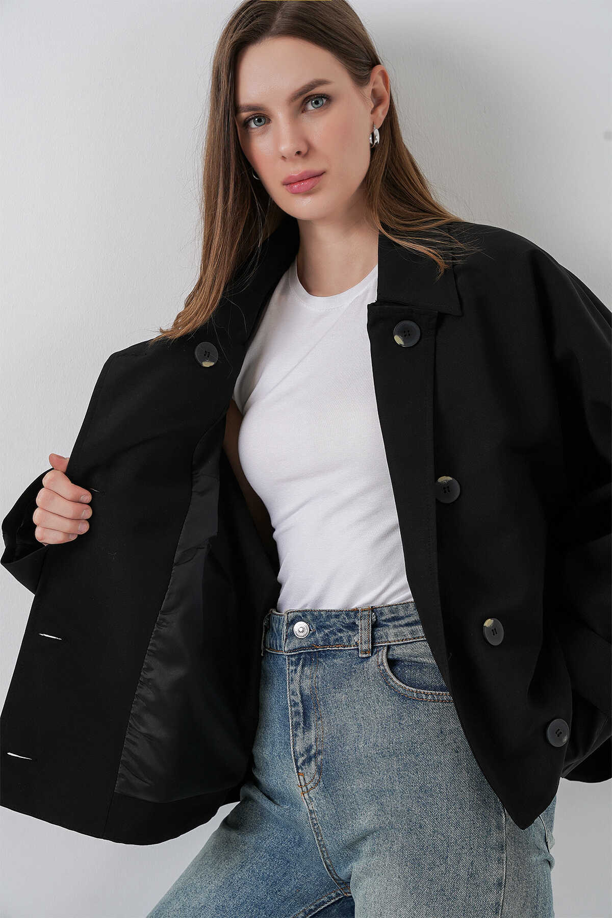 Kadın Oversize Kısa Trençkot 5977 - Siyah - Kombin