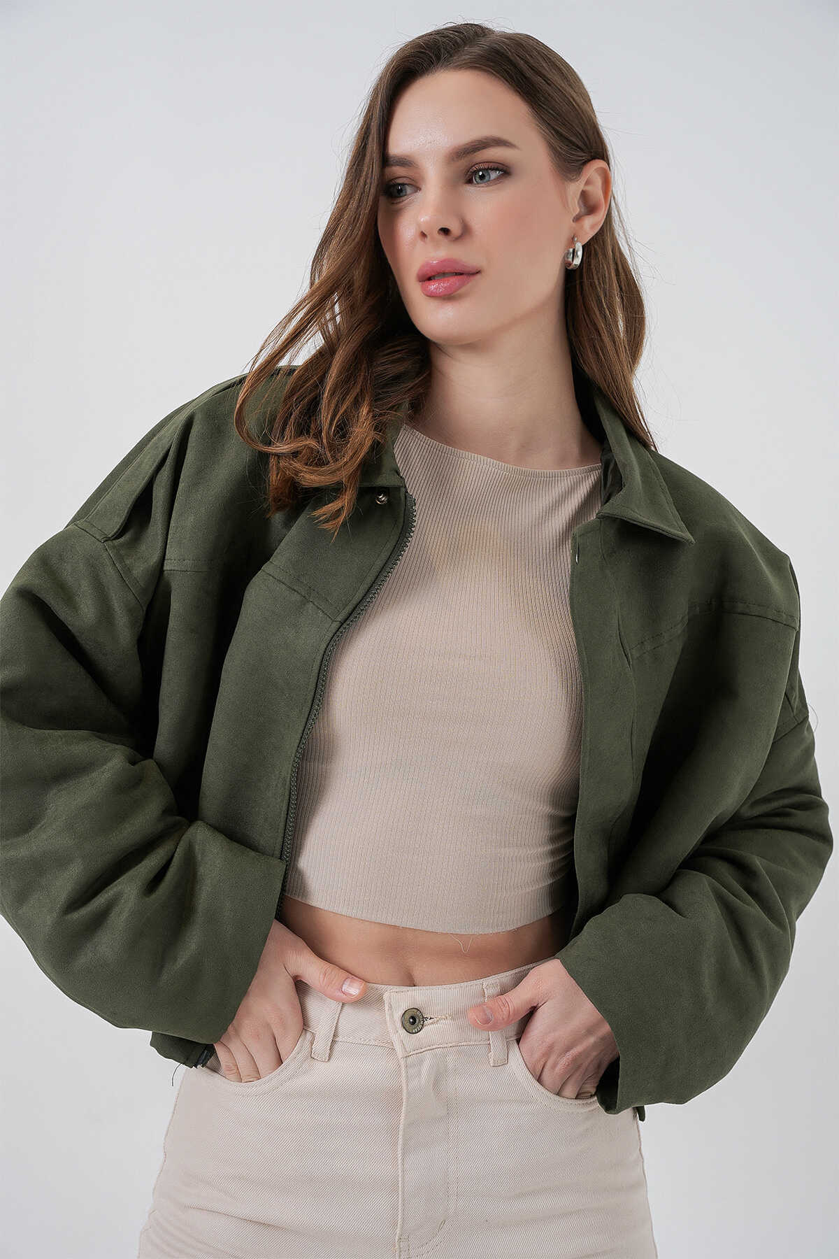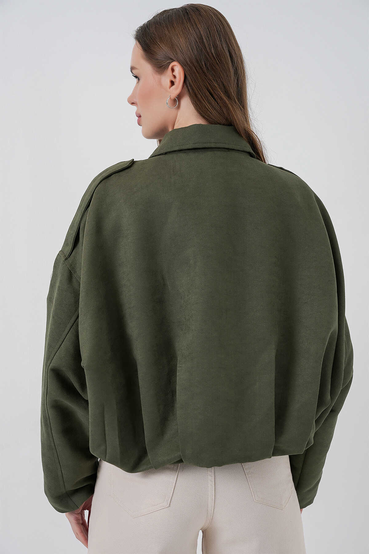 Kadın Oversize Süet Ceket 1055 - A.Haki - Kombin