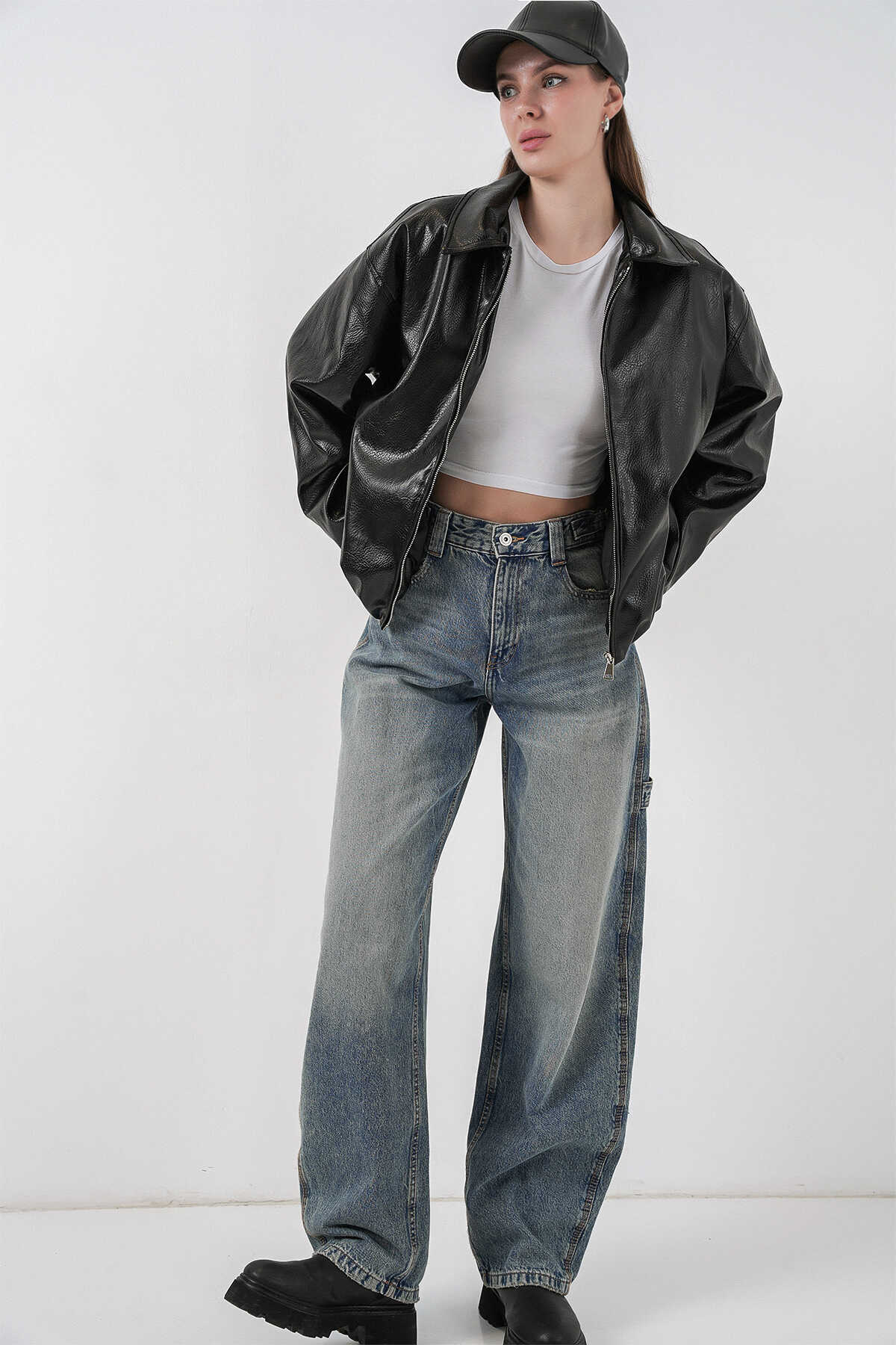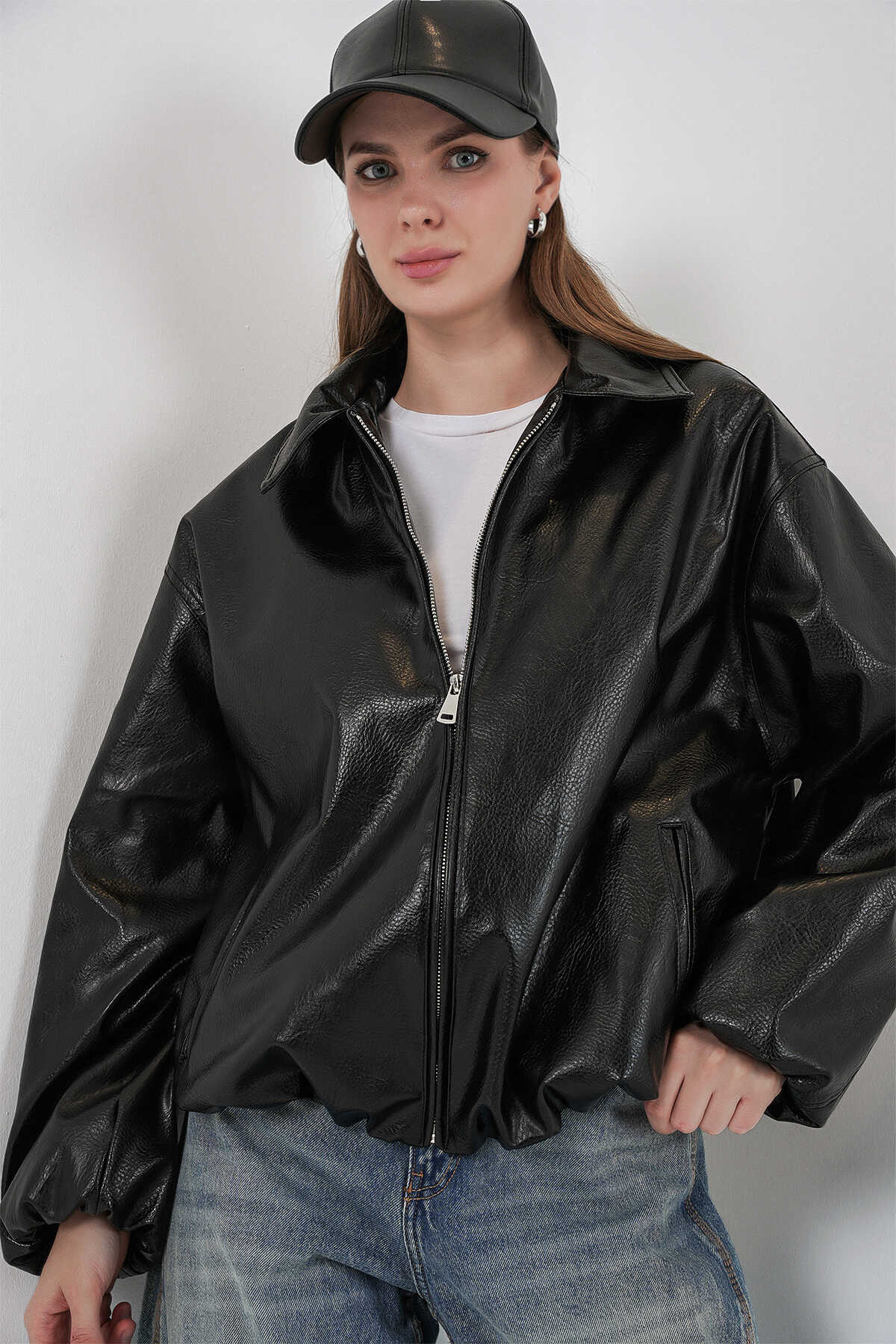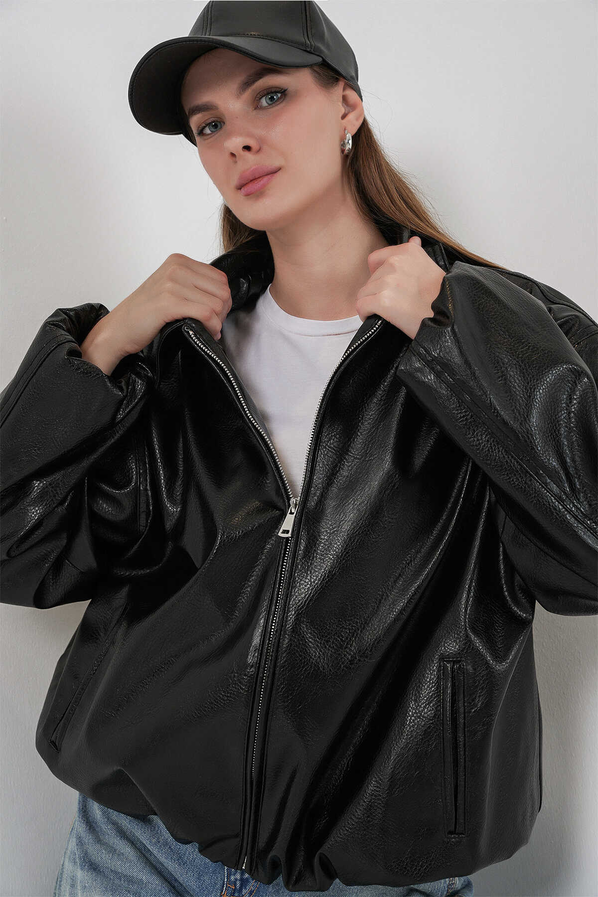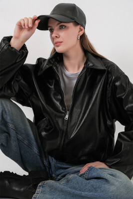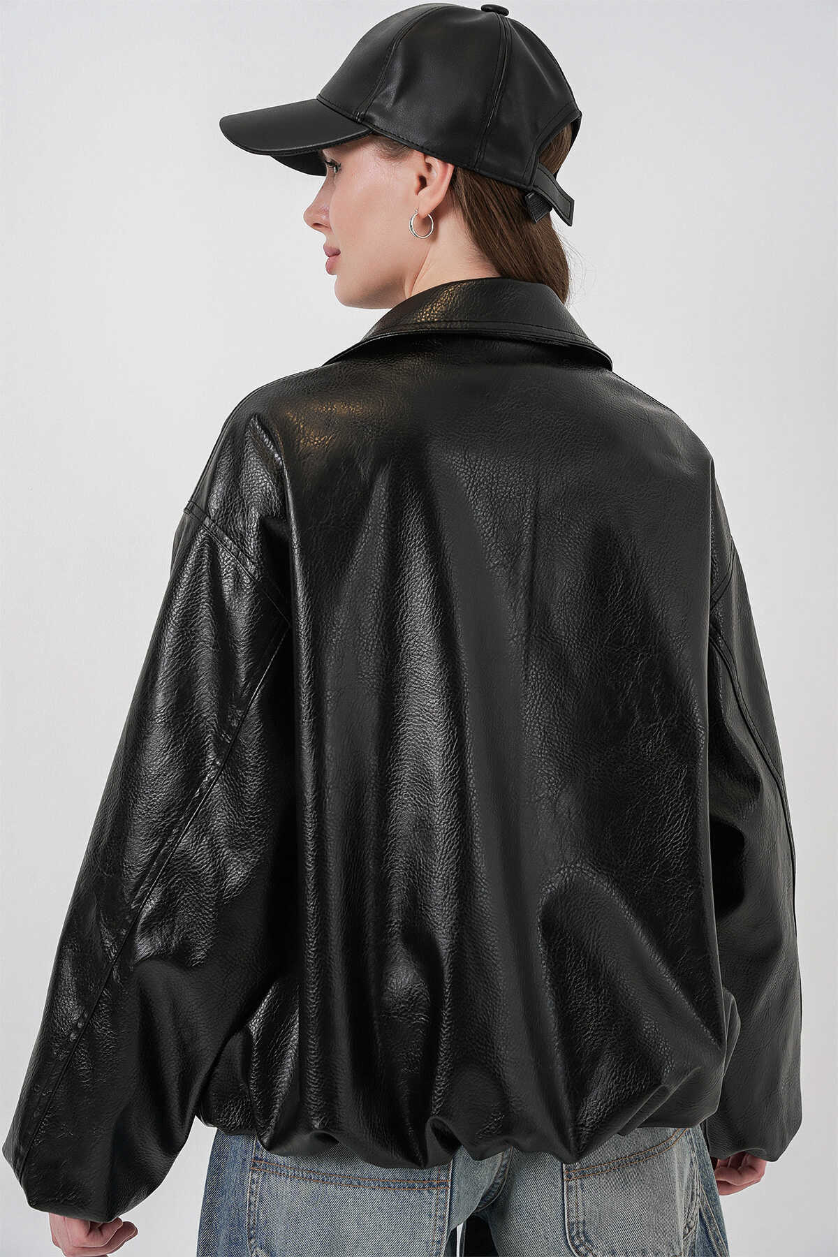 Kadın Oversize Suni Deri Ceket 1049 - Siyah - Kombin
