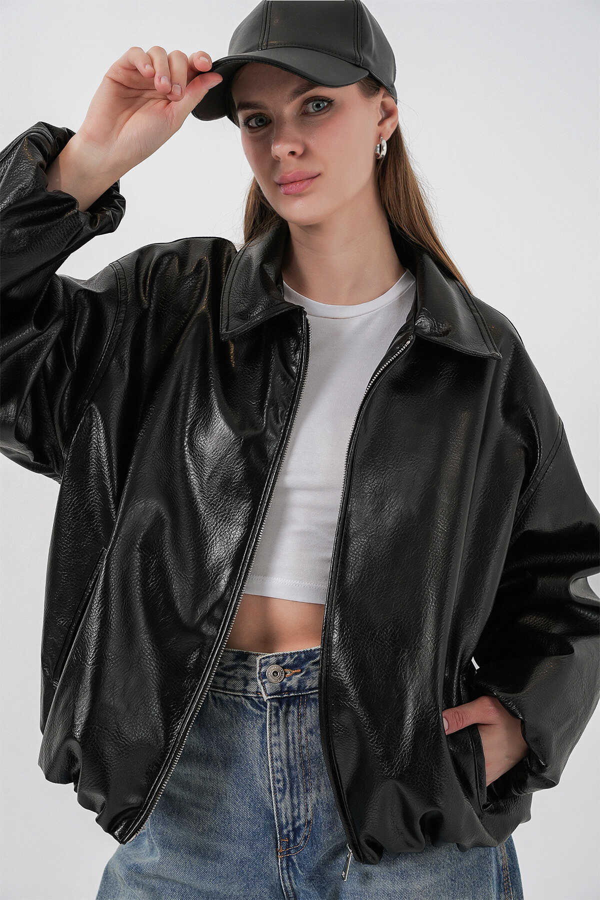 Kadın Oversize Suni Deri Ceket 1049 - Siyah
