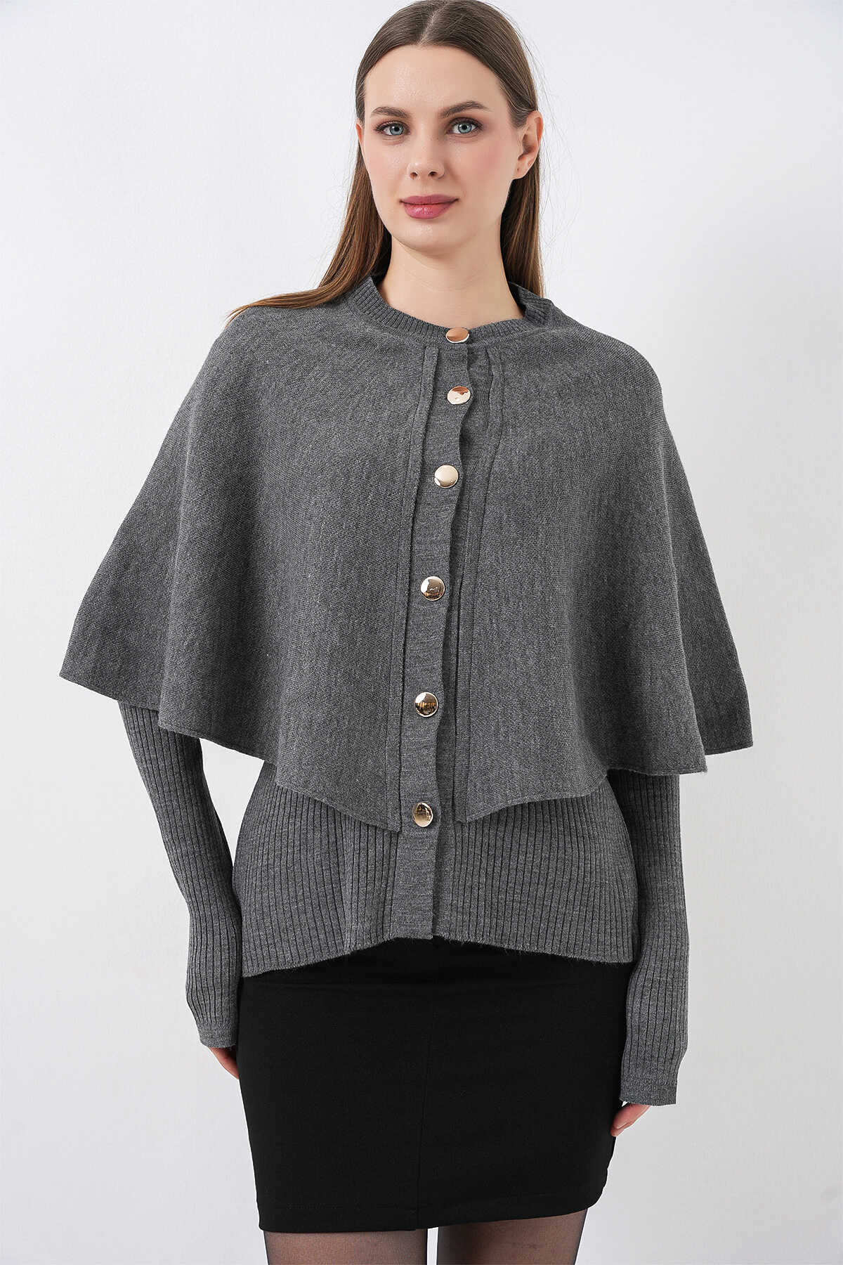 Kadın Pelerinli Triko Hırka 15967 - Antrasit - Kombin