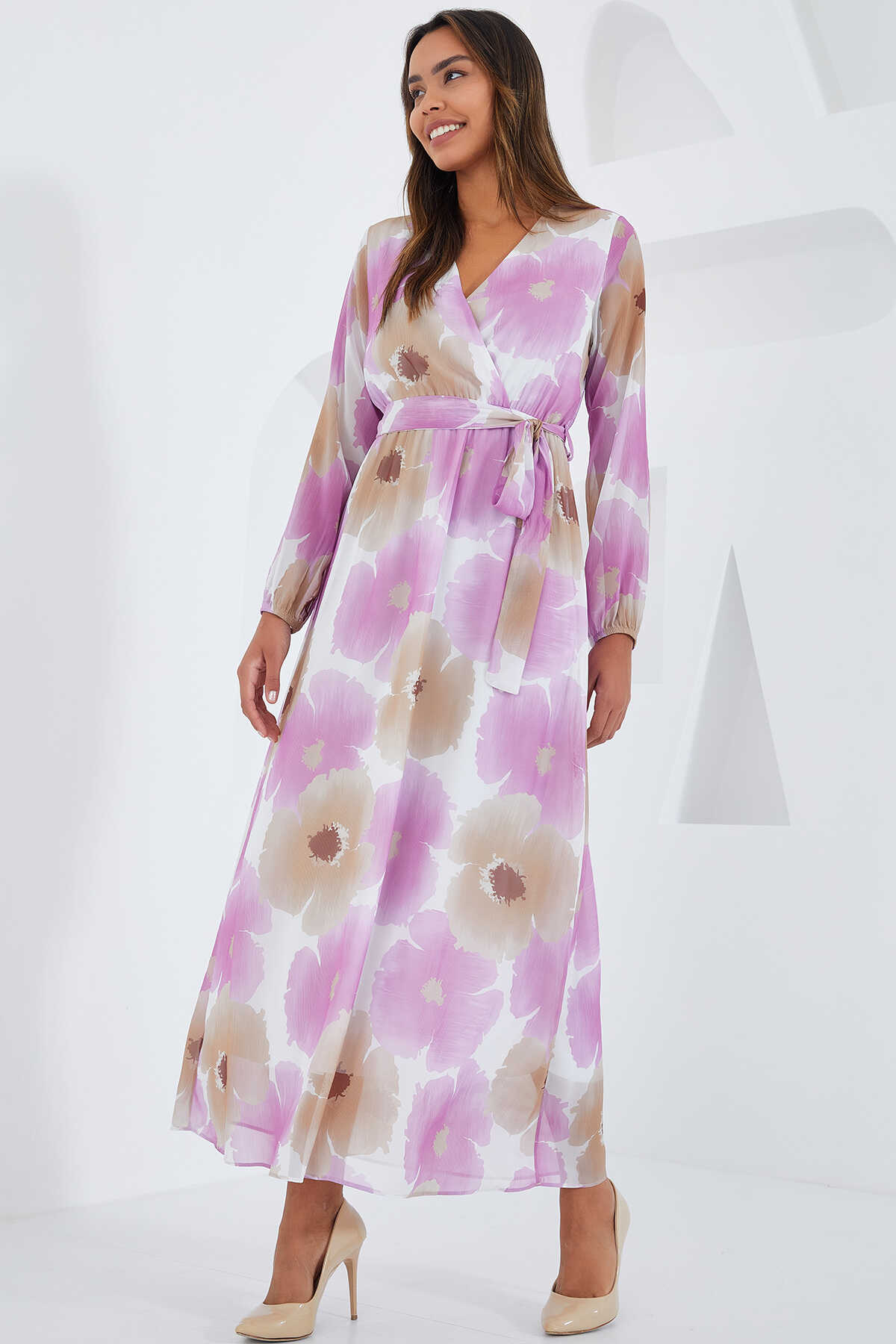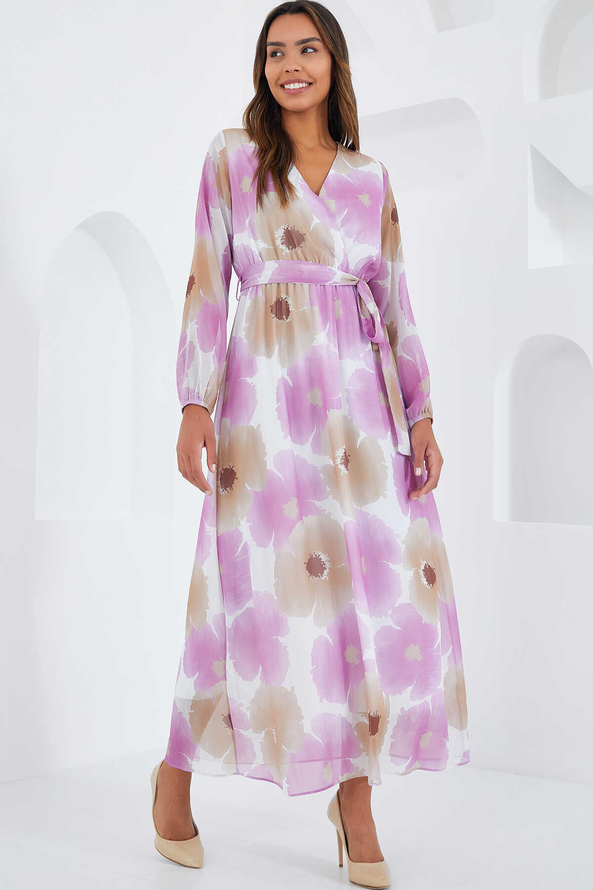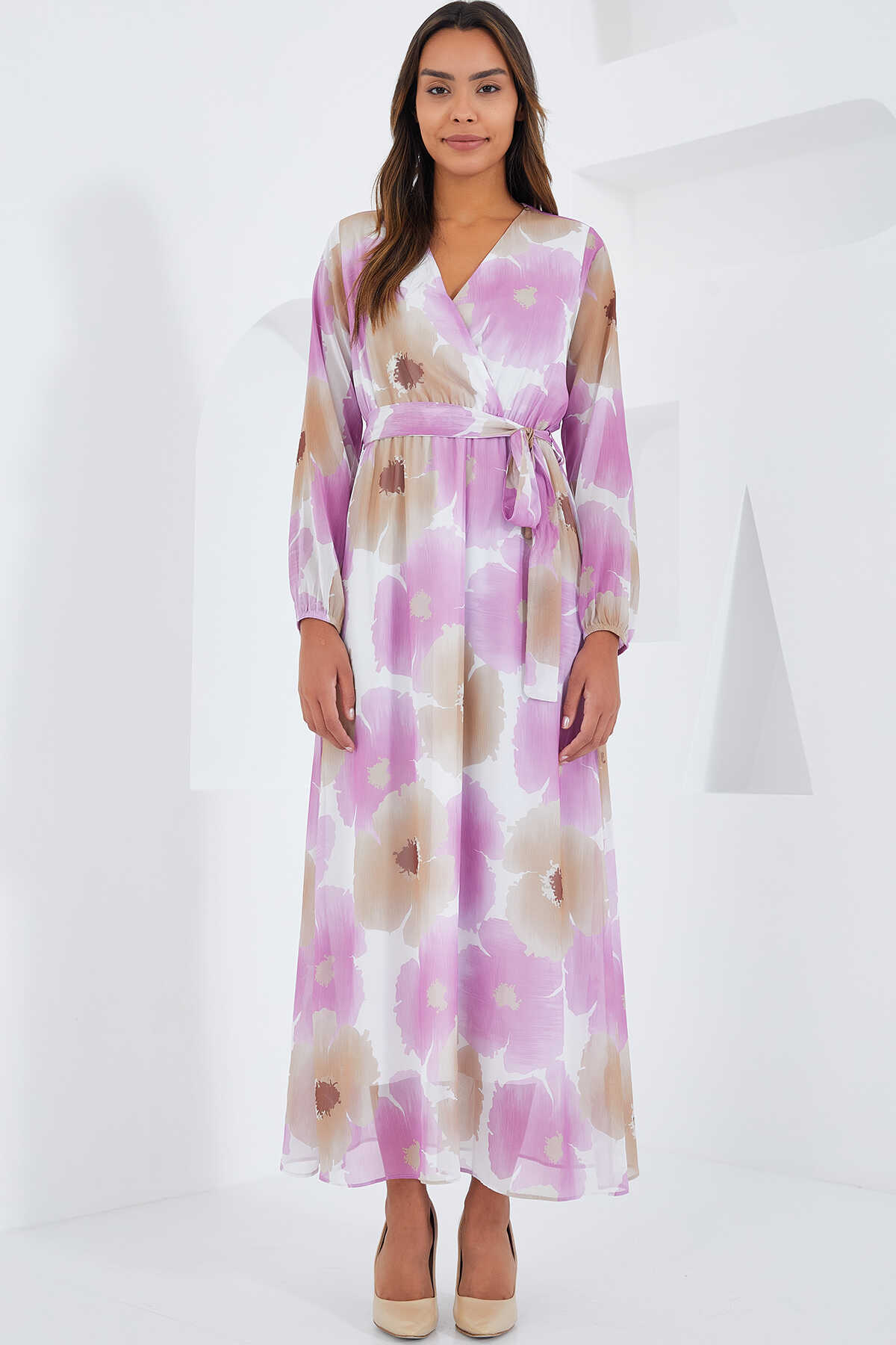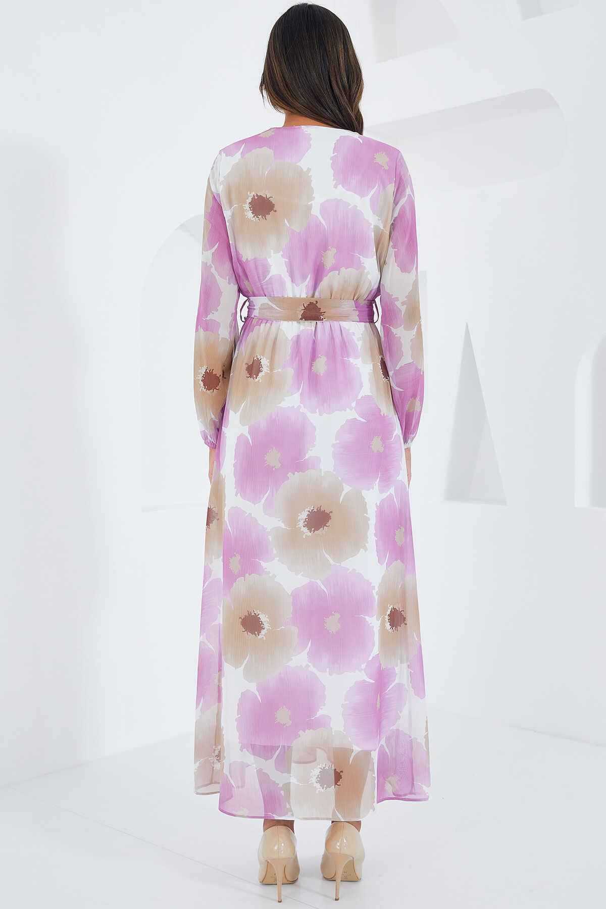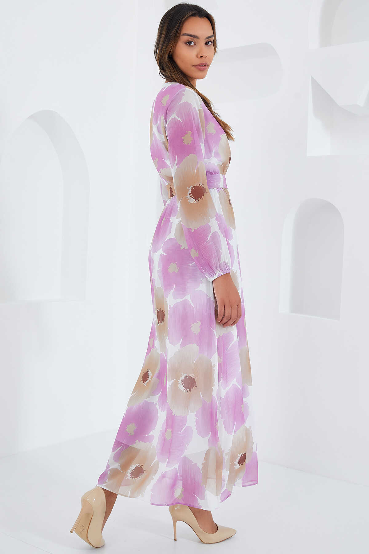 Kadın Pembe Bej Çiçek Desenli Şifon Elbise 2134