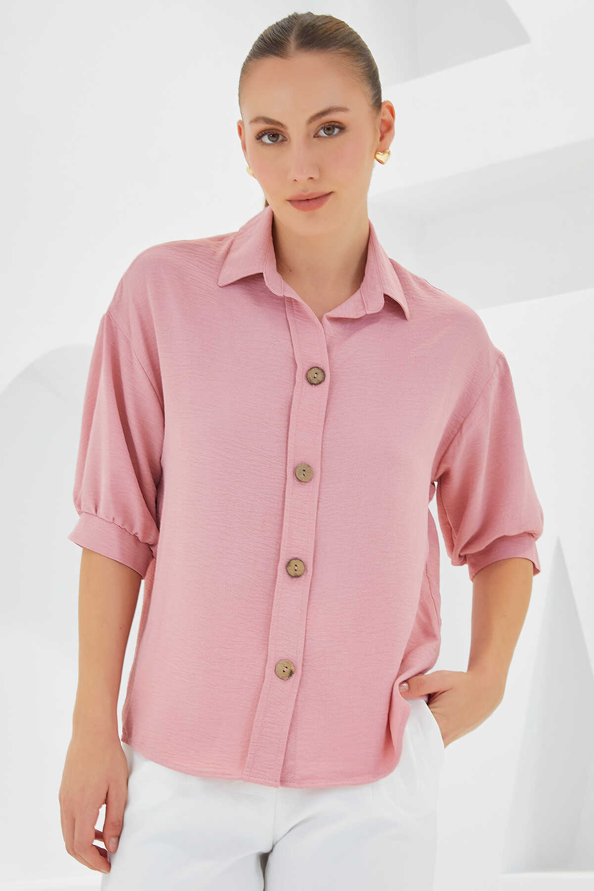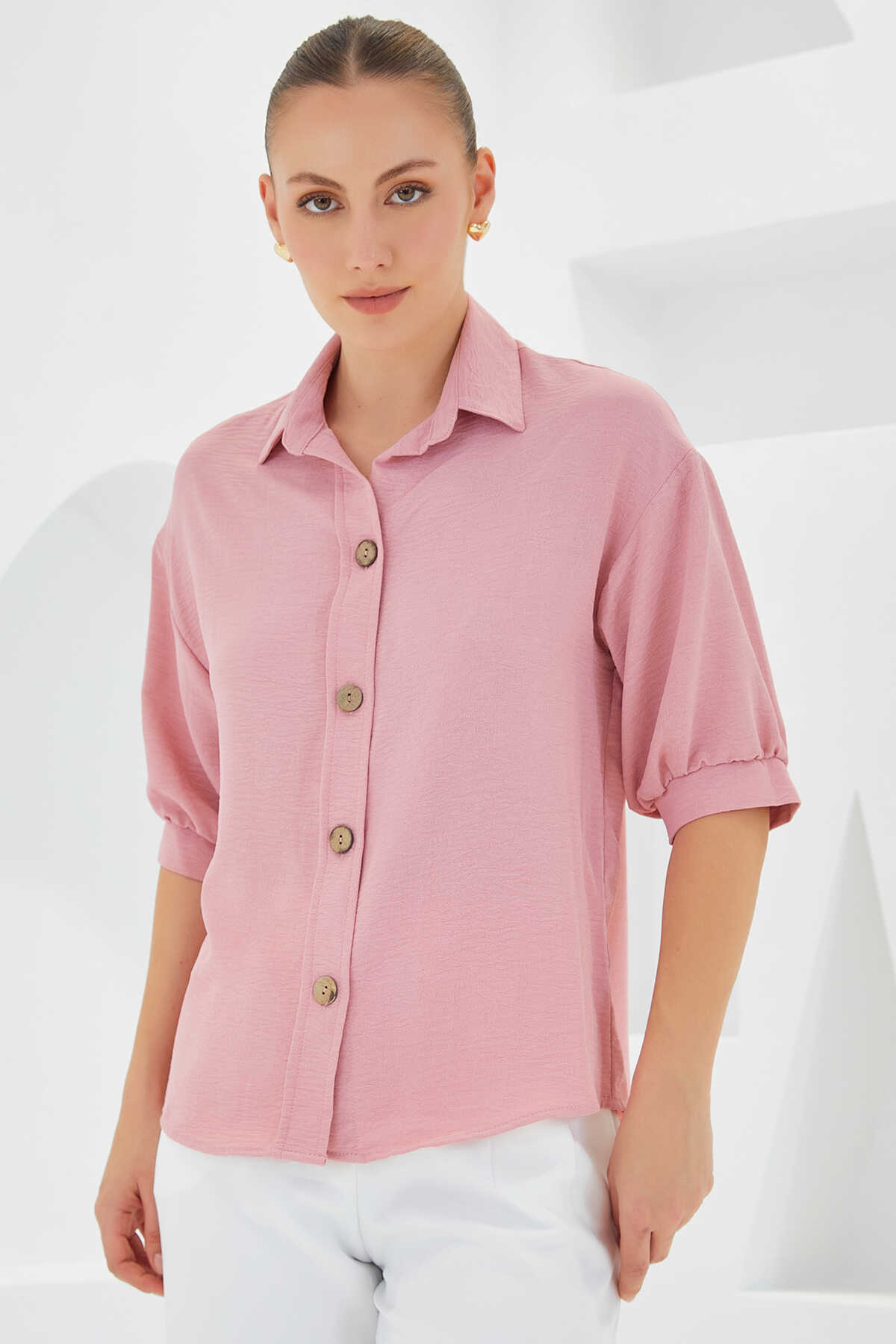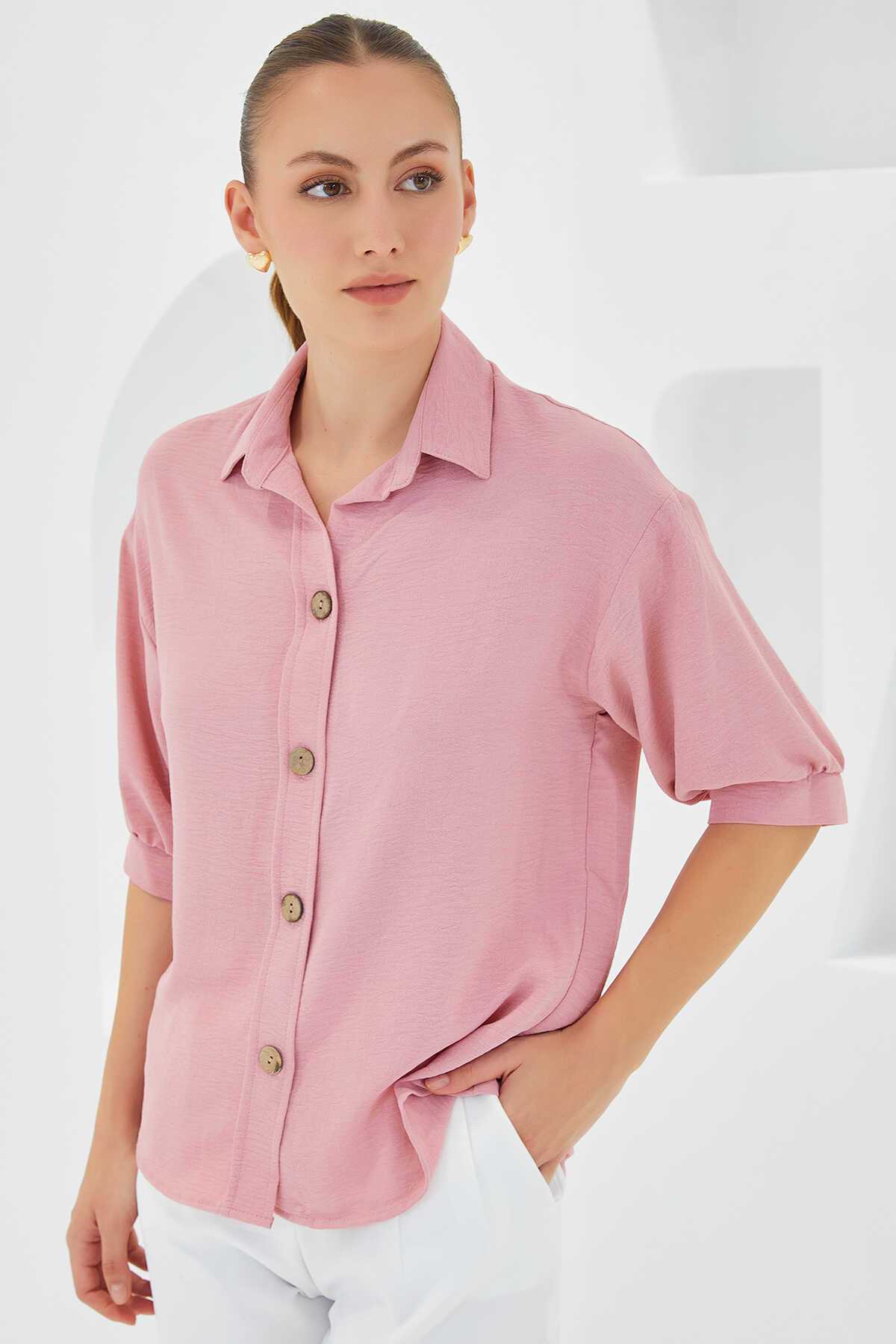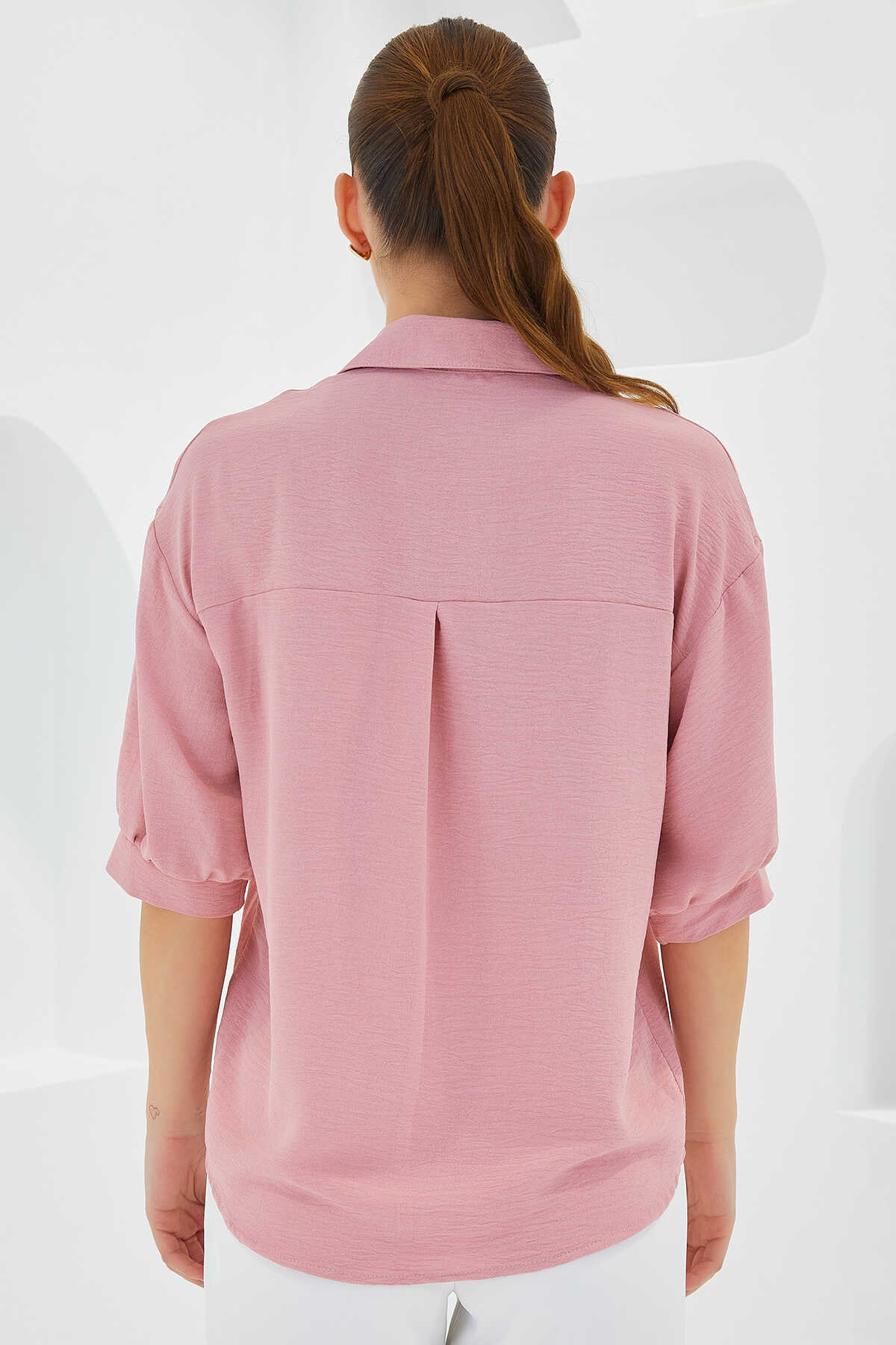 Kadın Pembe Kısa Kol Oversize Keten Gömlek 20240 - Kombin