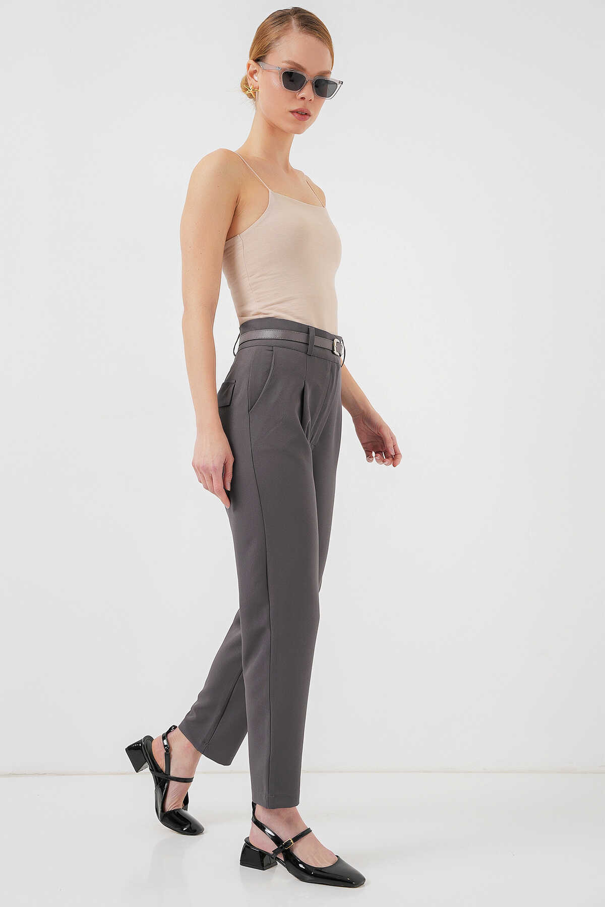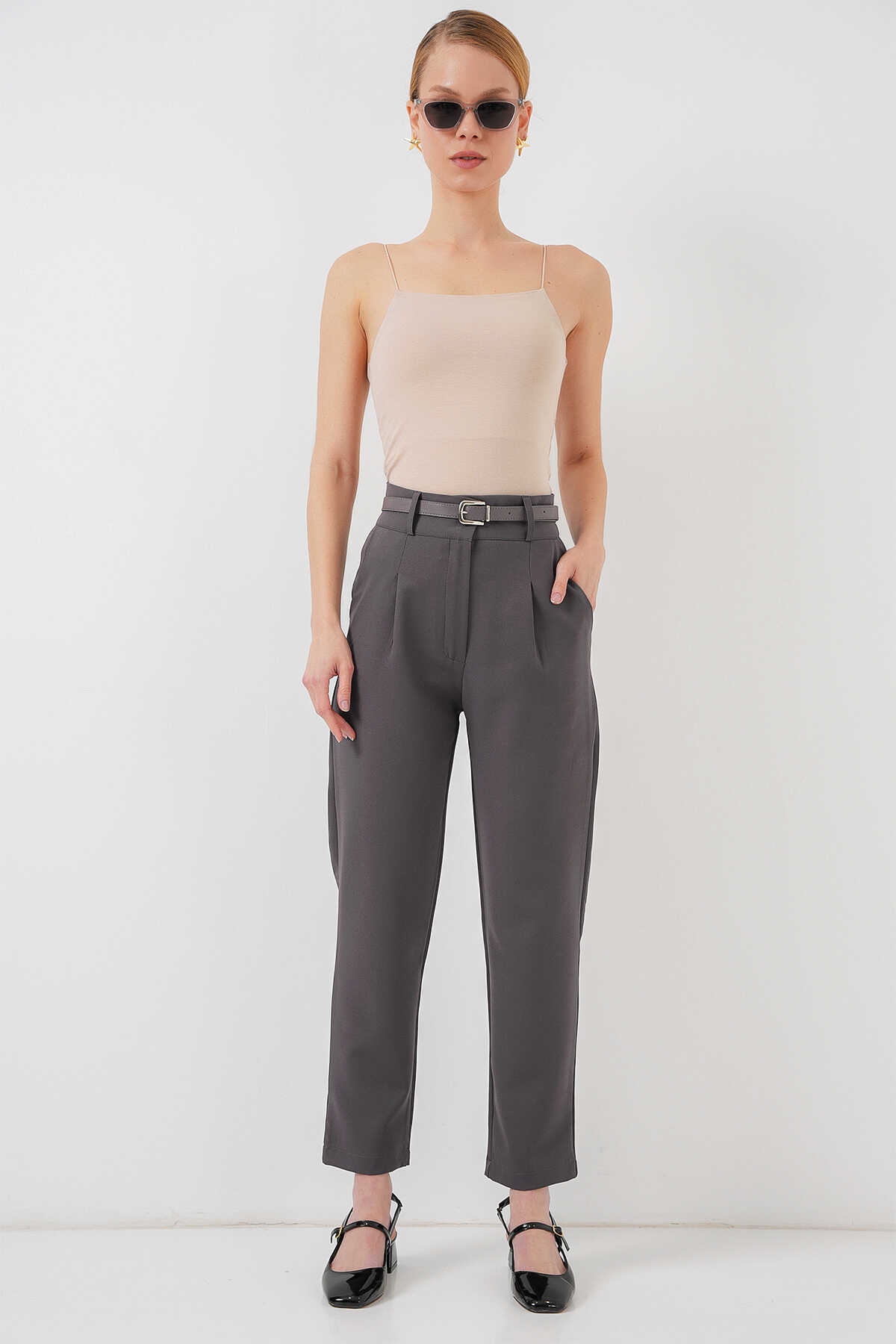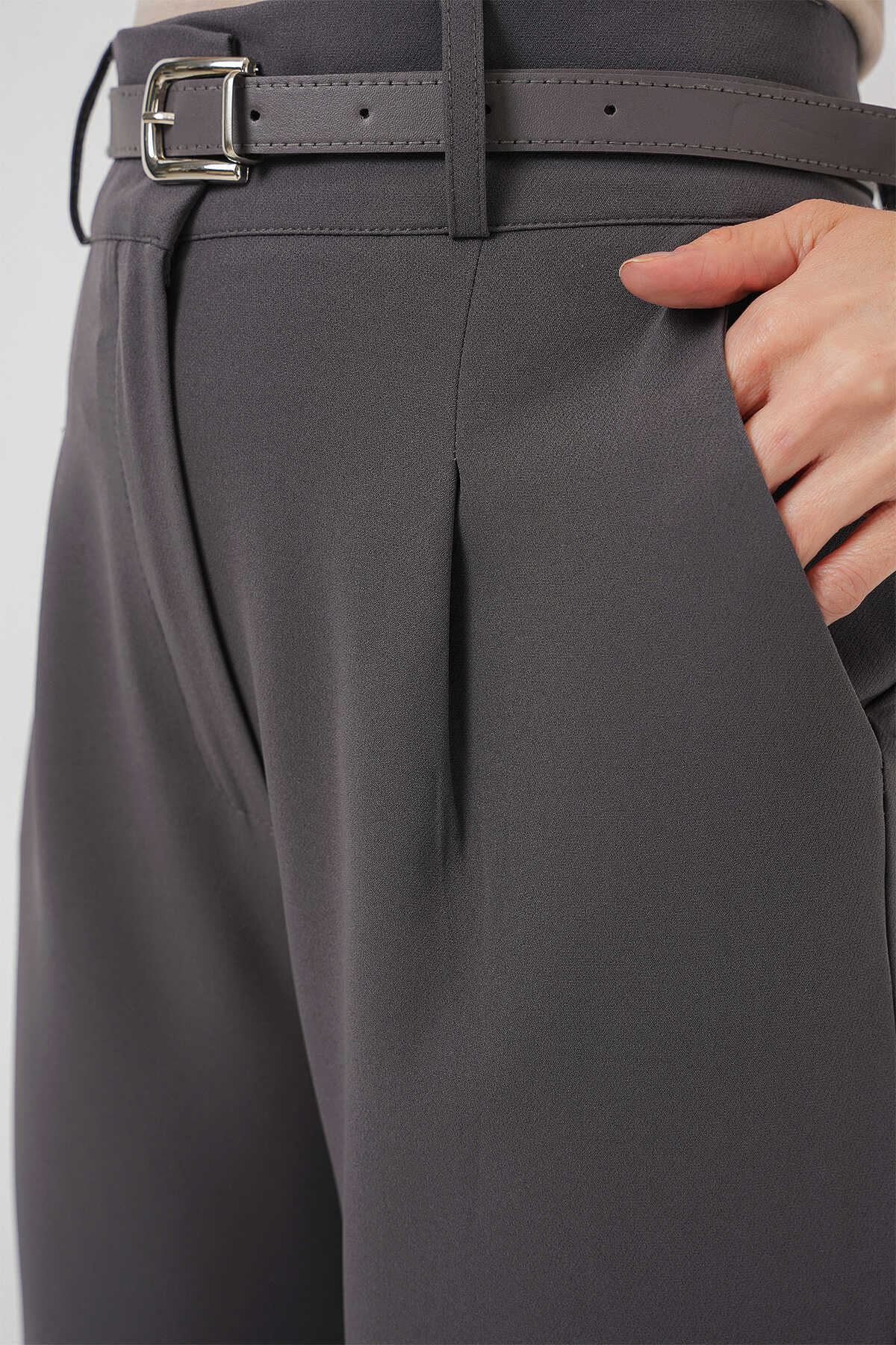 Kadın Pileli Kemerli Kumaş Pantolon 6725 - Antrasit - Kombin