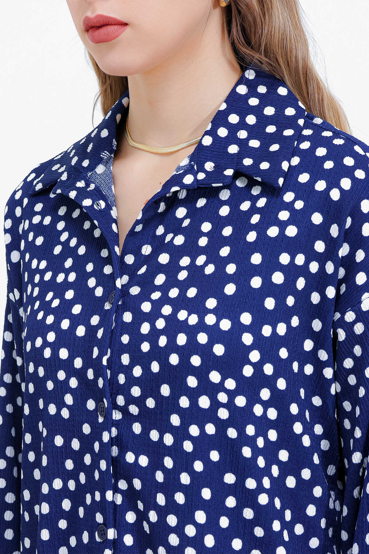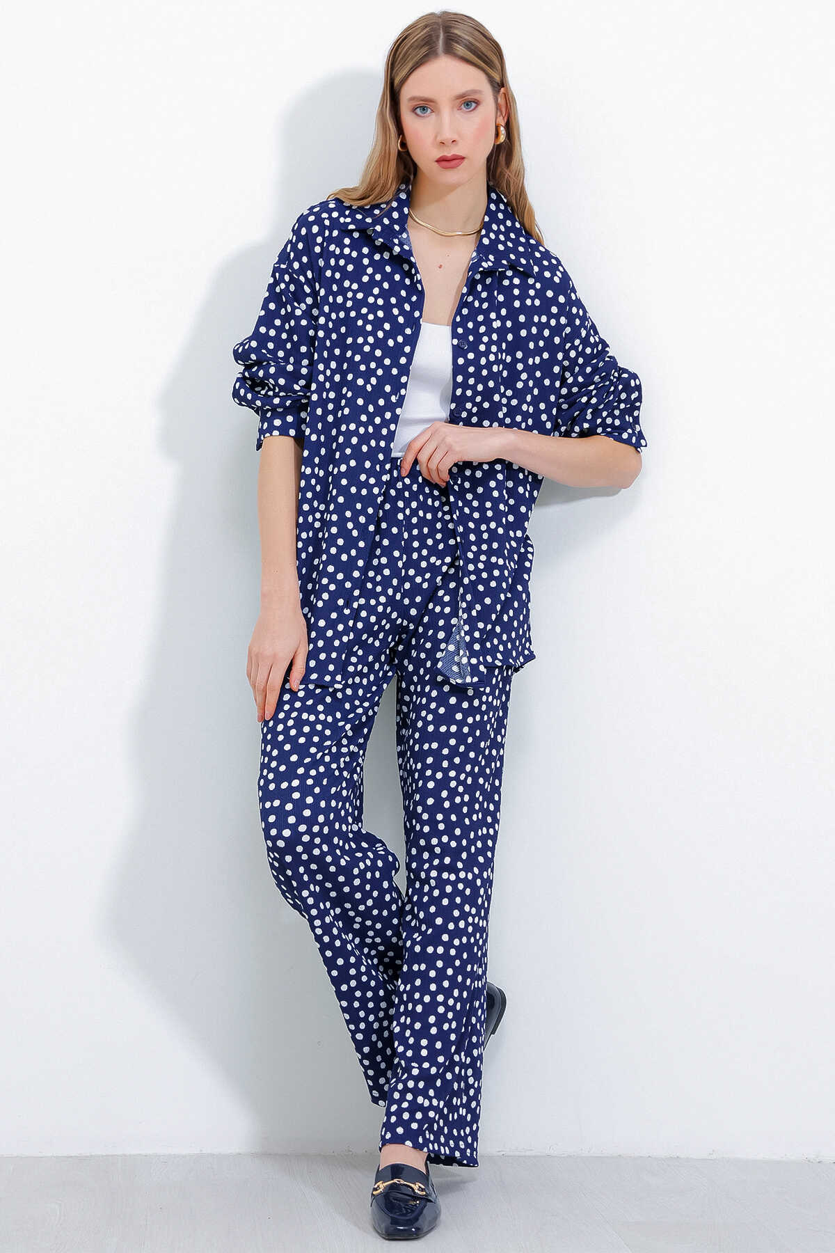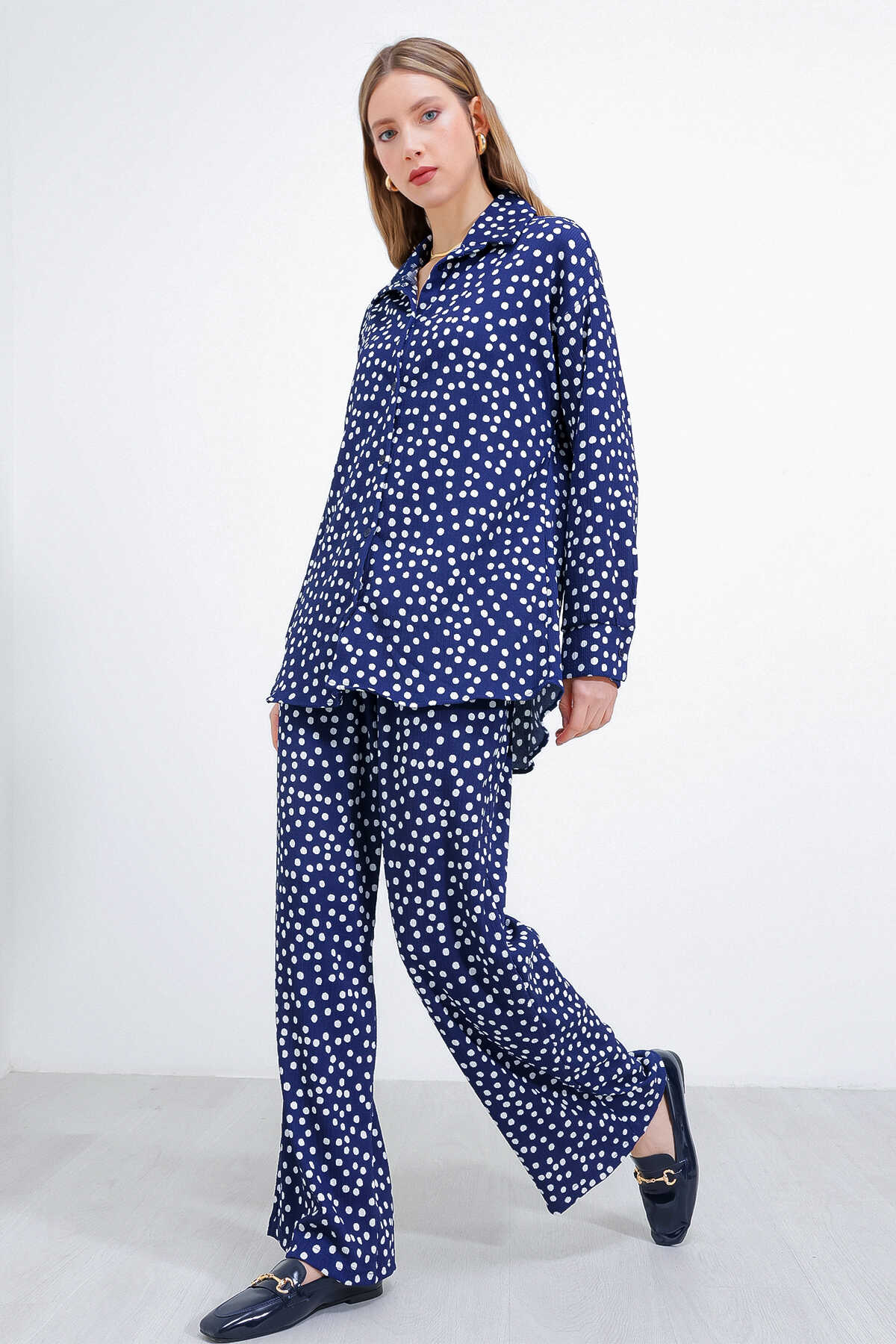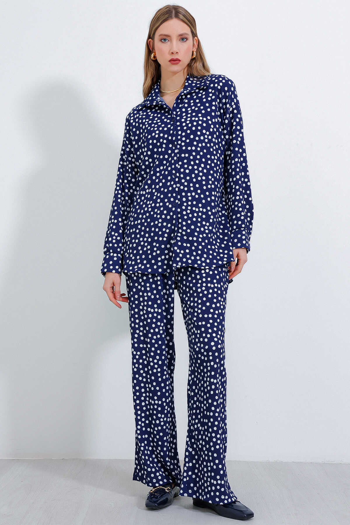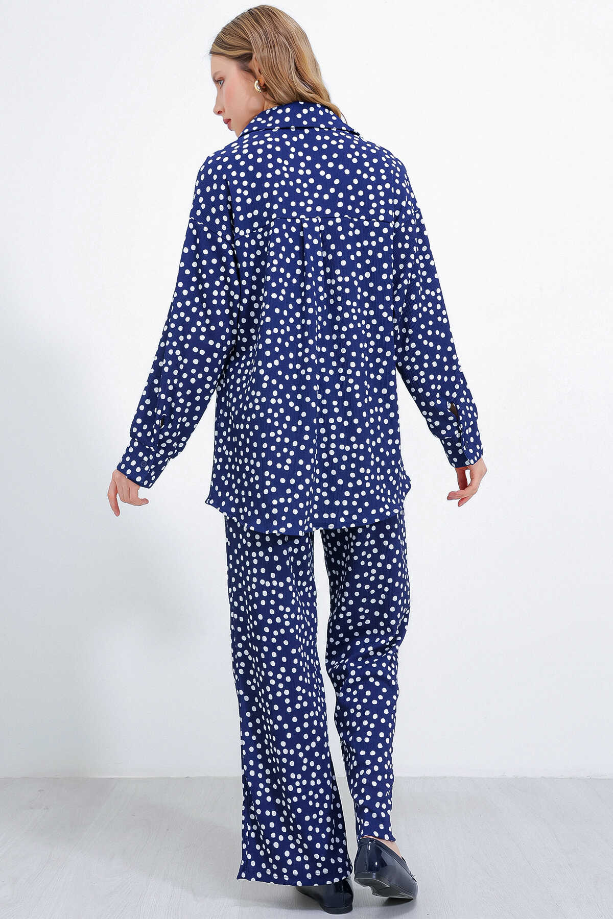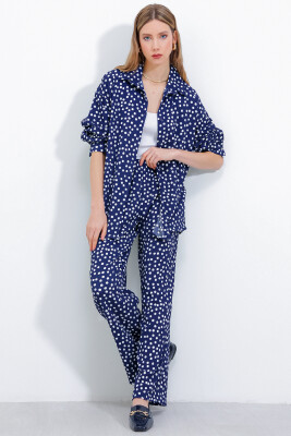 Kadın Puantiyeli Lacivert Ekru Örme İkili Takım 5858 - Kombin