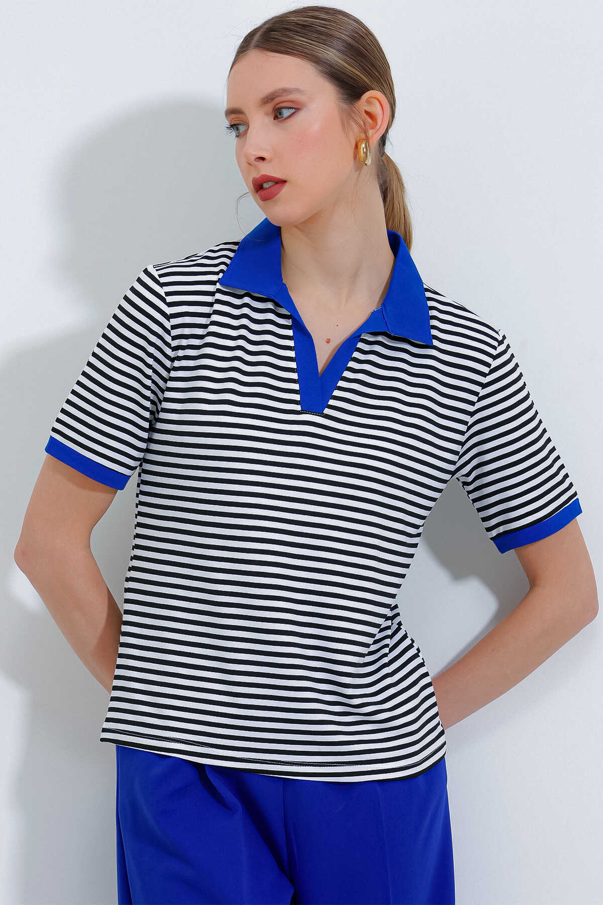 Kadın Saks Polo Yaka Çizgili Tişört 0499 - Kombin
