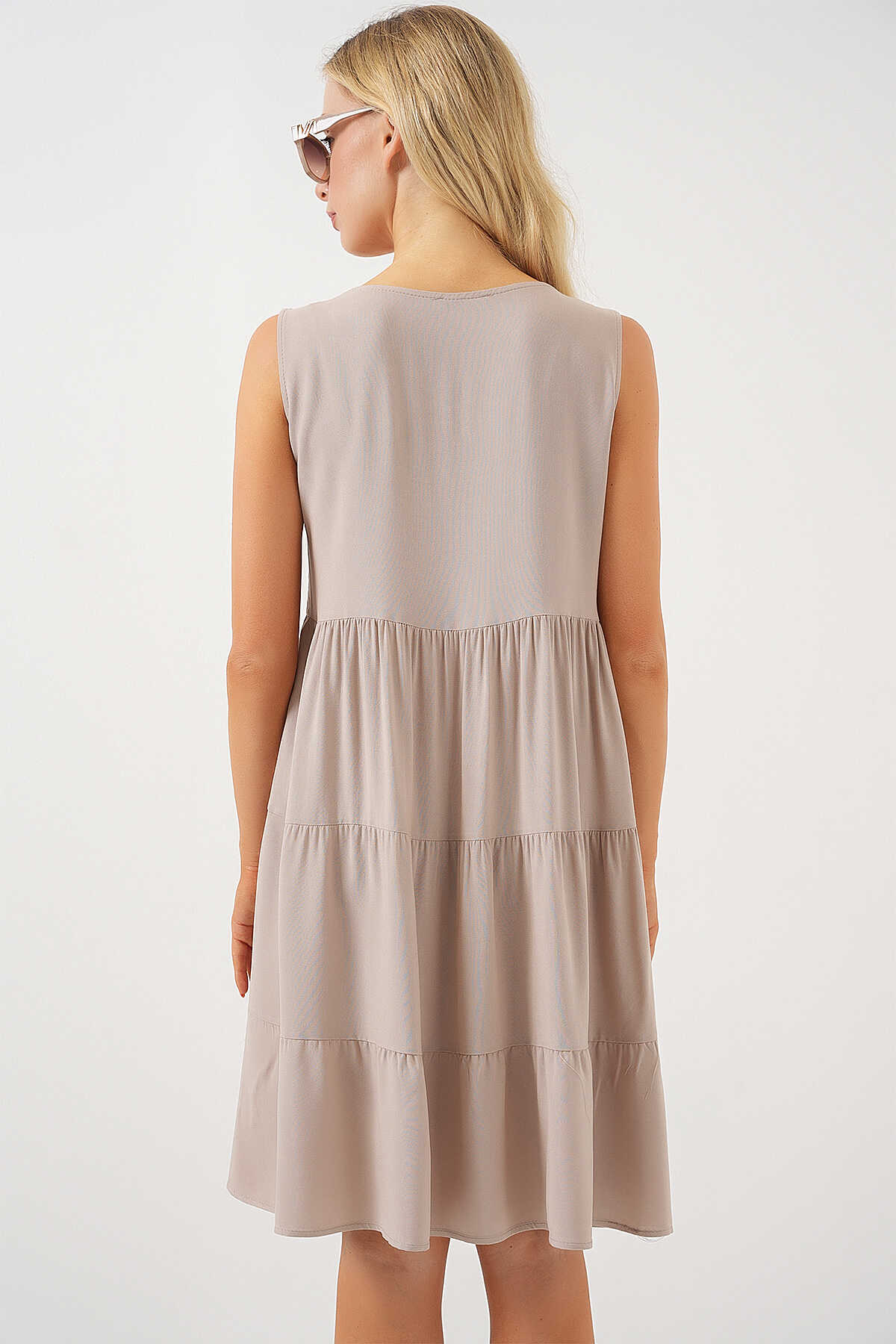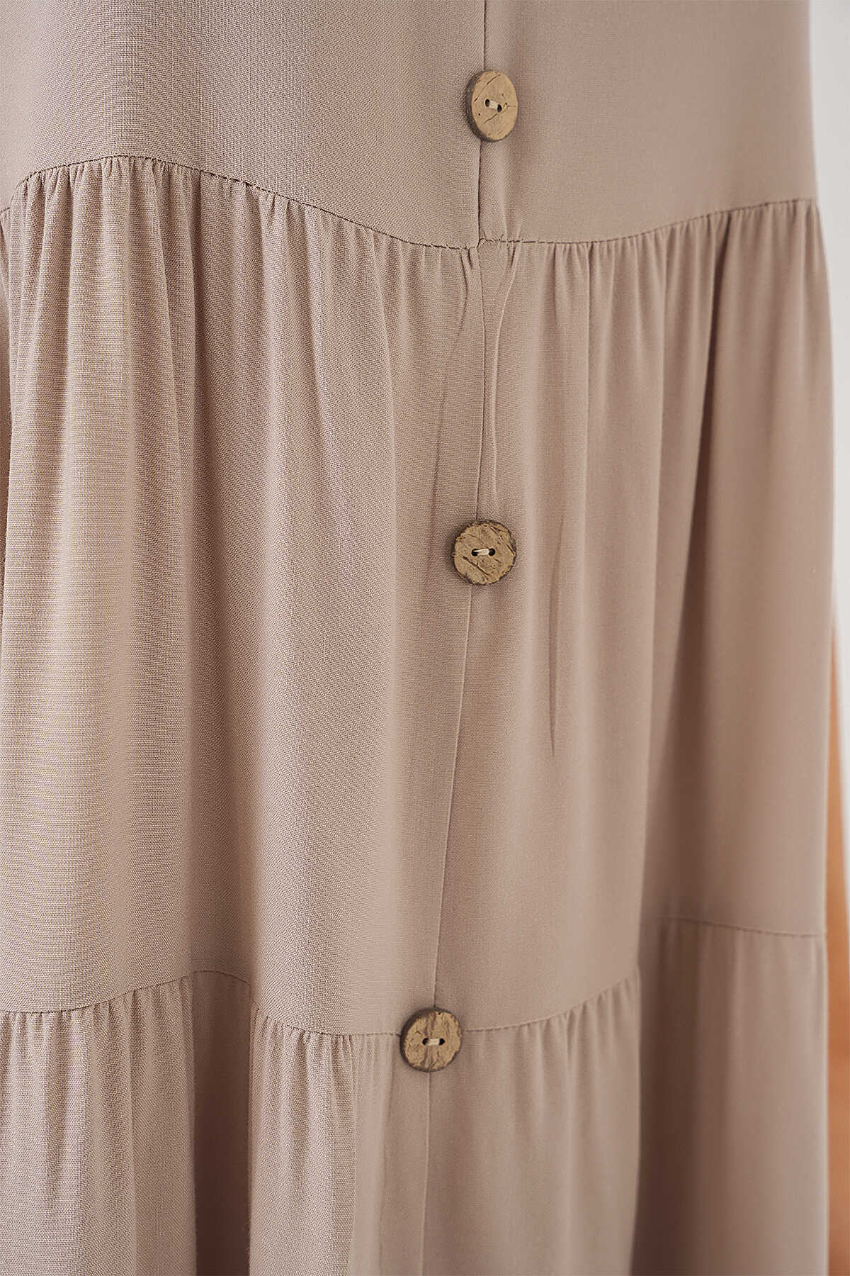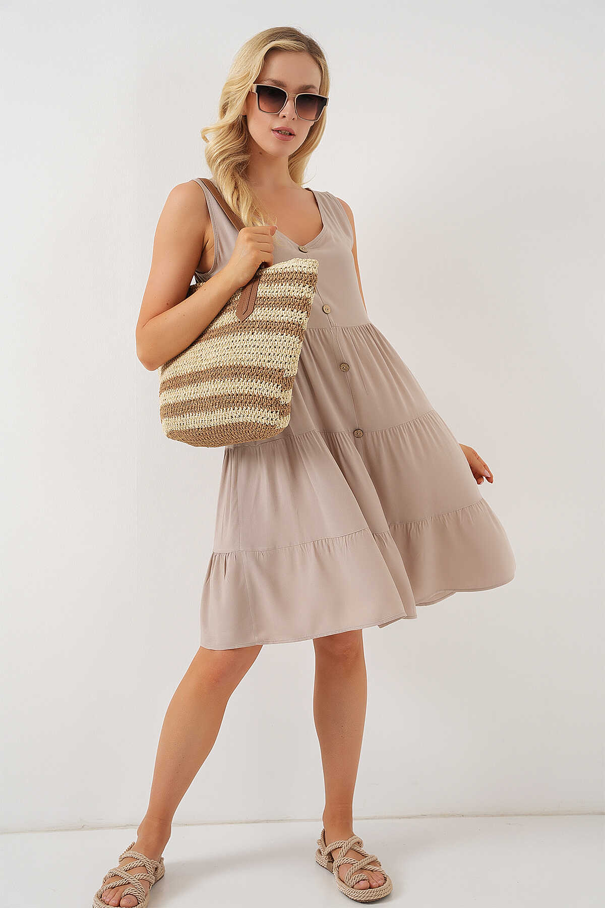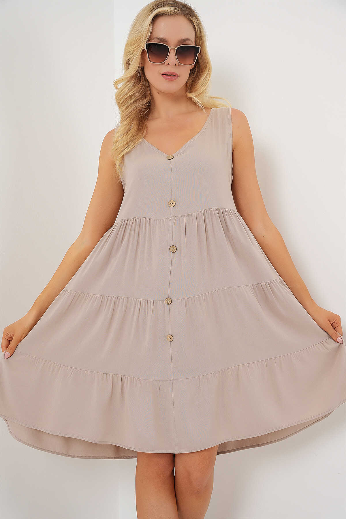 Kadın Sıfır Kol Düğmeli Kısa Elbise 2571 - Taş - Kombin