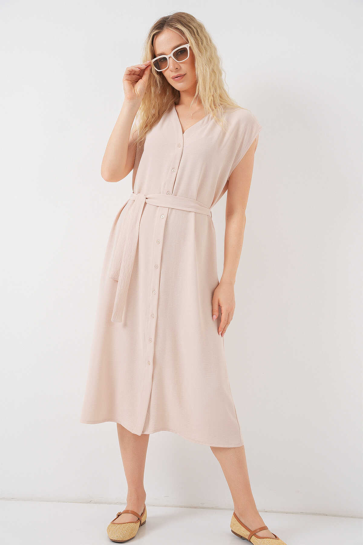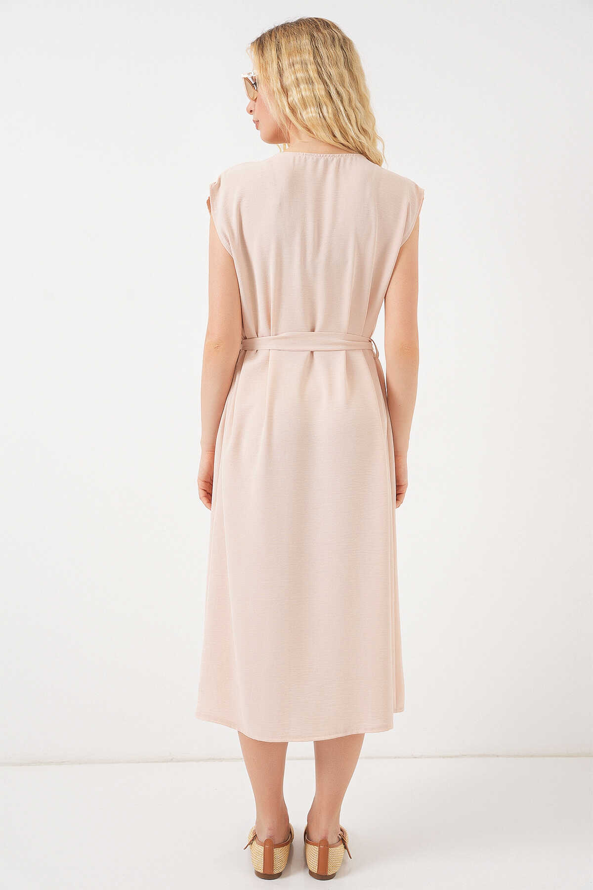 Kadın Sıfır Kol Kuşaklı Ayrobin Elbise 2568 - Krem