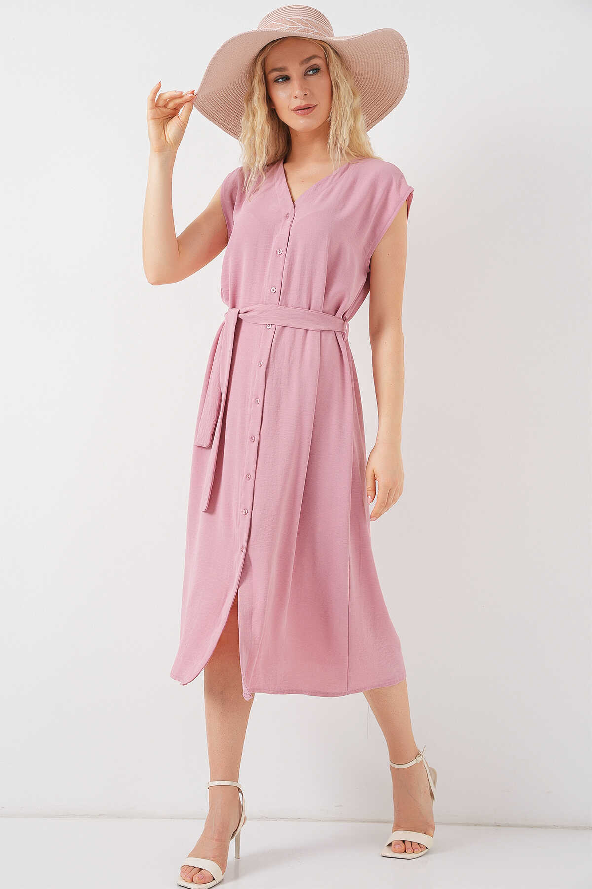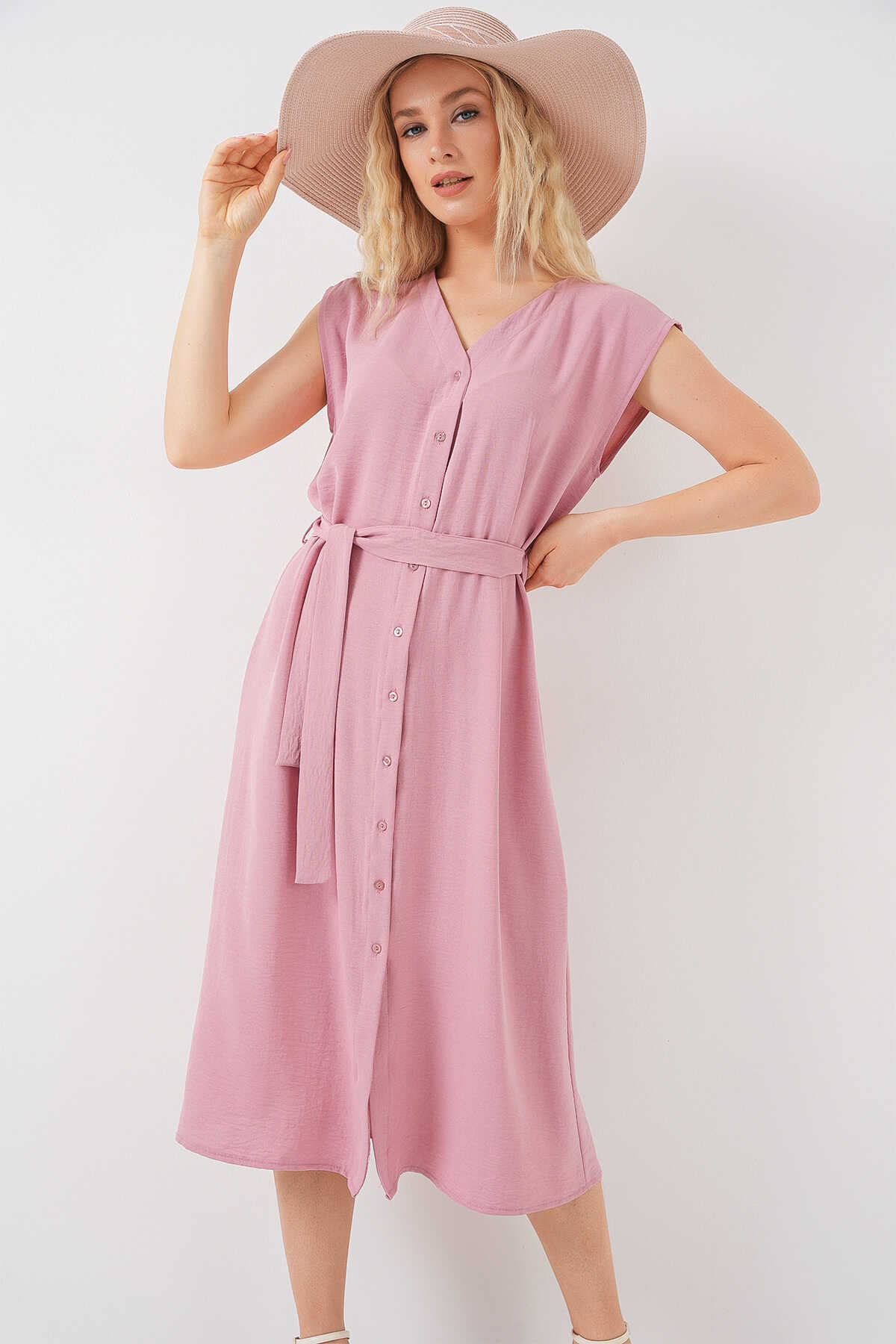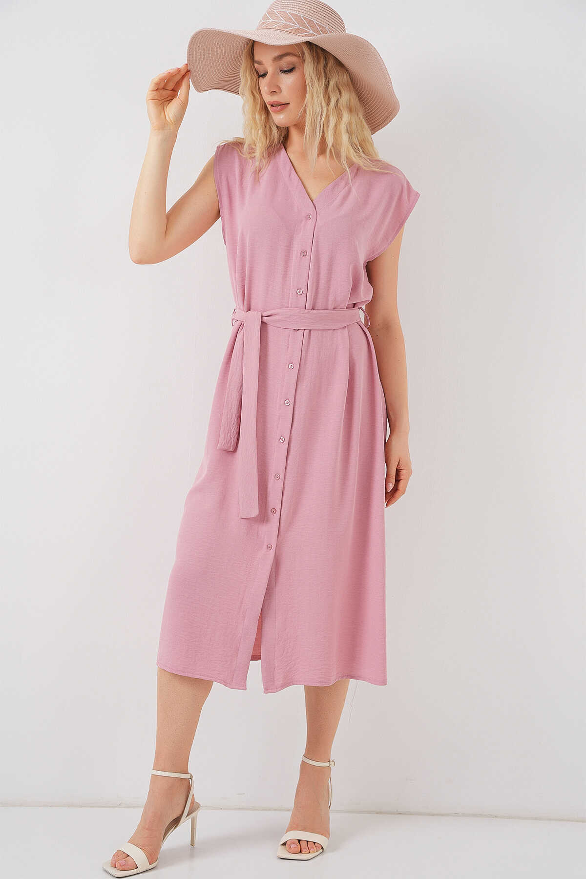 Kadın Sıfır Kol Kuşaklı Ayrobin Elbise 2568 - Pudra - Kombin