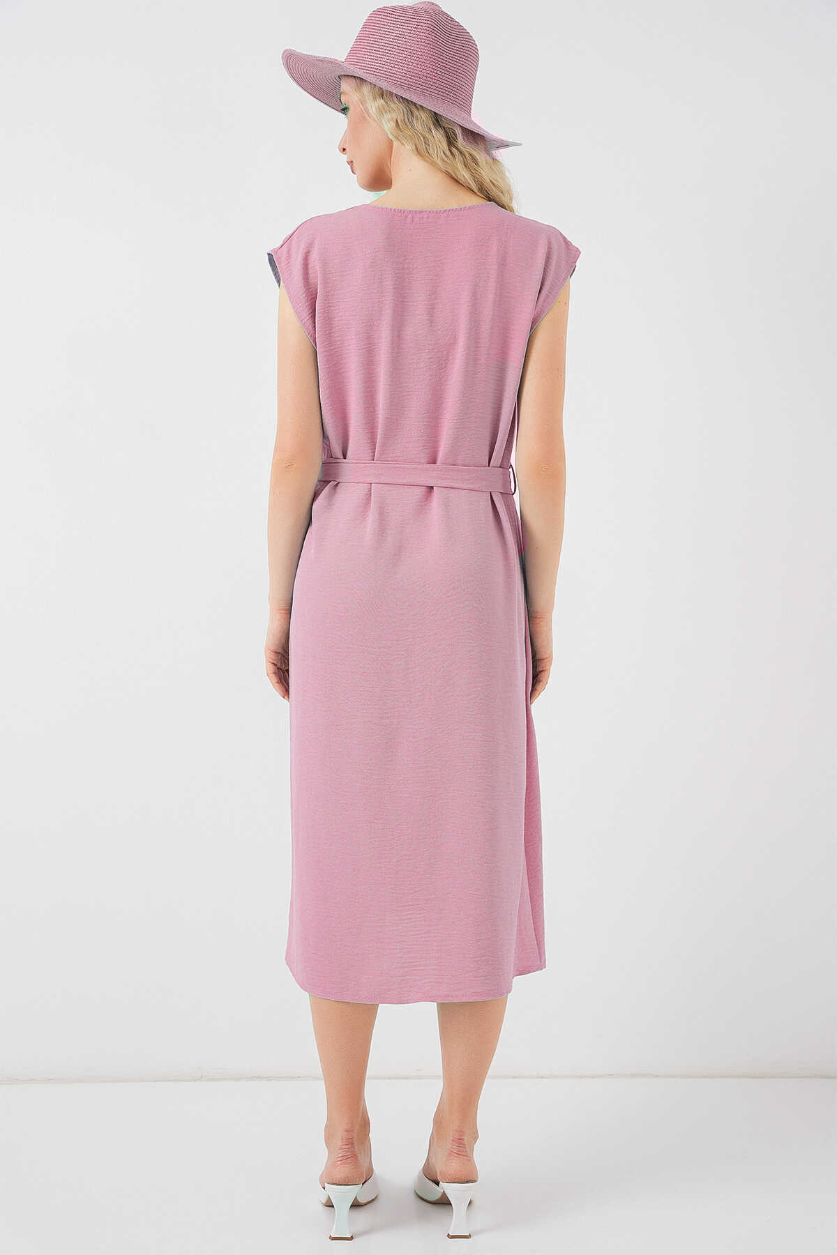 Kadın Sıfır Kol Kuşaklı Ayrobin Elbise 2568 - Pudra