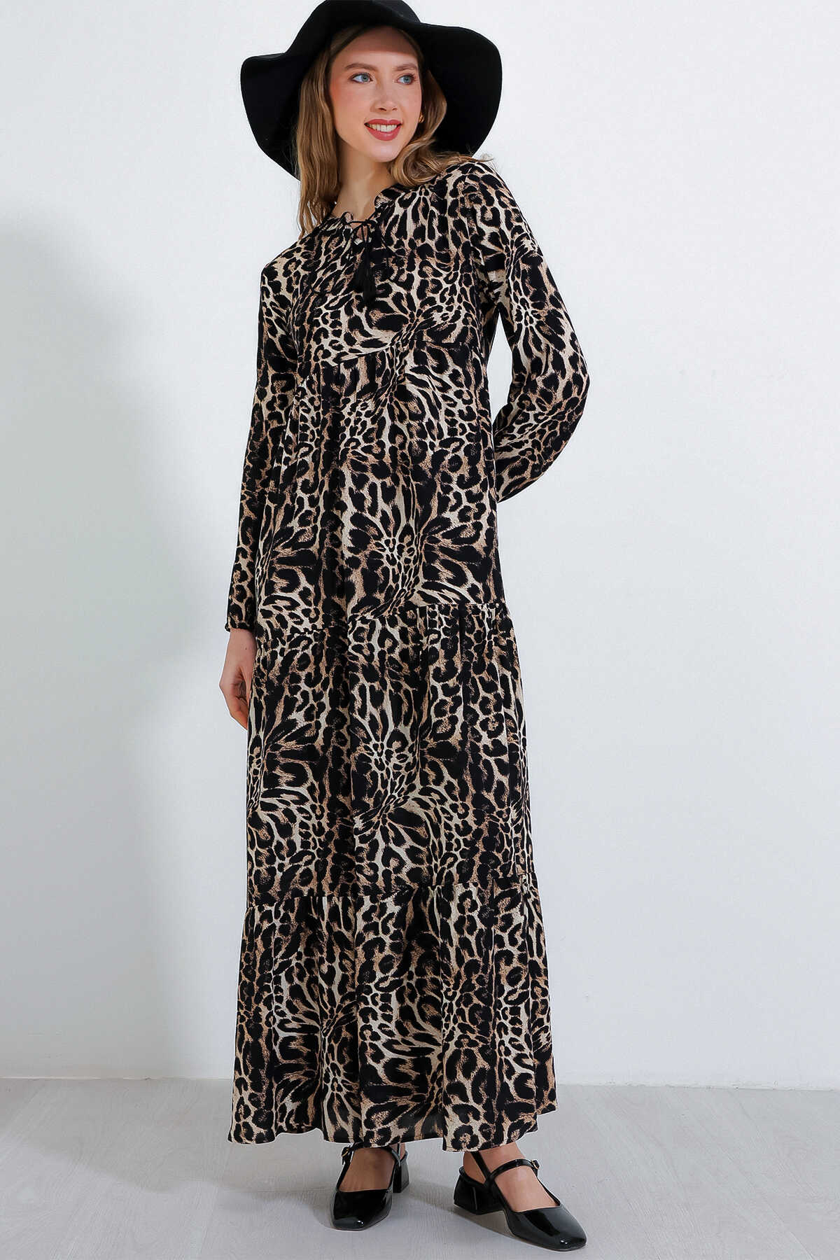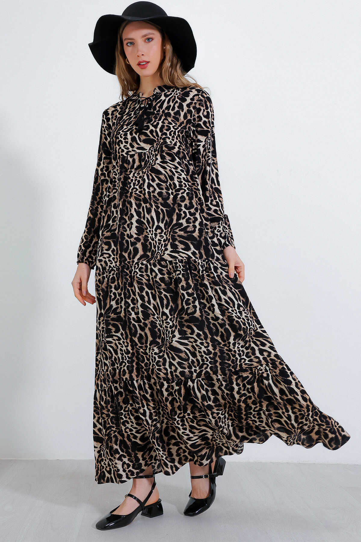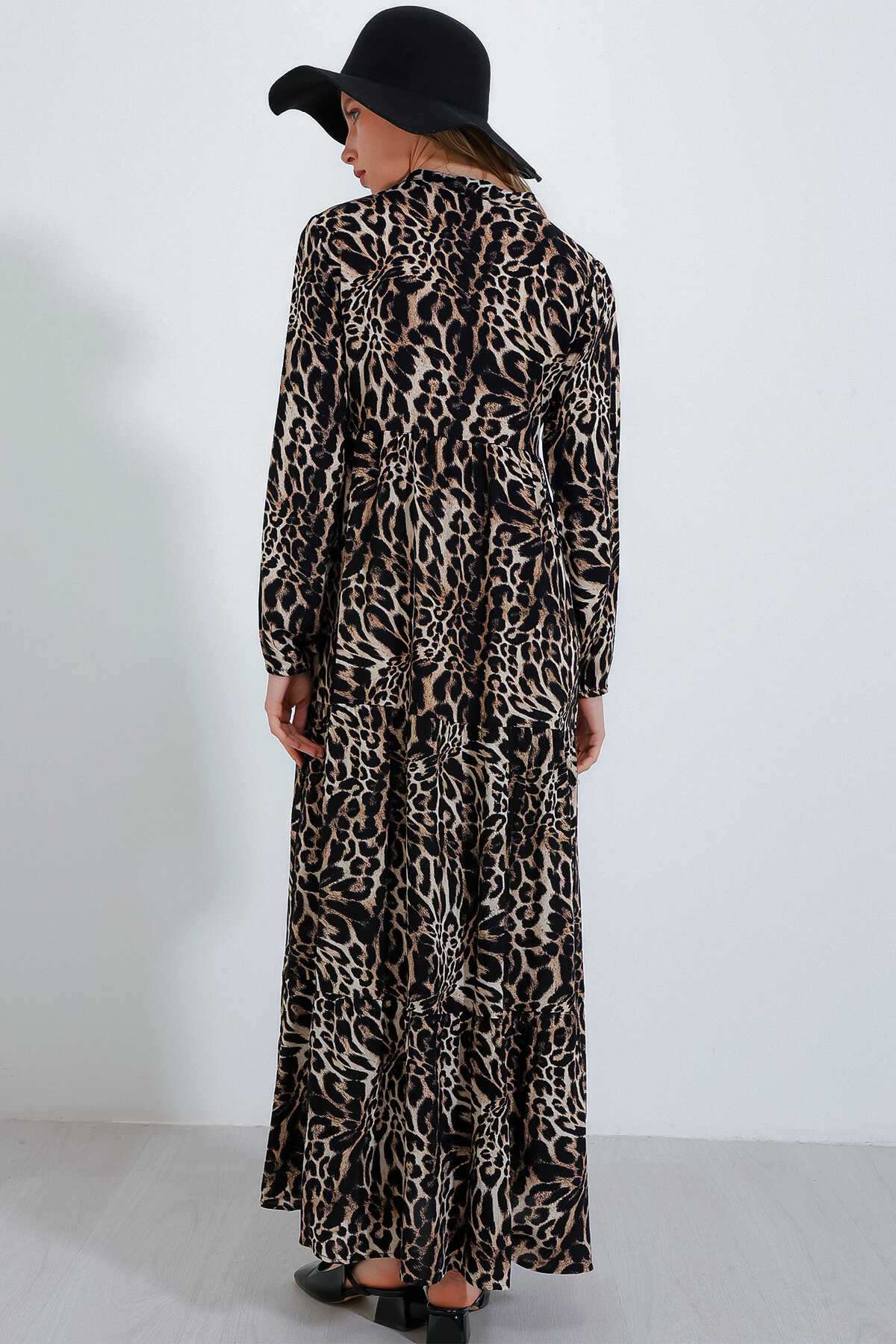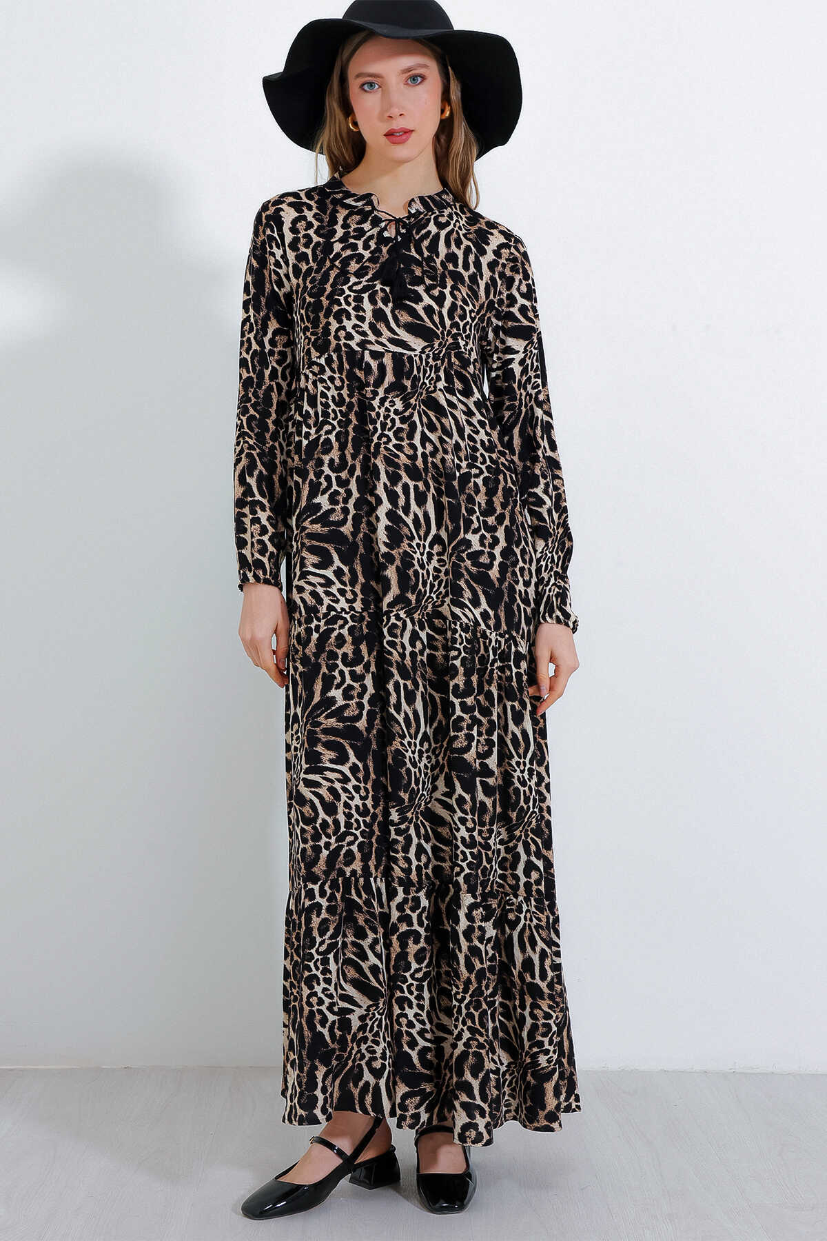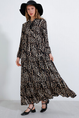 Kadın Siyah Kahverengi Yaka Bağcıklı Viskon Boydan Tesettür Elbise 1627
