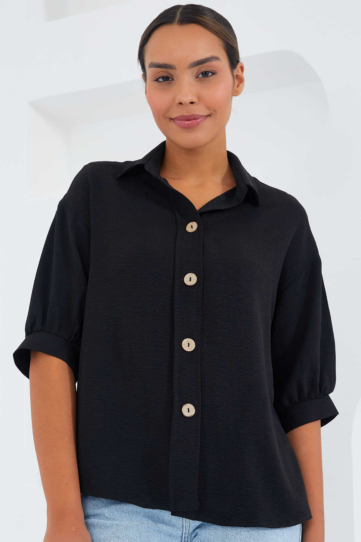 Kadın Siyah Kısa Kol Oversize Keten Gömlek 20240 - Kombin