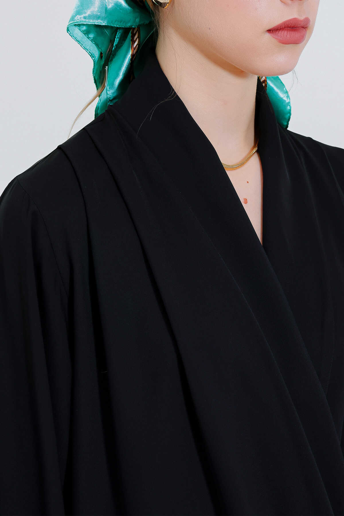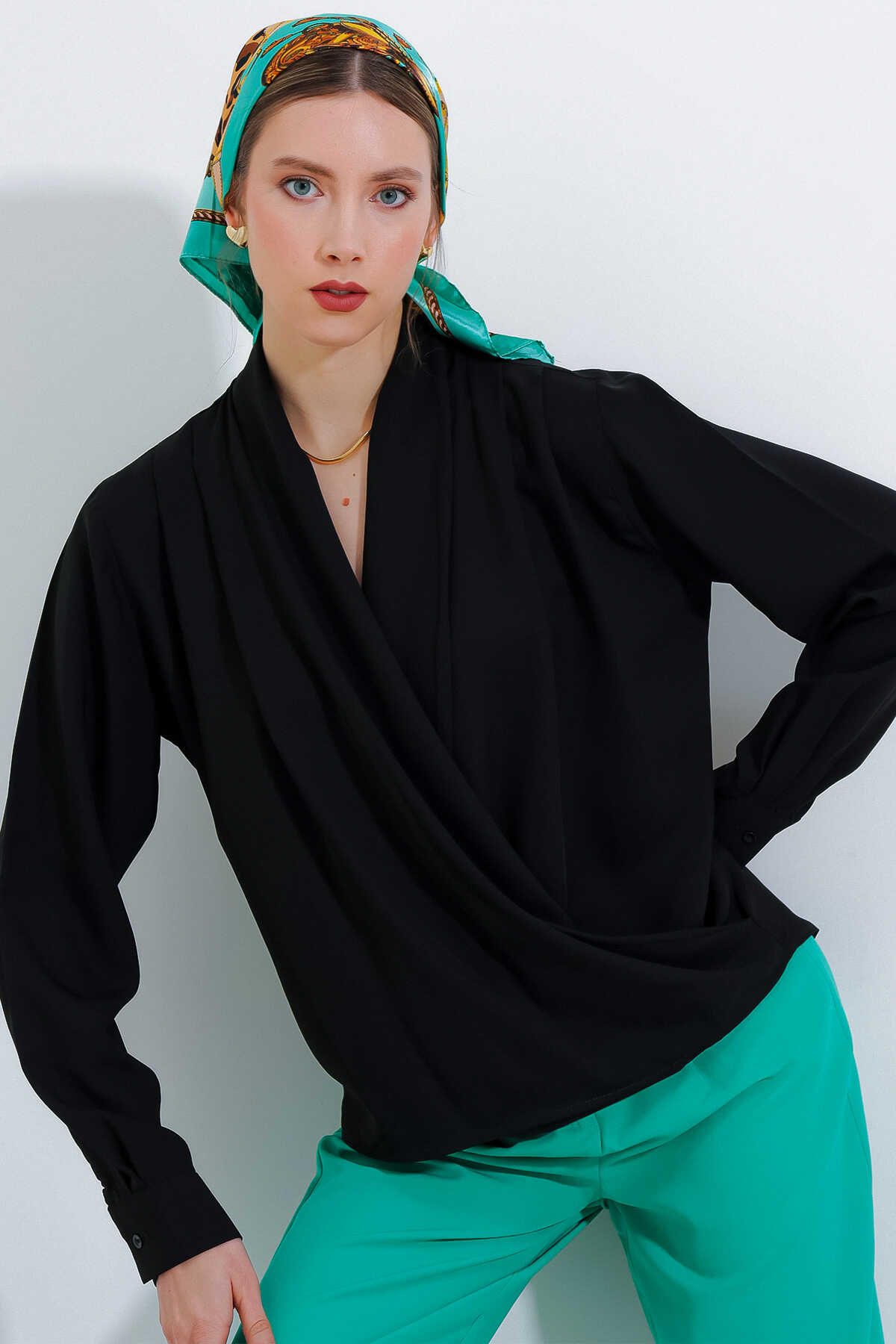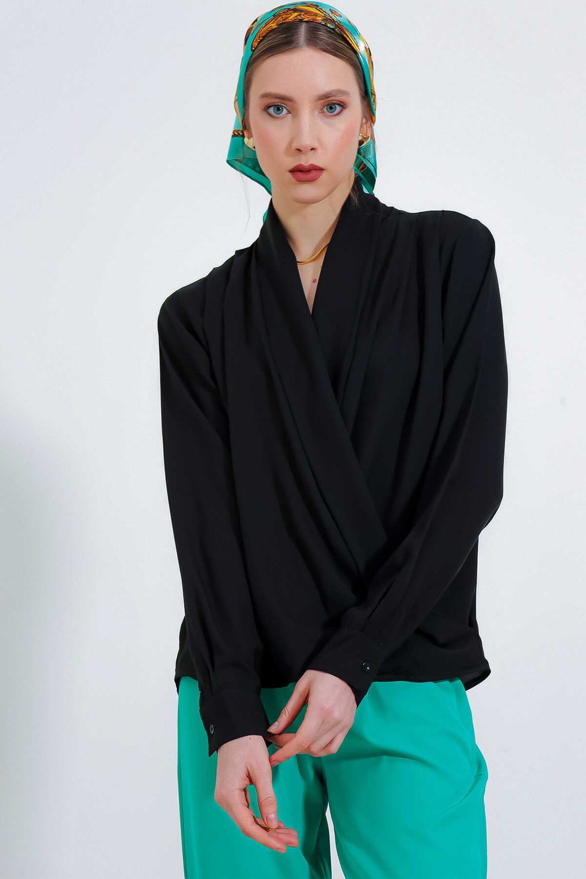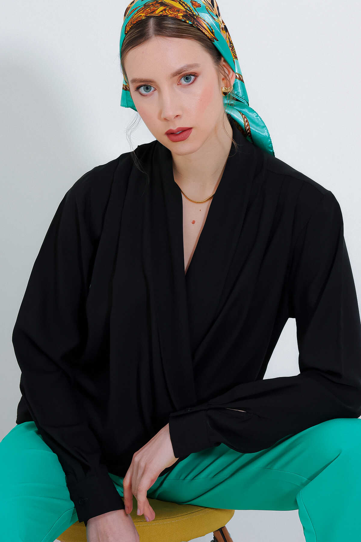 Kadın Siyah Kruvaze Yaka Dökümlü Saten Bluz 0492 - Kombin